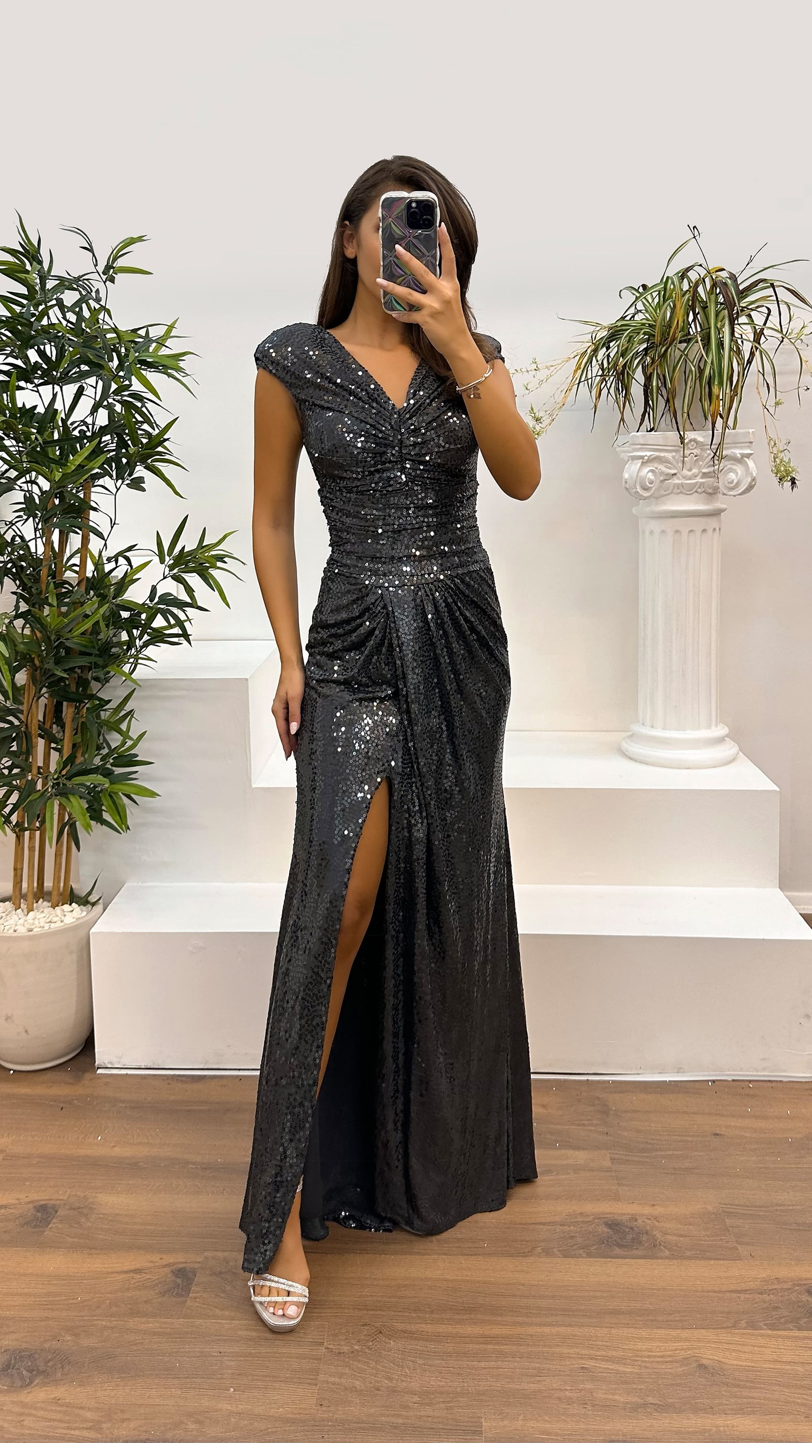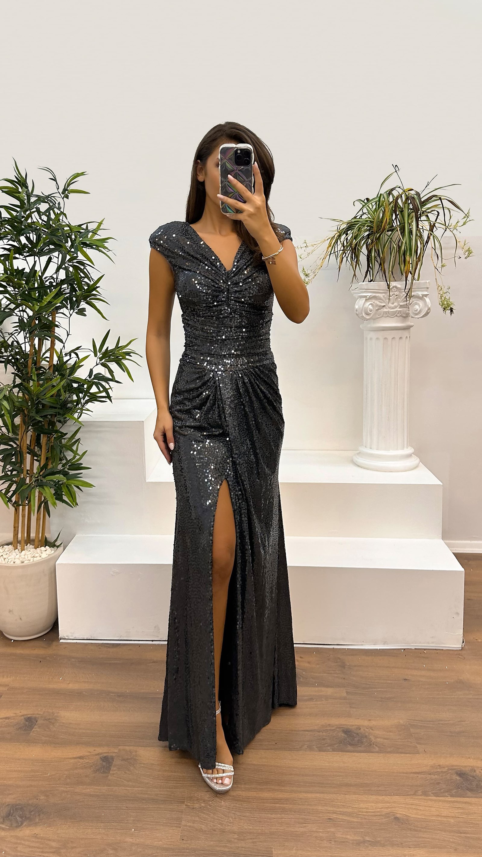 • Antrasit V Yaka Pul Payet Bel Drapeli Abiye Elbise