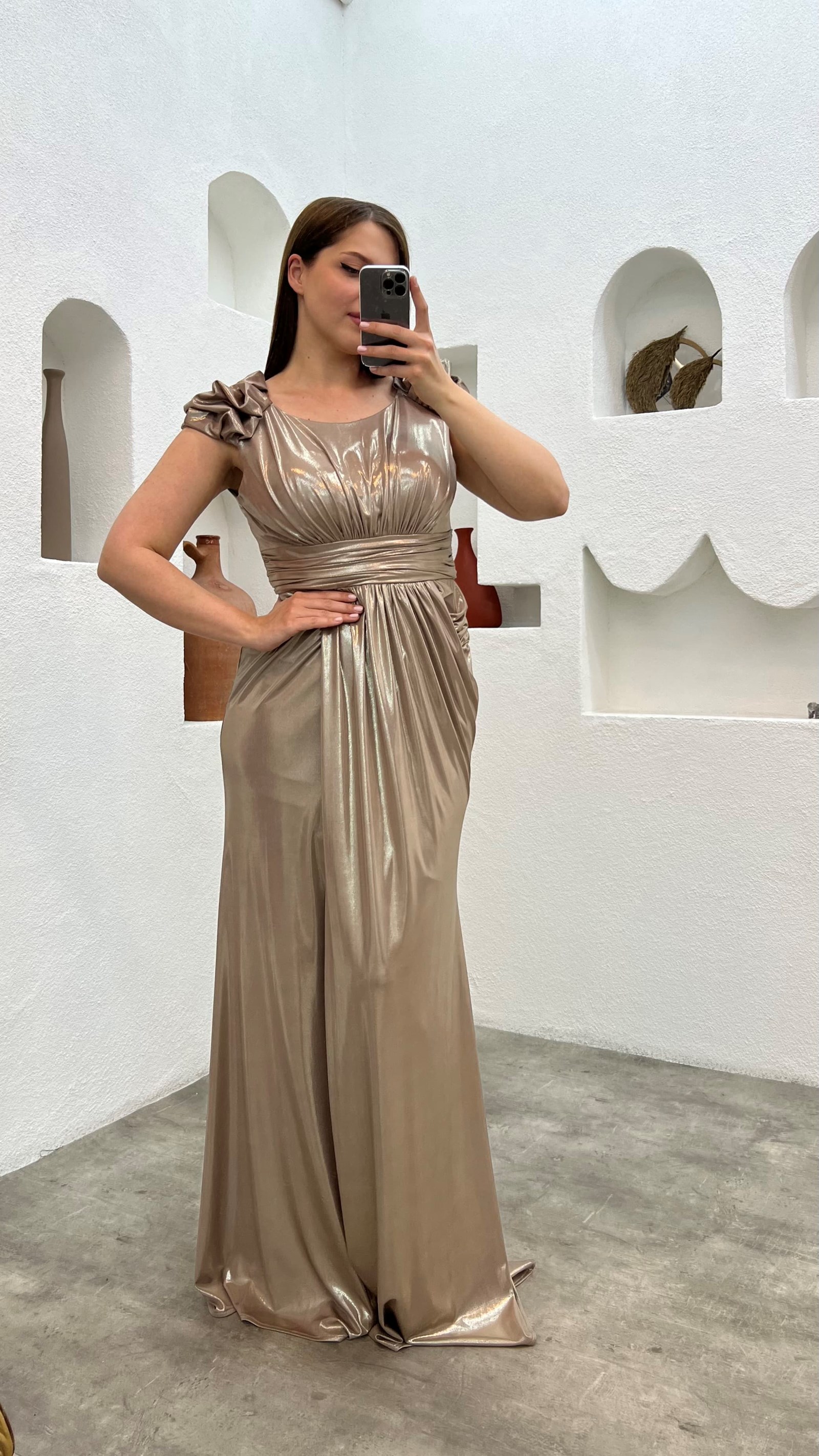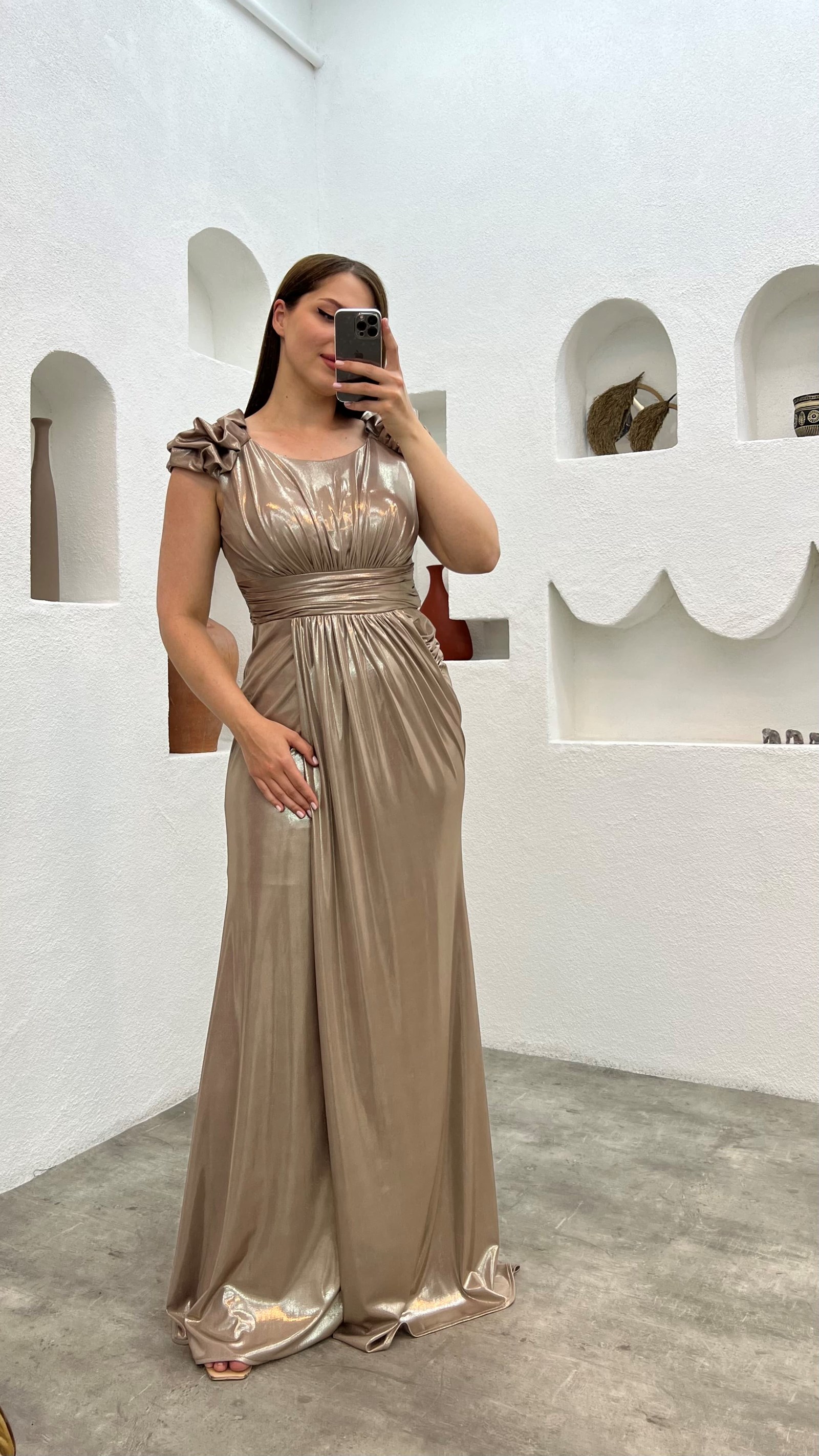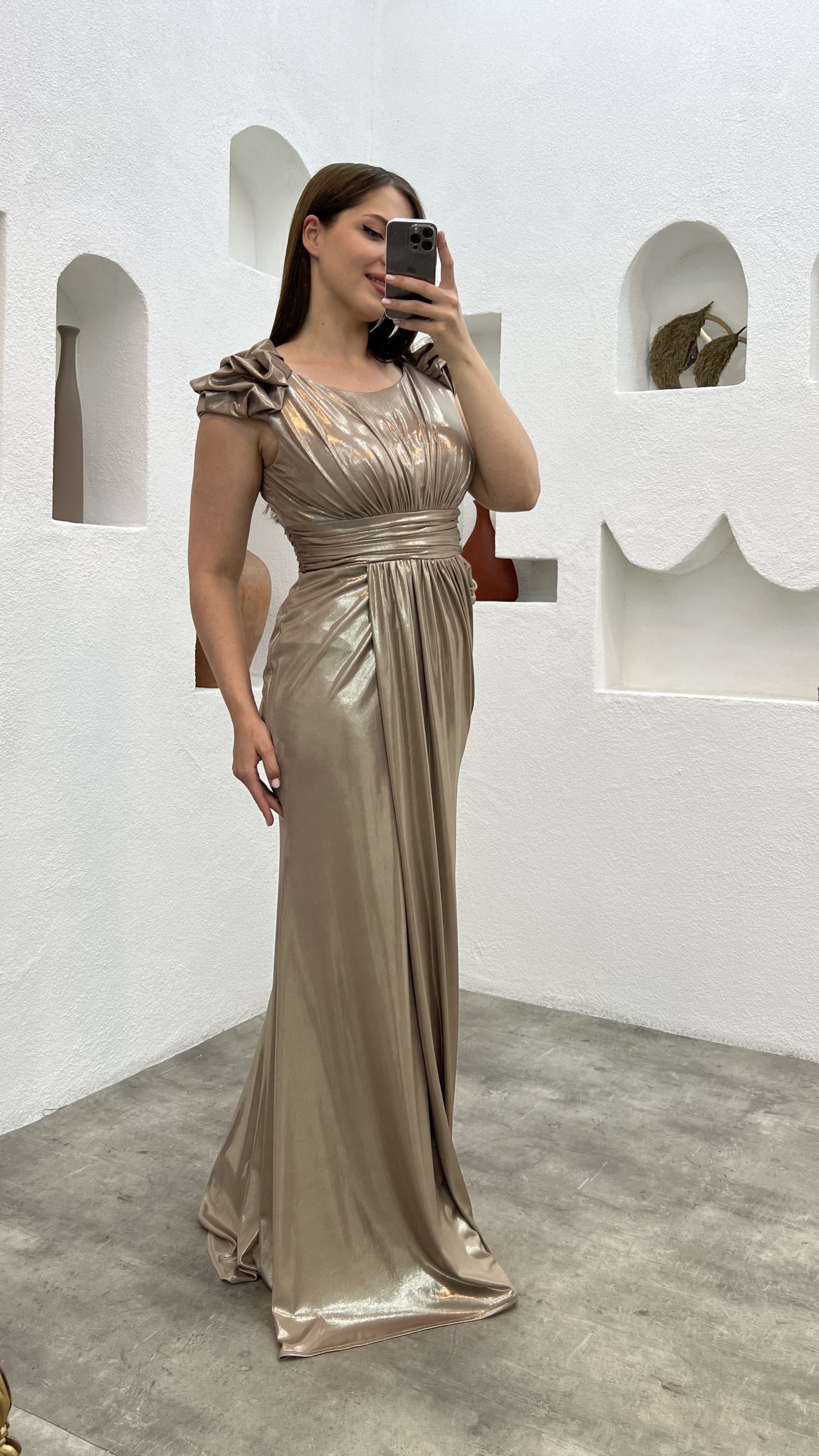 • Bej Drapeli Omuz Detay Büyük Beden Abiye Elbise
