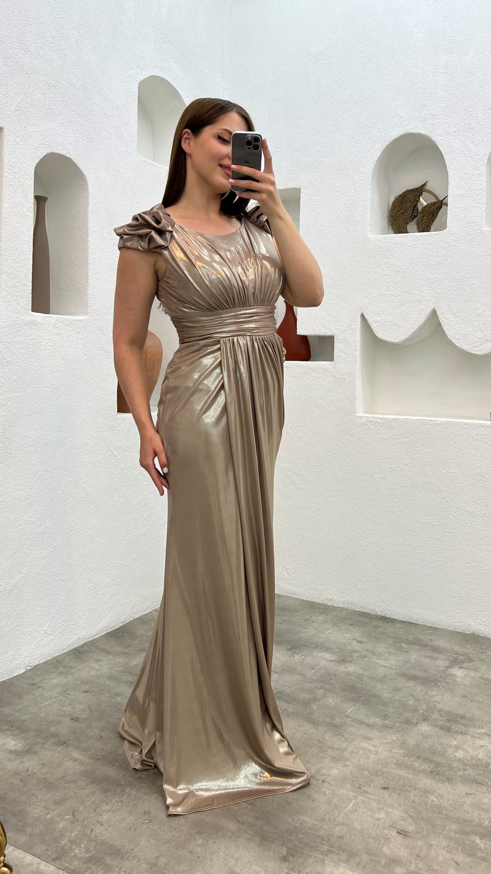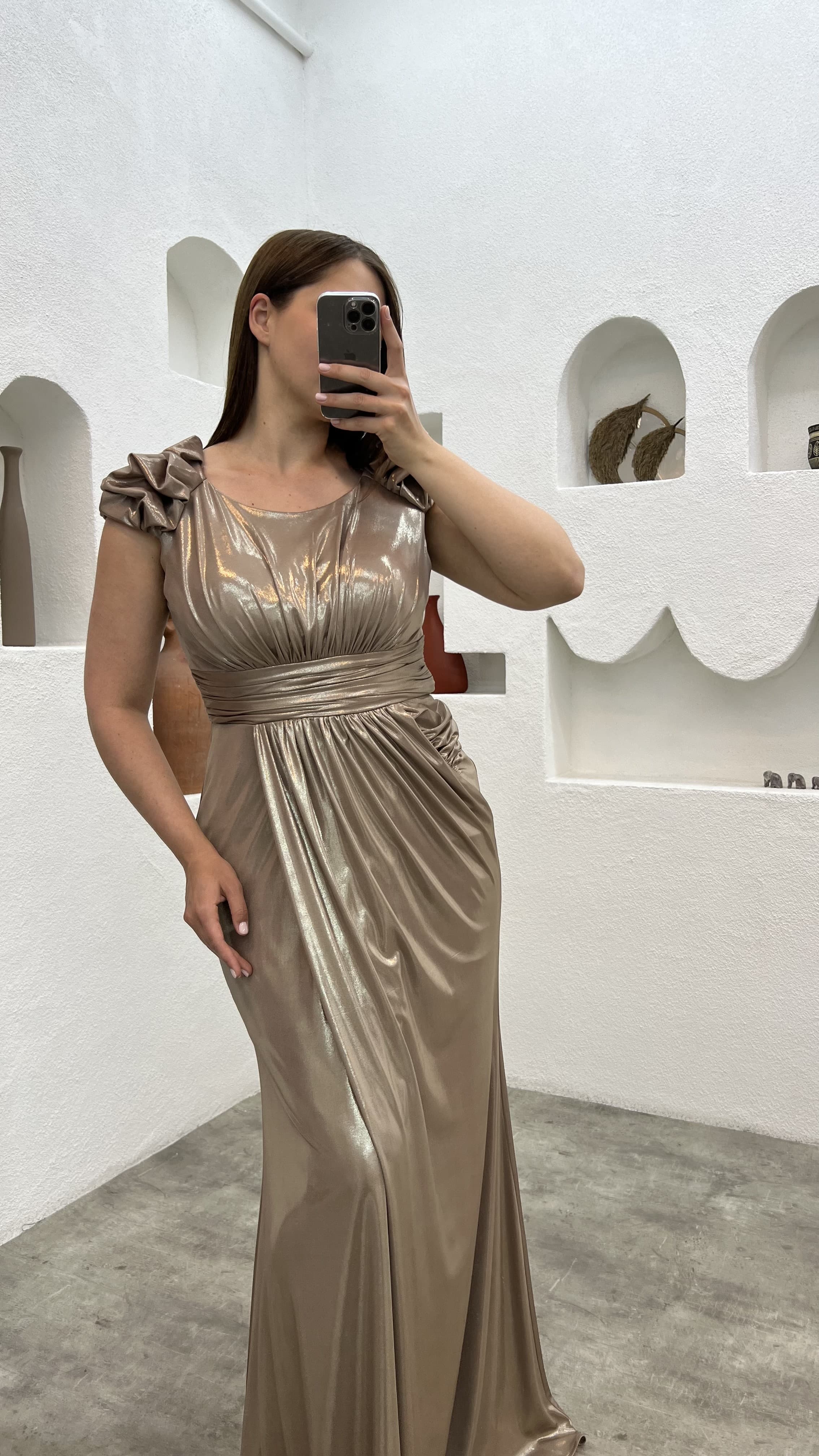 • Kahverengi Drapeli Omuz Detay Büyük Beden Abiye Elbise