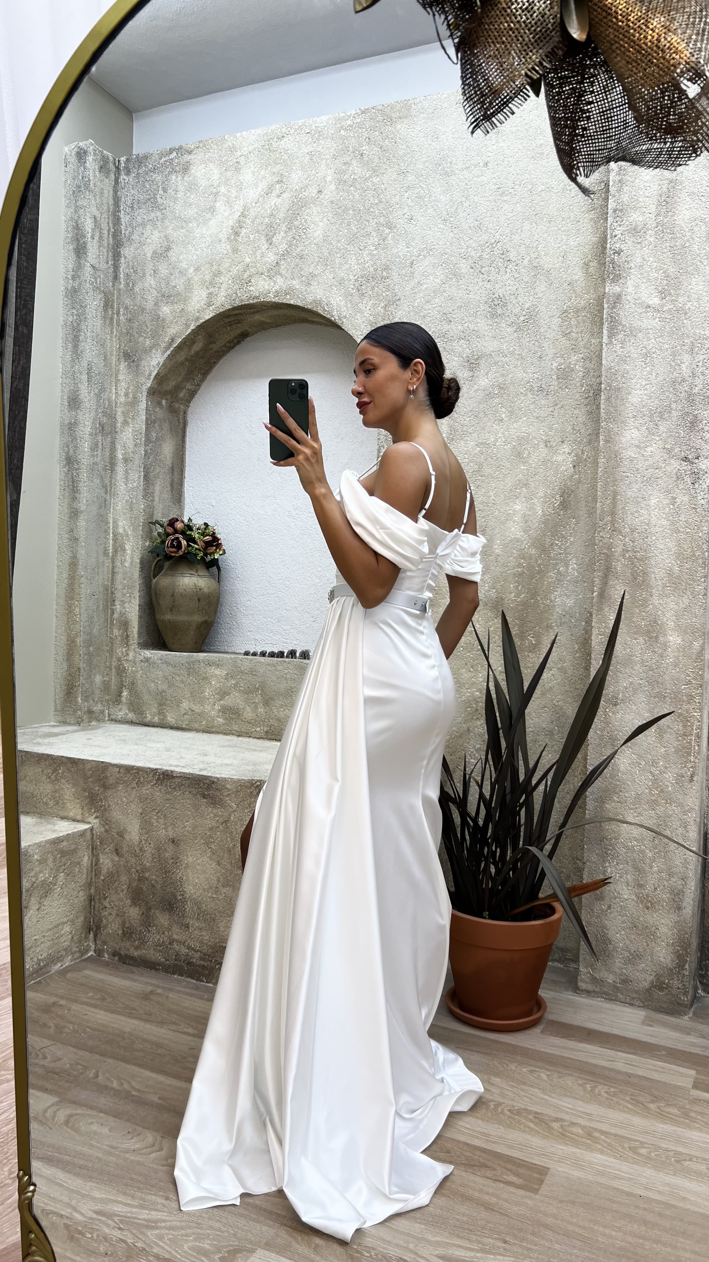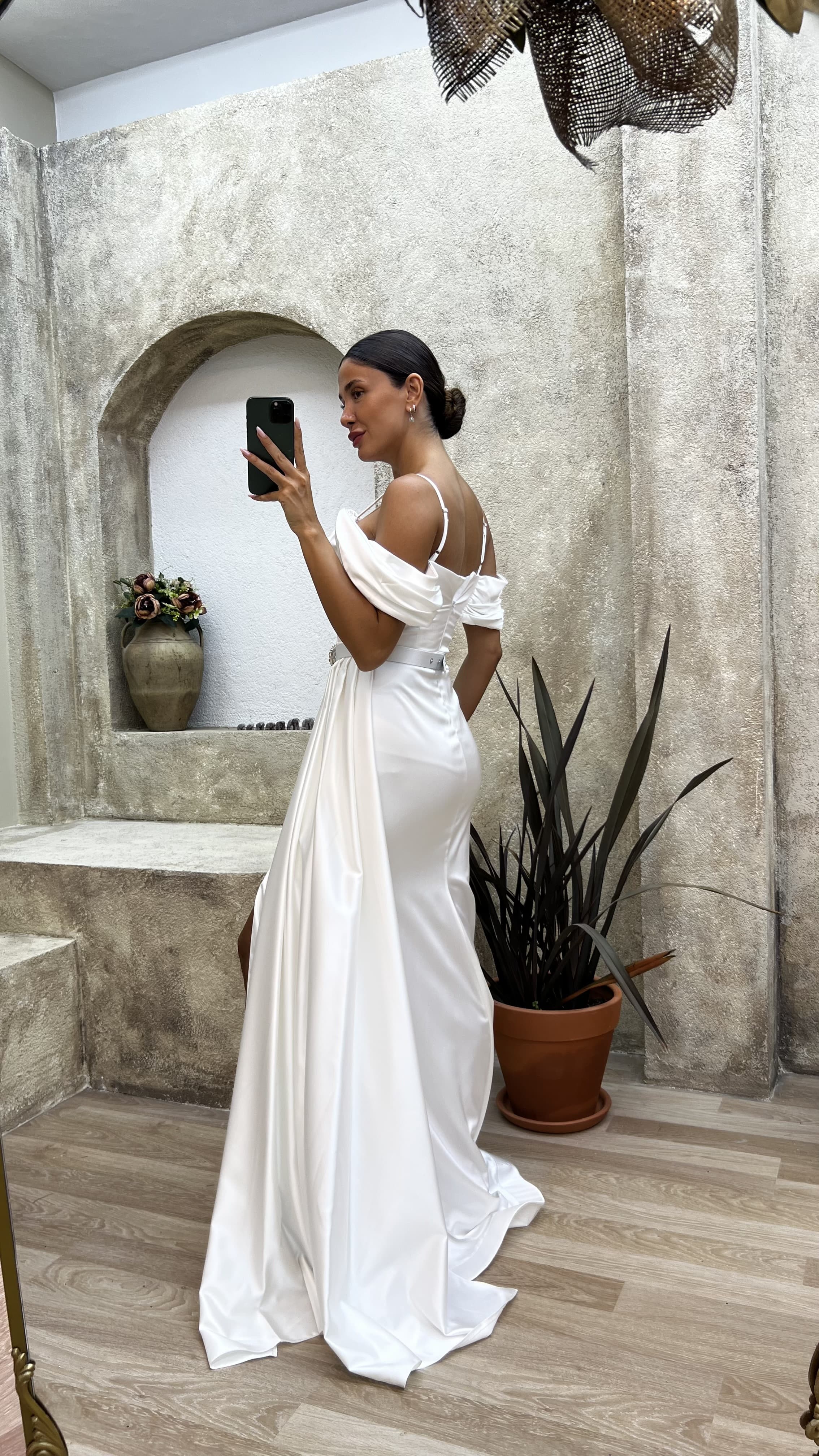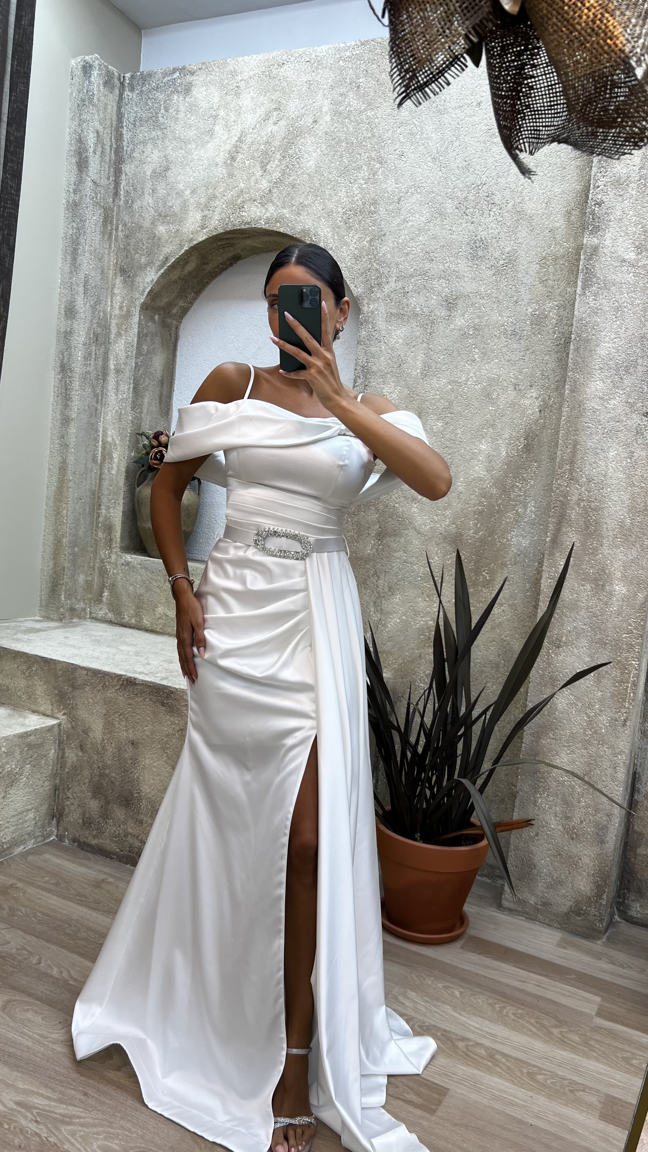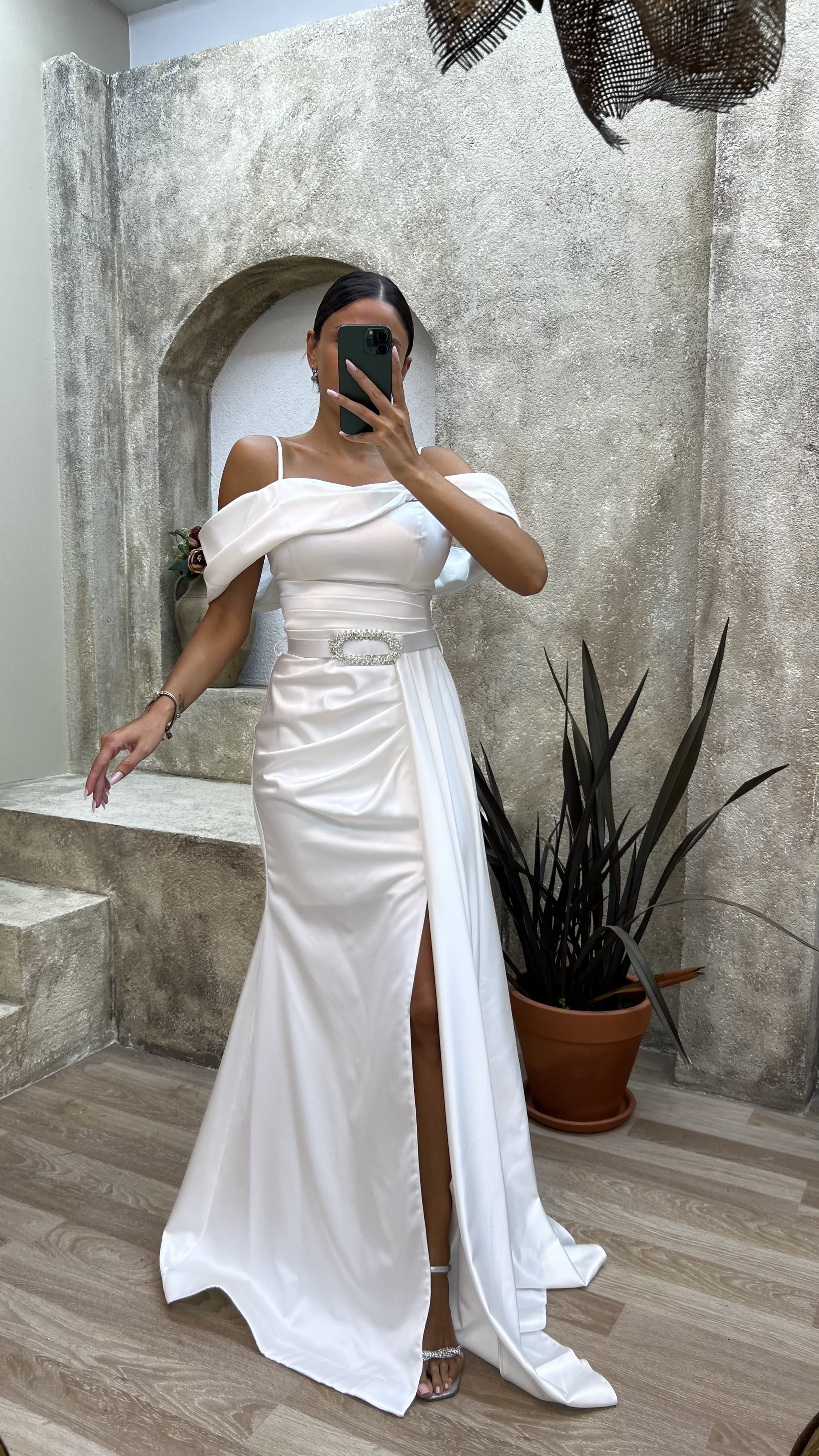 Beyaz İp Askılı Fiyonk Yaka Drapeli Saten Abiye Elbise