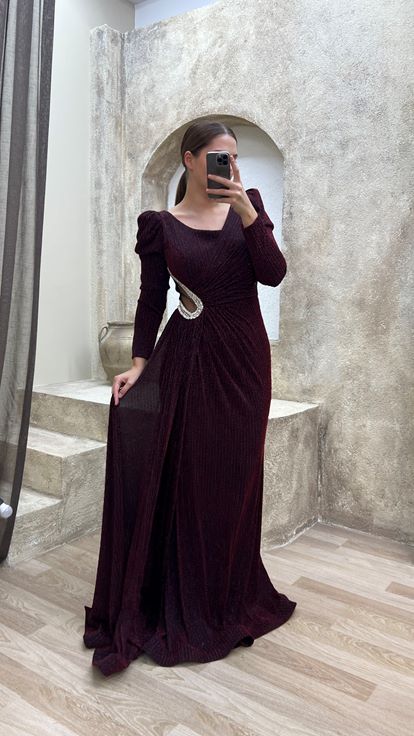 بورجوندي الخامس الرقبة الخصر التفاصيل حجر مطرز تصميم بالاضافة الى حجم فستان السهرة