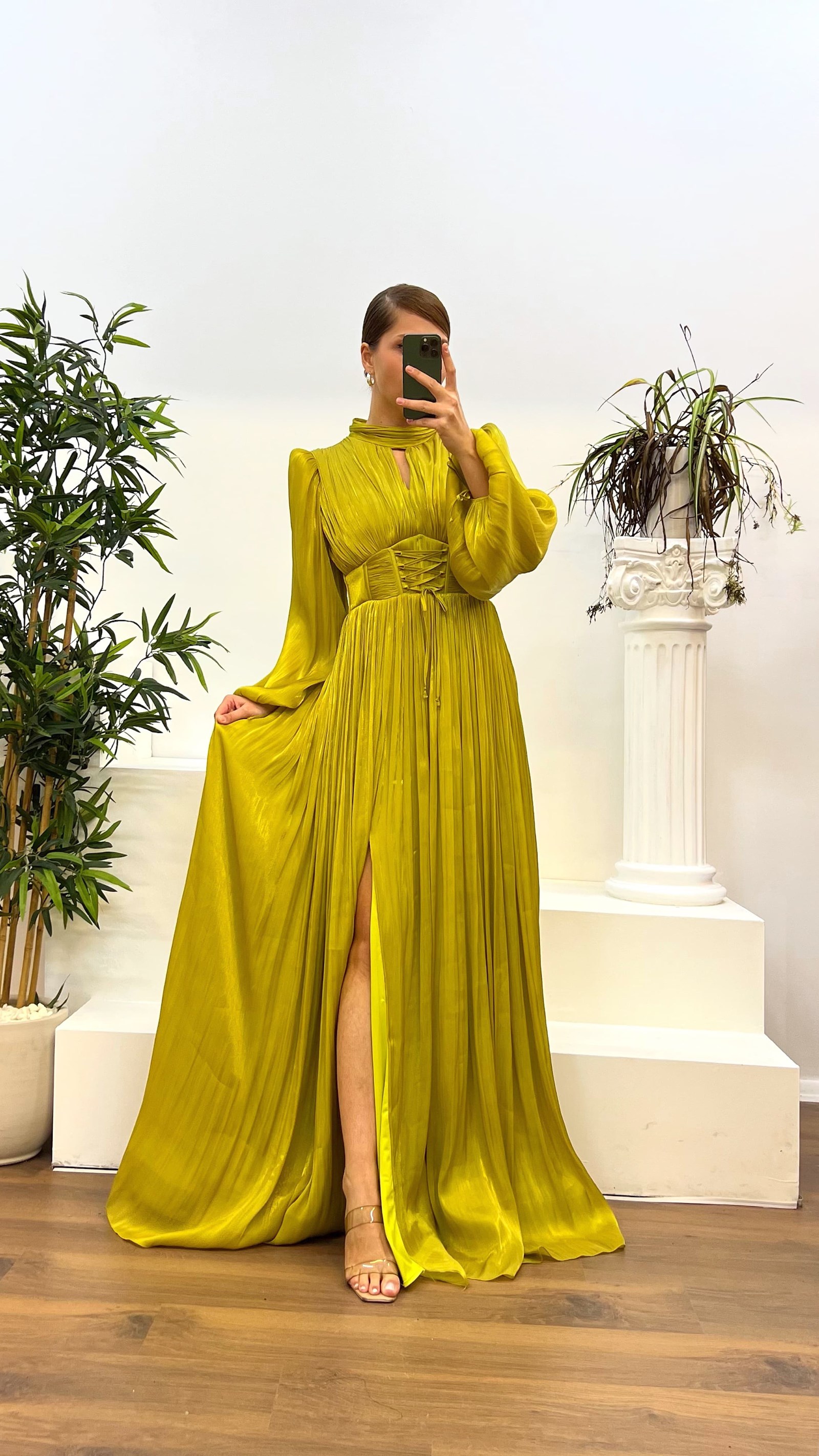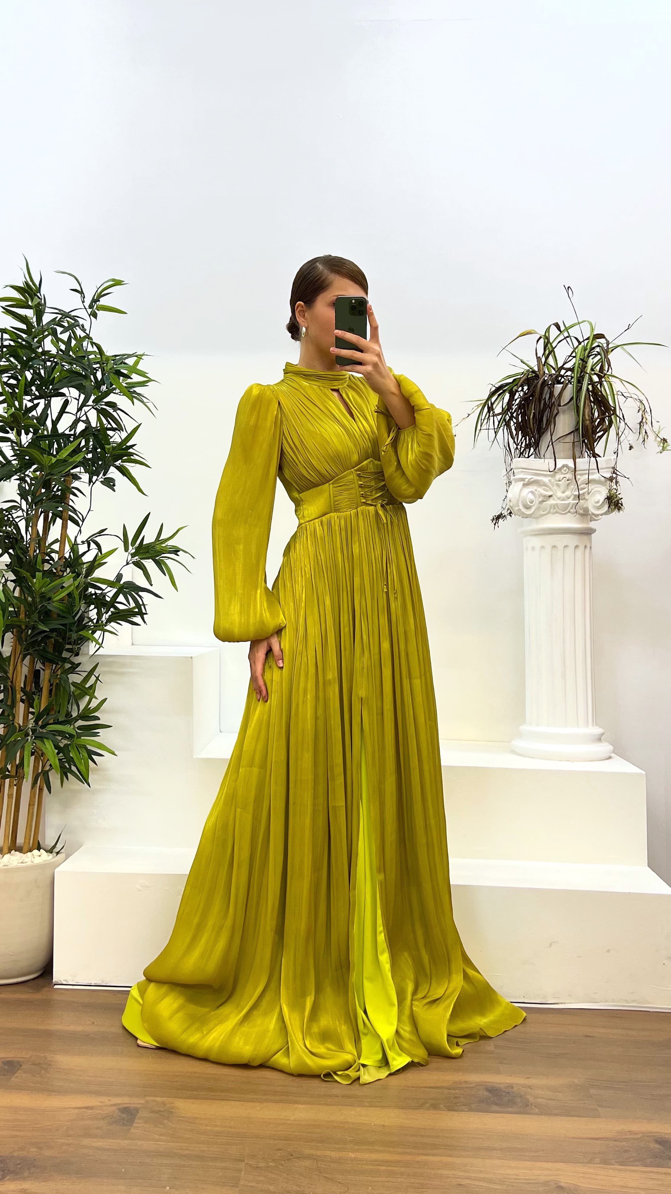 • Elma Yeşili Uzun Kol Drapeli Büyük Beden Abiye Elbise