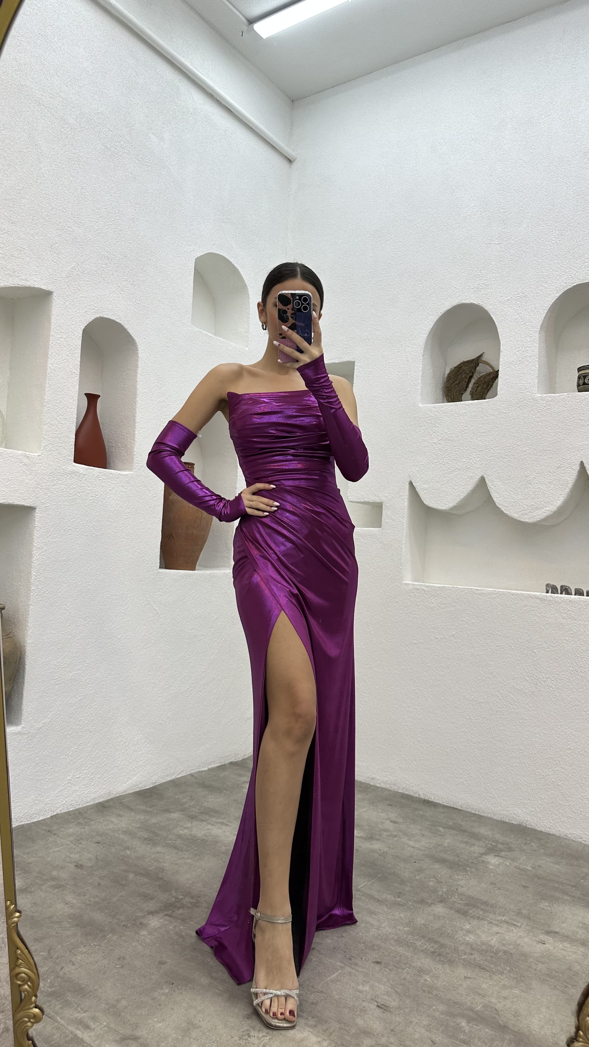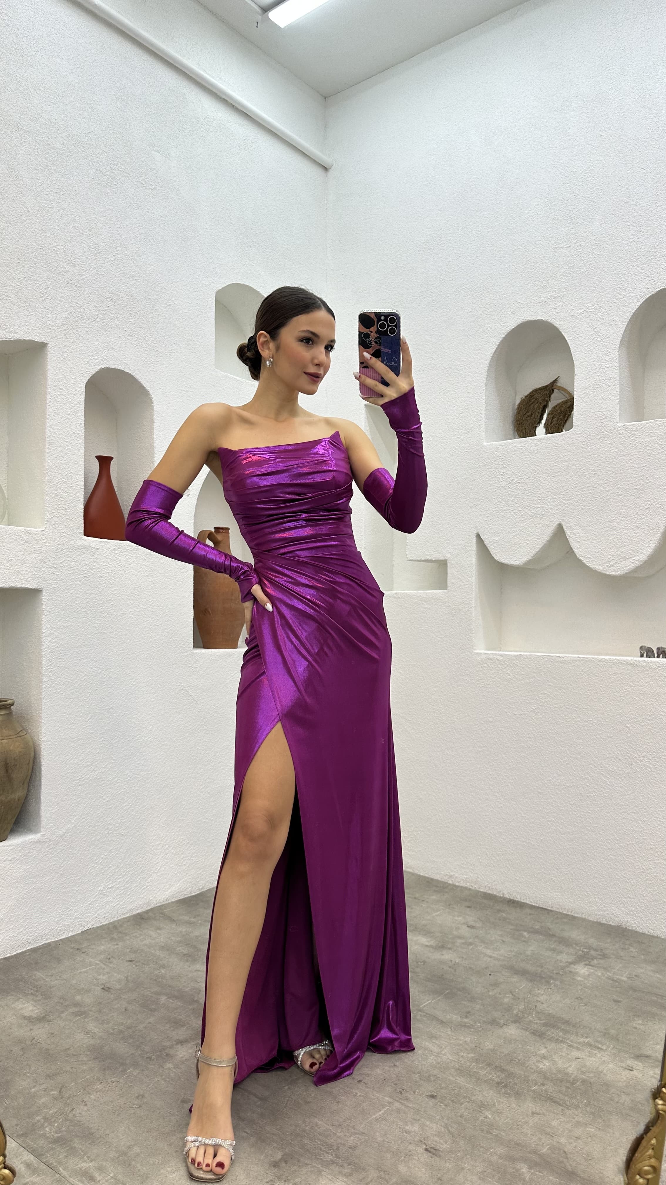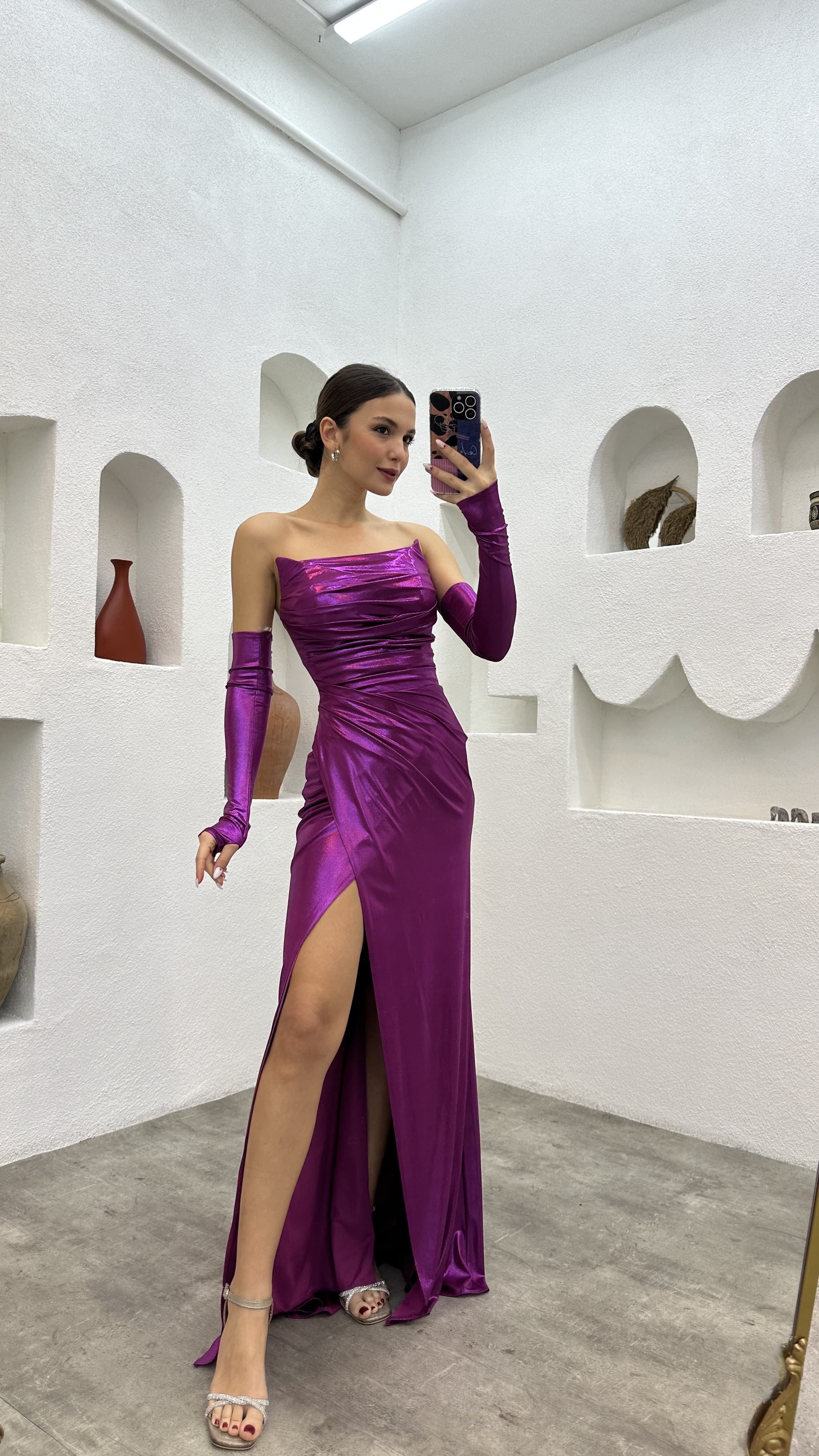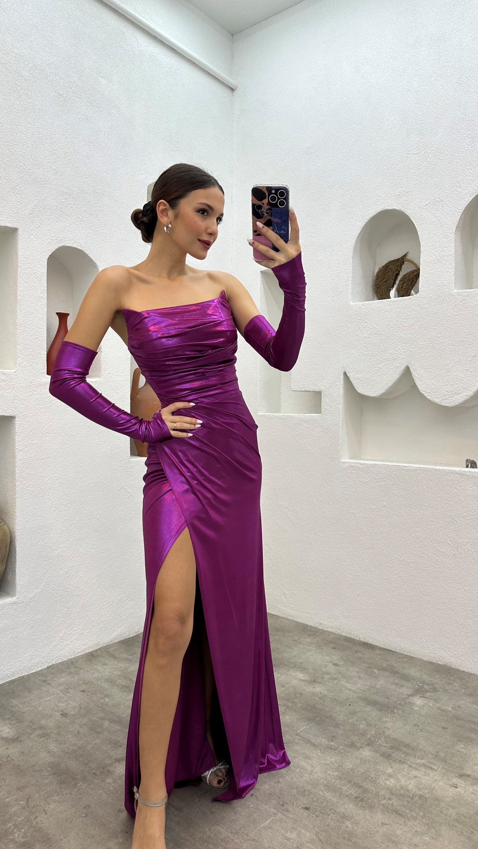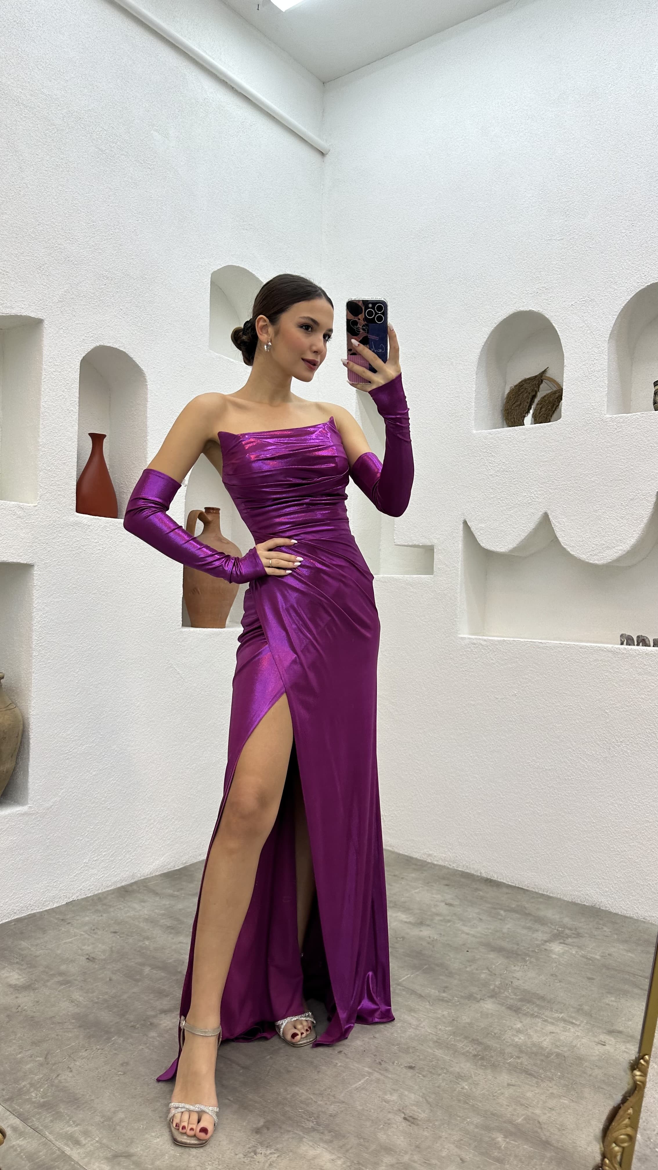 Fuşya Büzgülü Straplez Saten Abiye Elbise