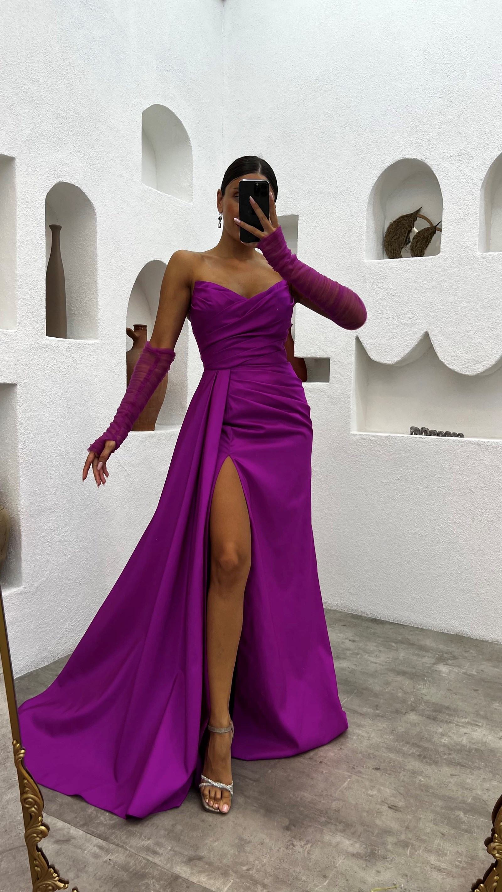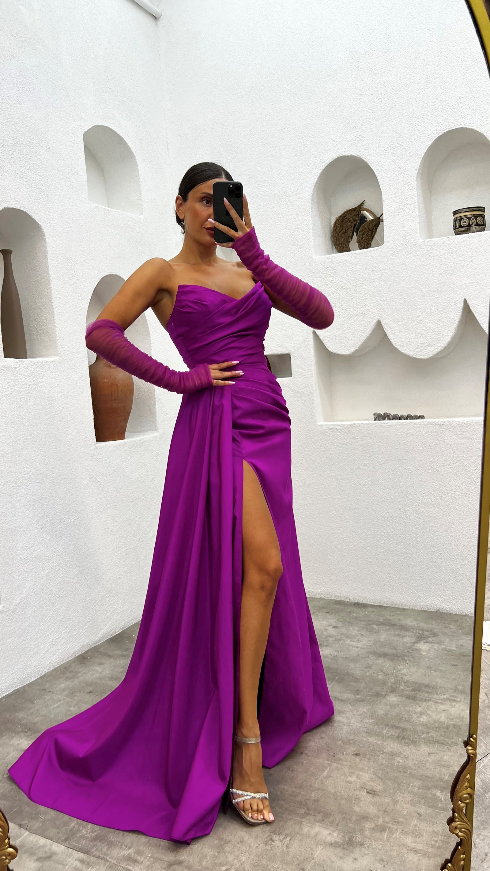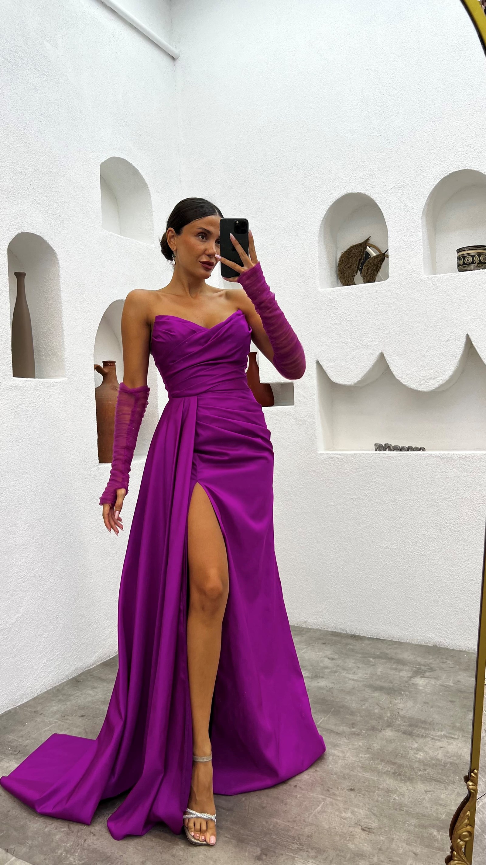 Fuşya Kol Detay Drapeli Straplez Abiye Elbise