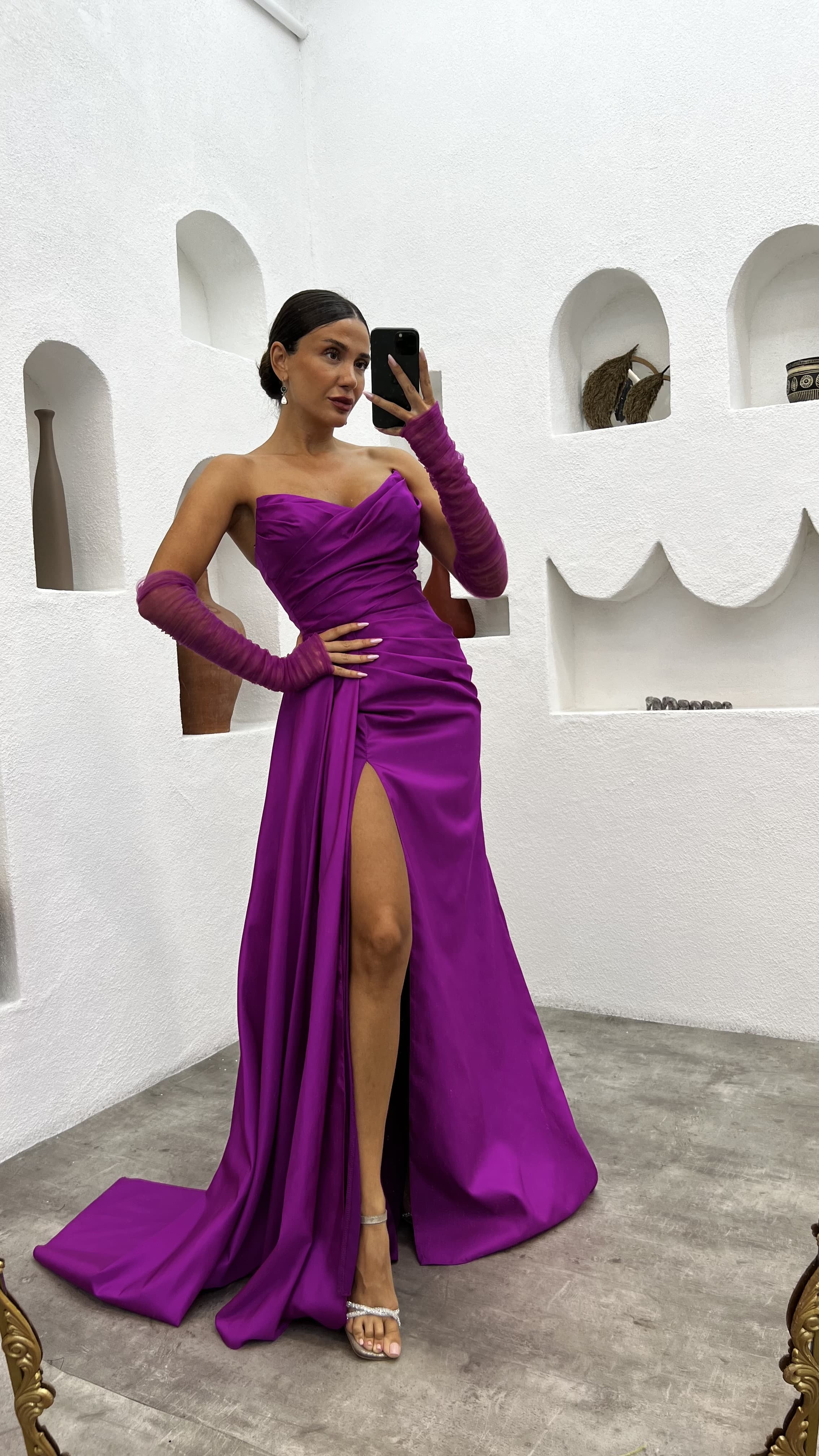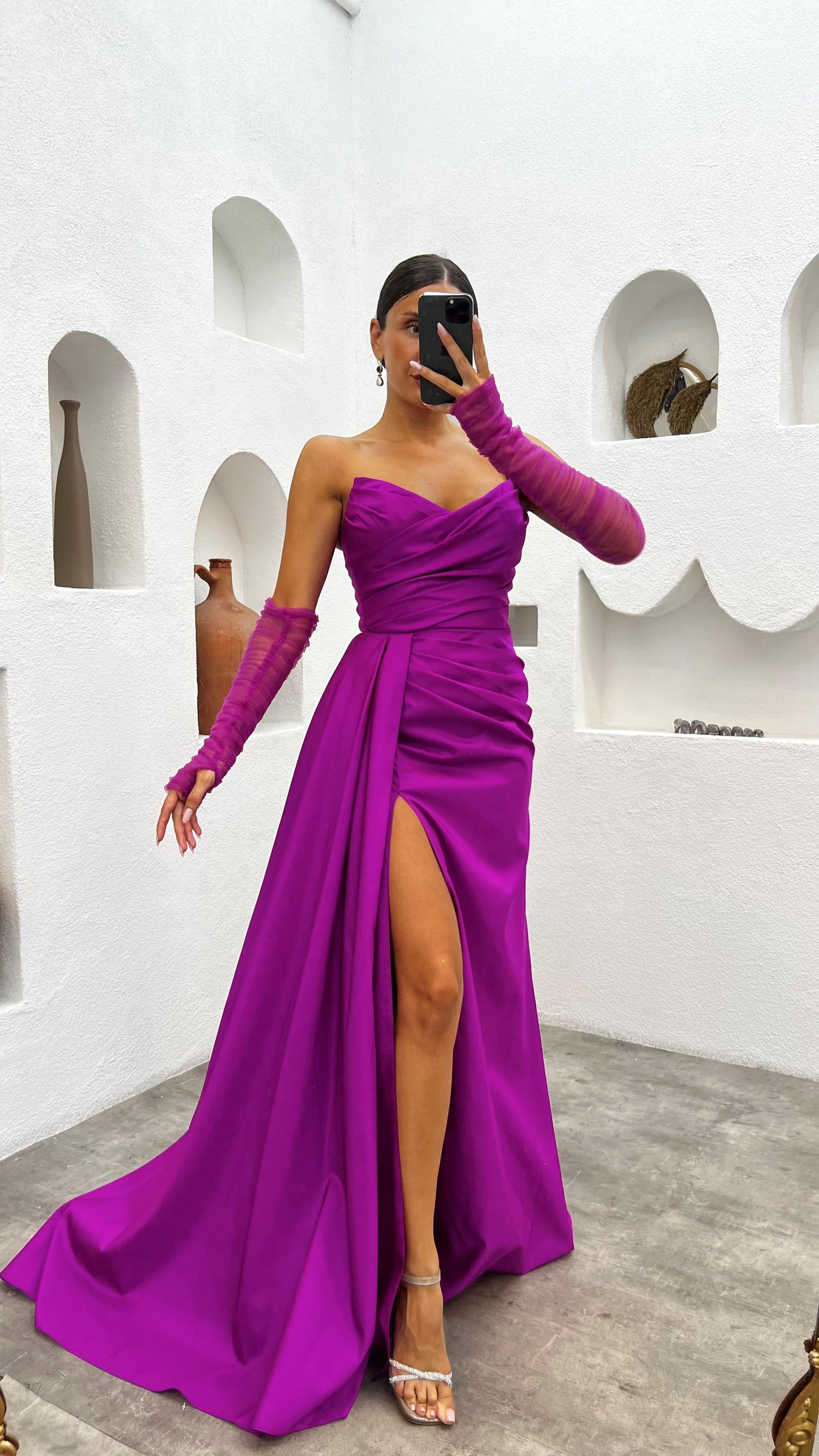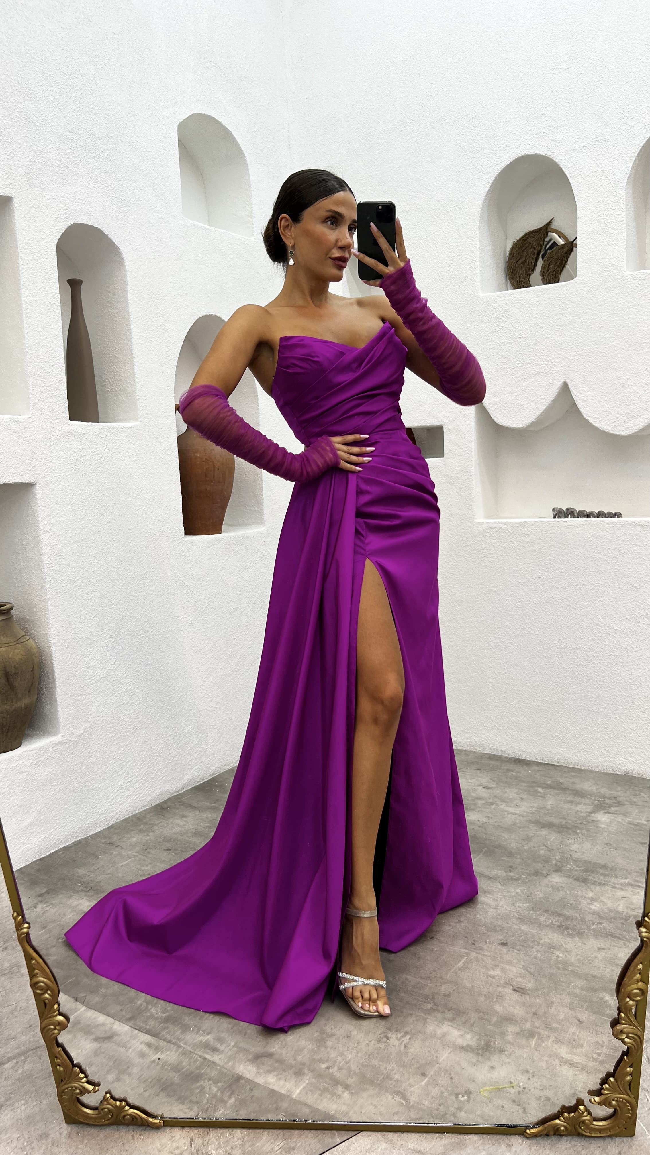 Fuşya Kol Detay Drapeli Straplez Abiye Elbise