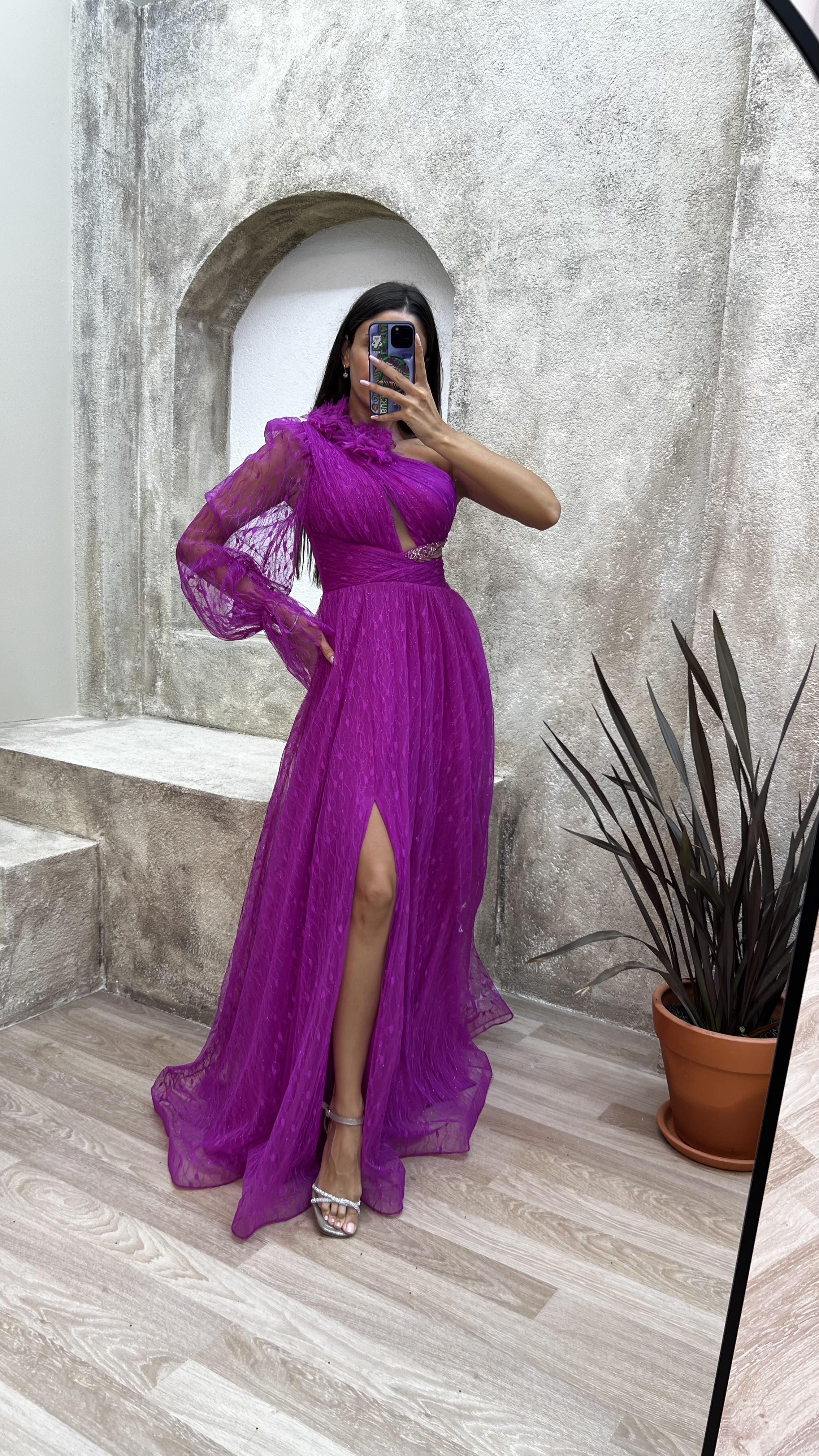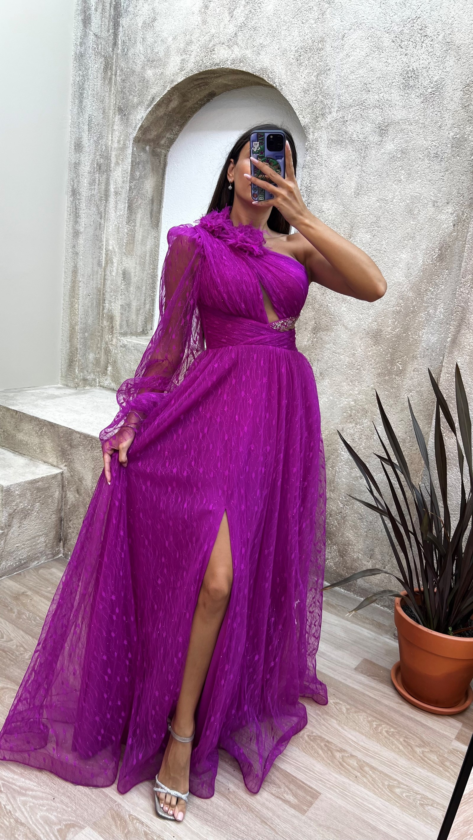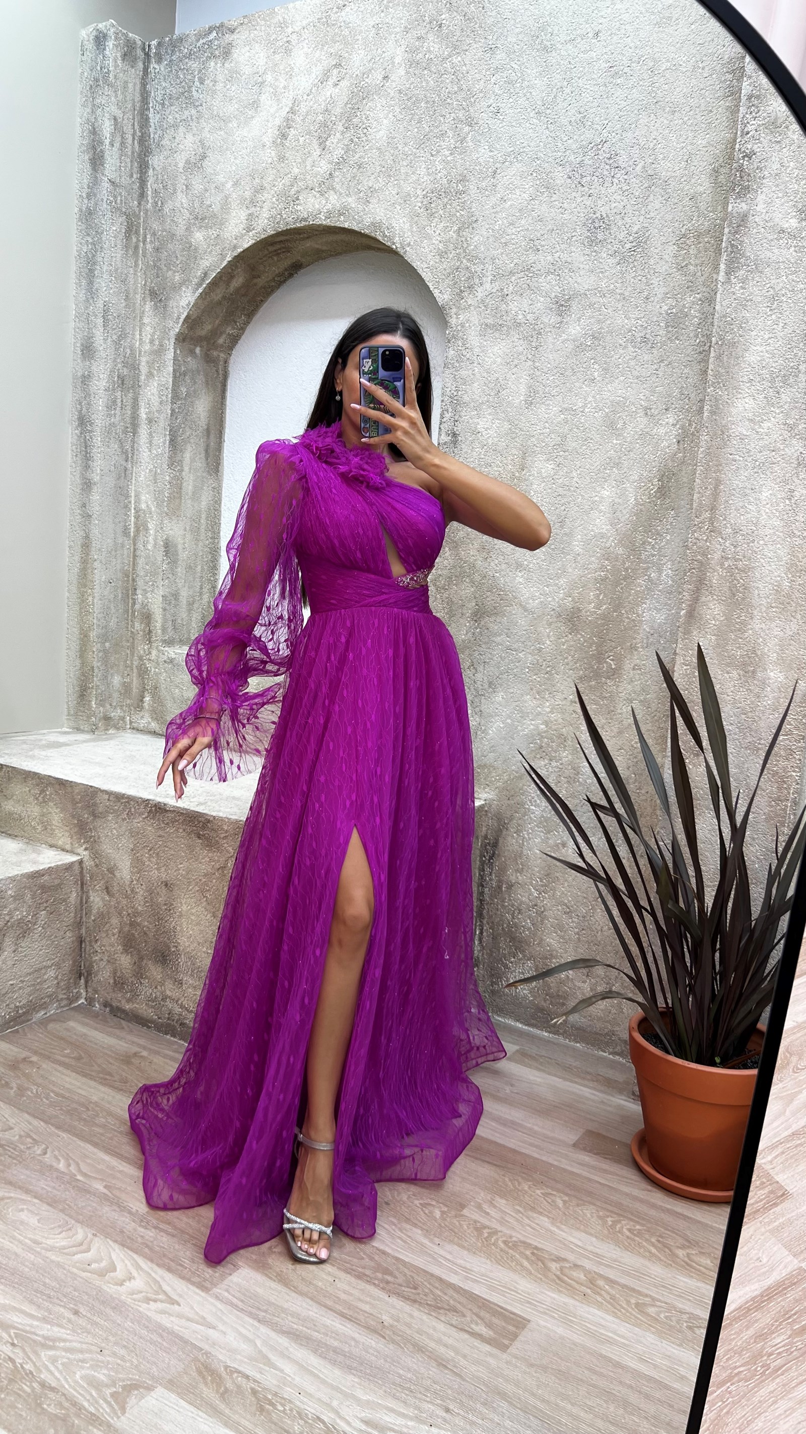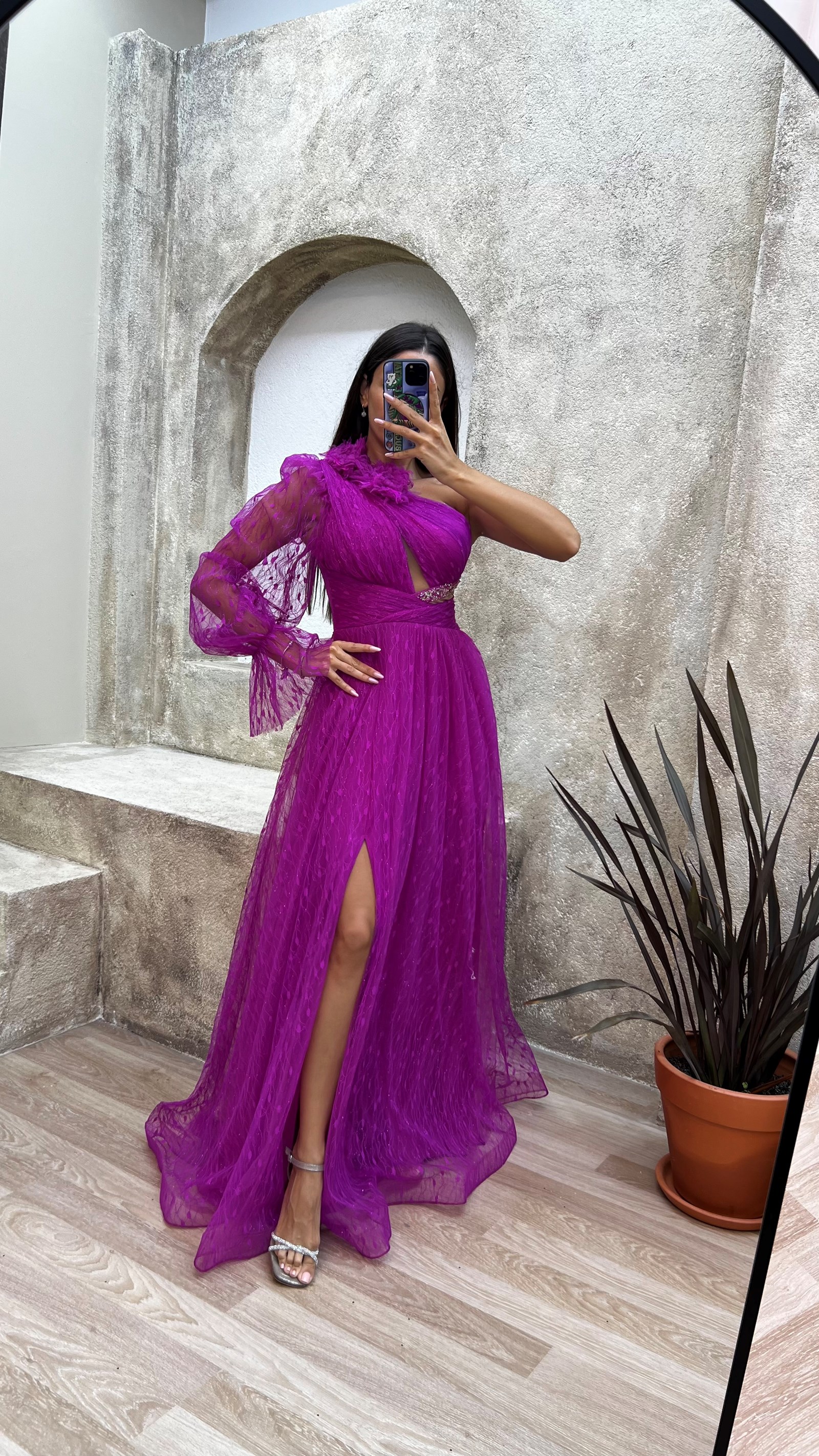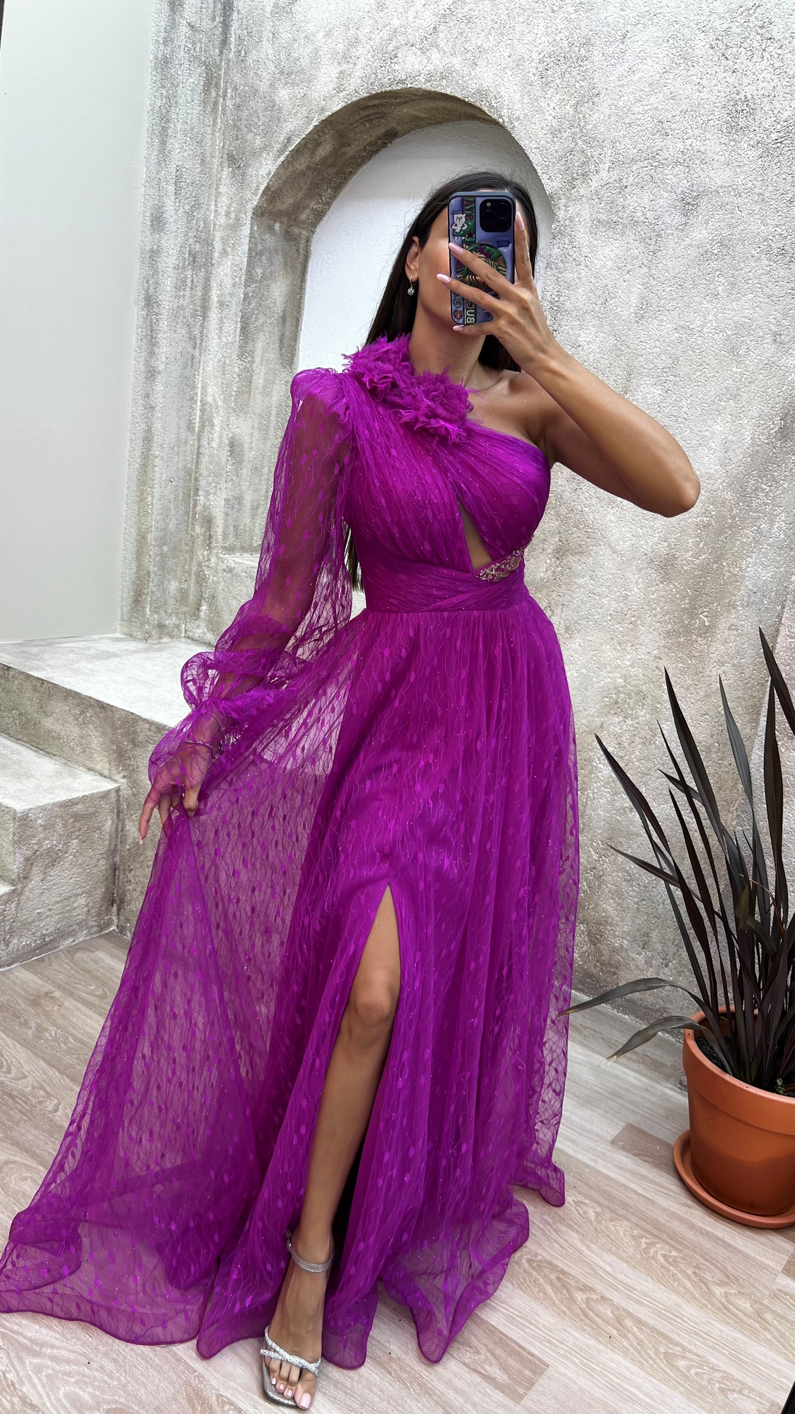 • فستان سهرة من التول بأكمام واحدة باللون الفوشيا