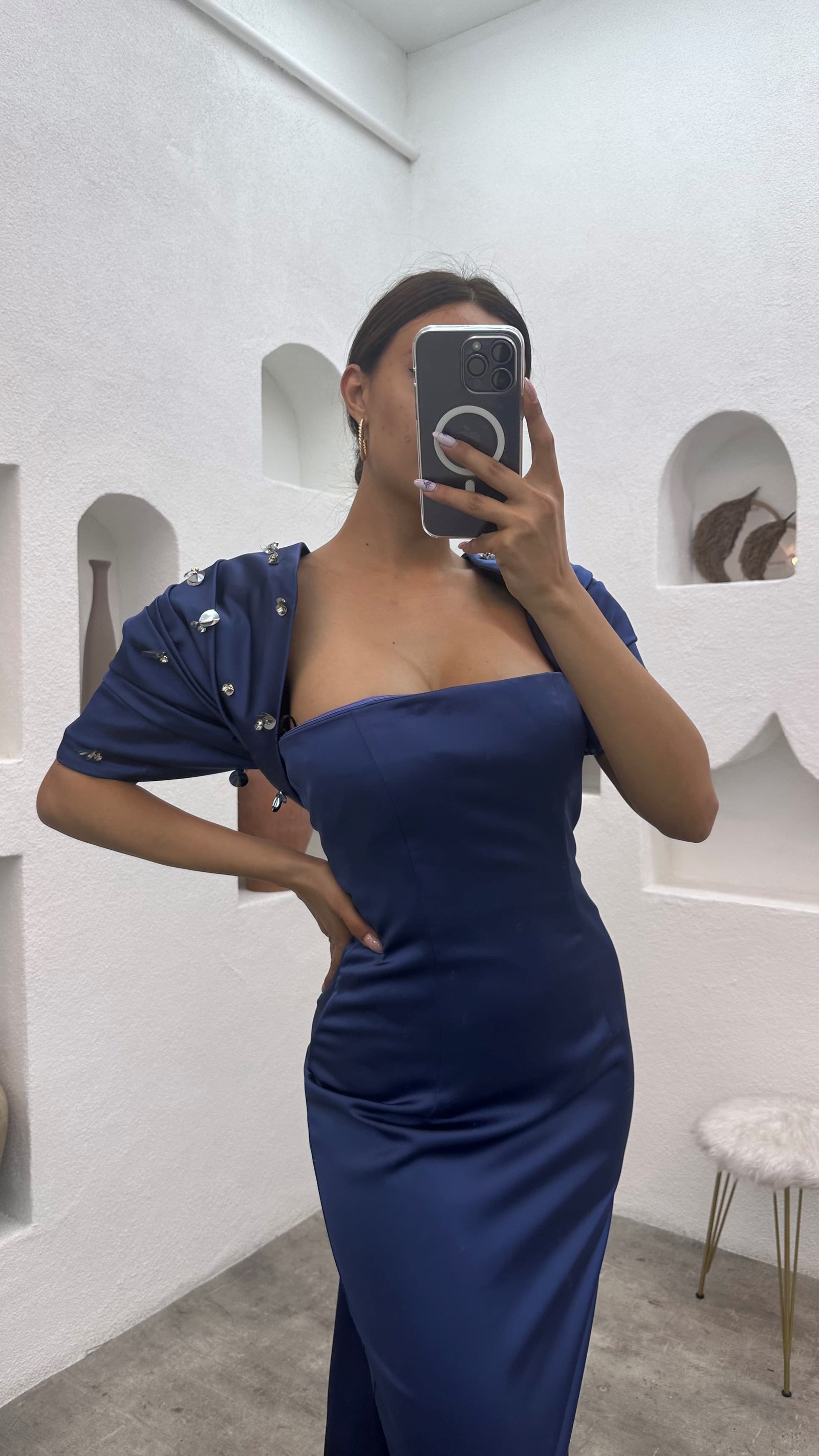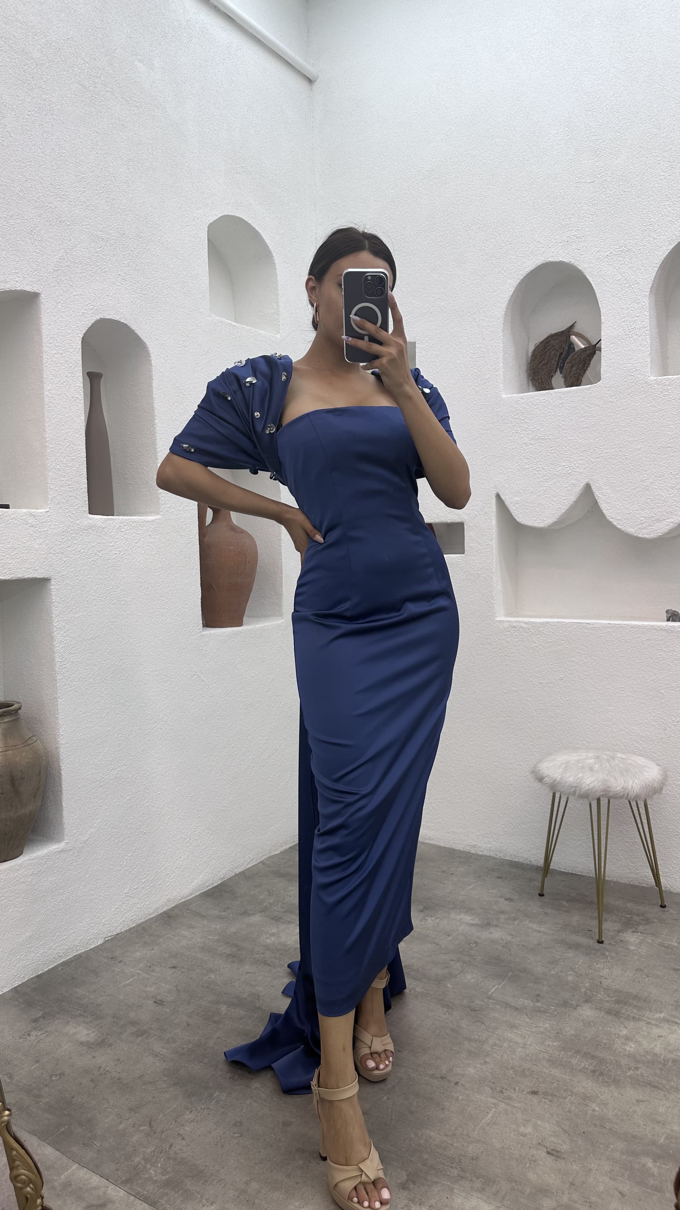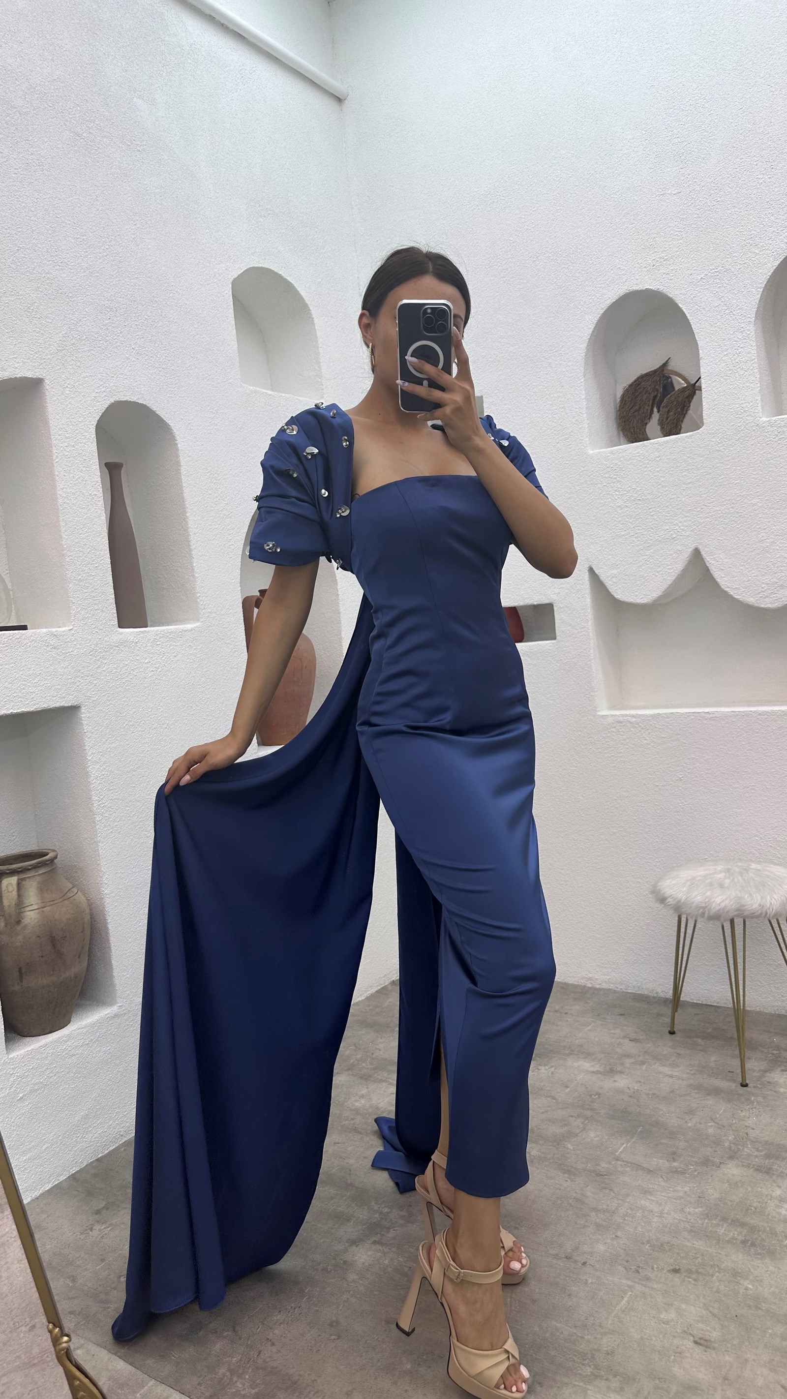 • فستان سهرة أزرق نيلي بدون حمالات بأكمام كاب مزين بأحجار كريمة