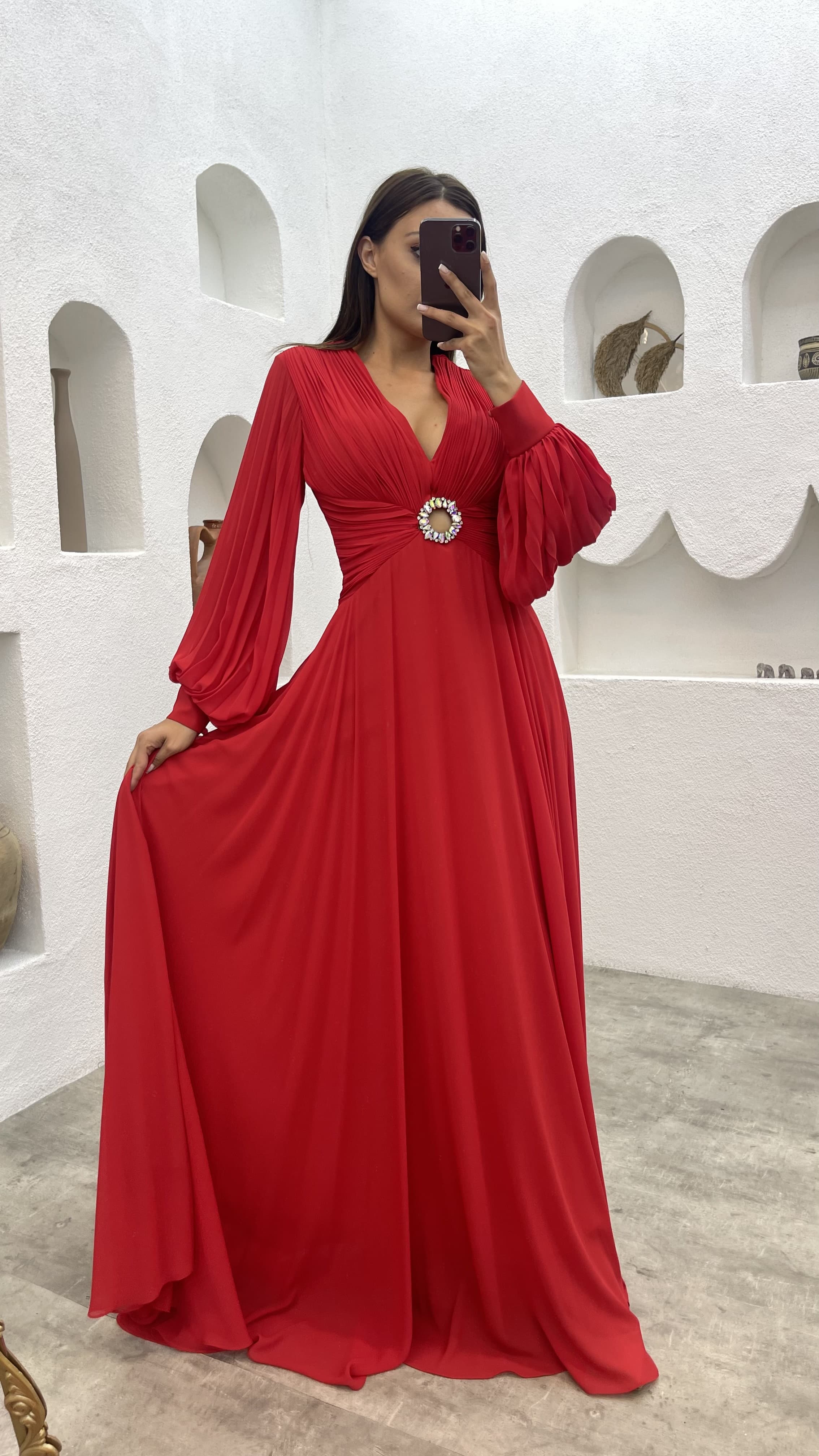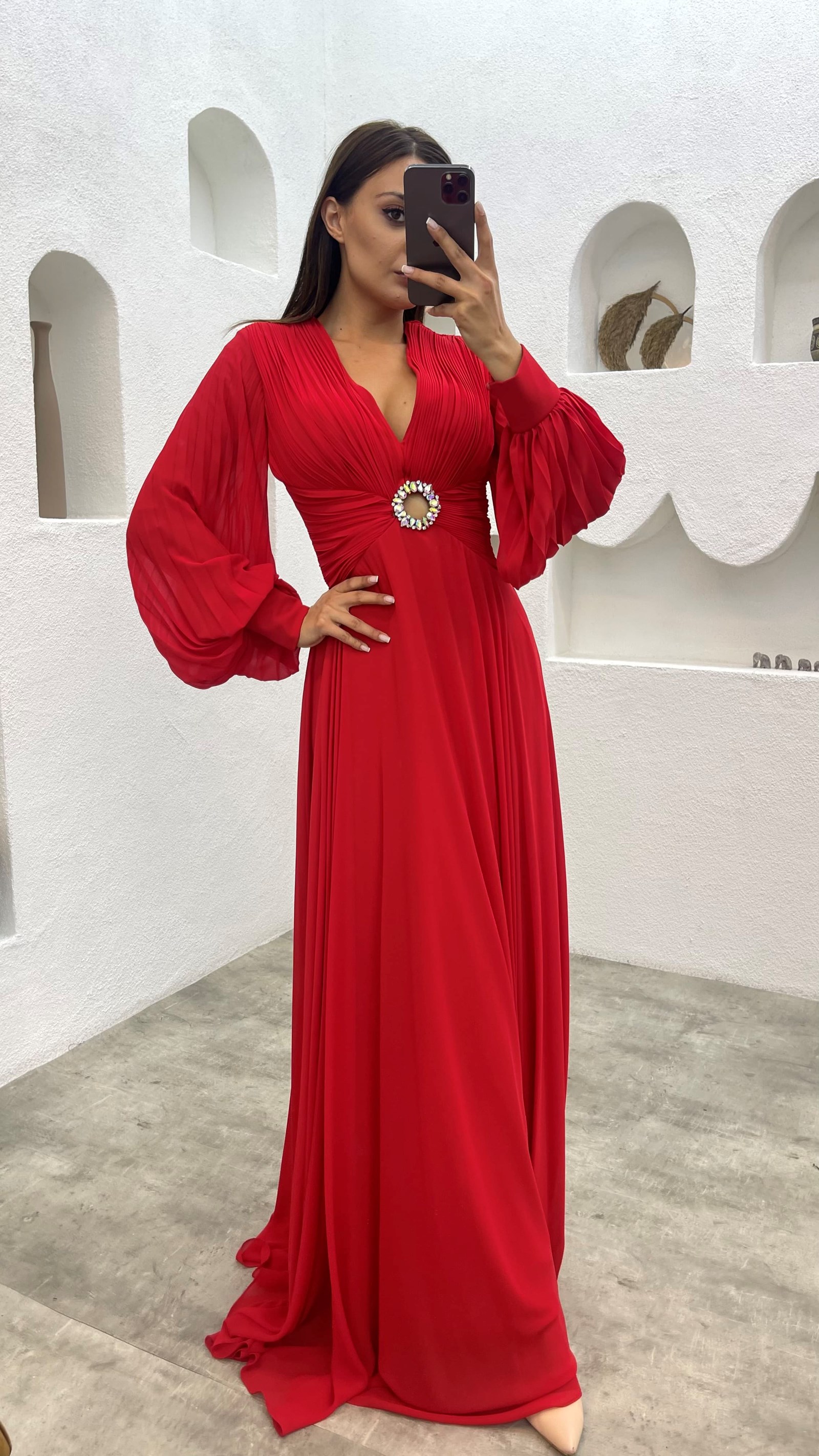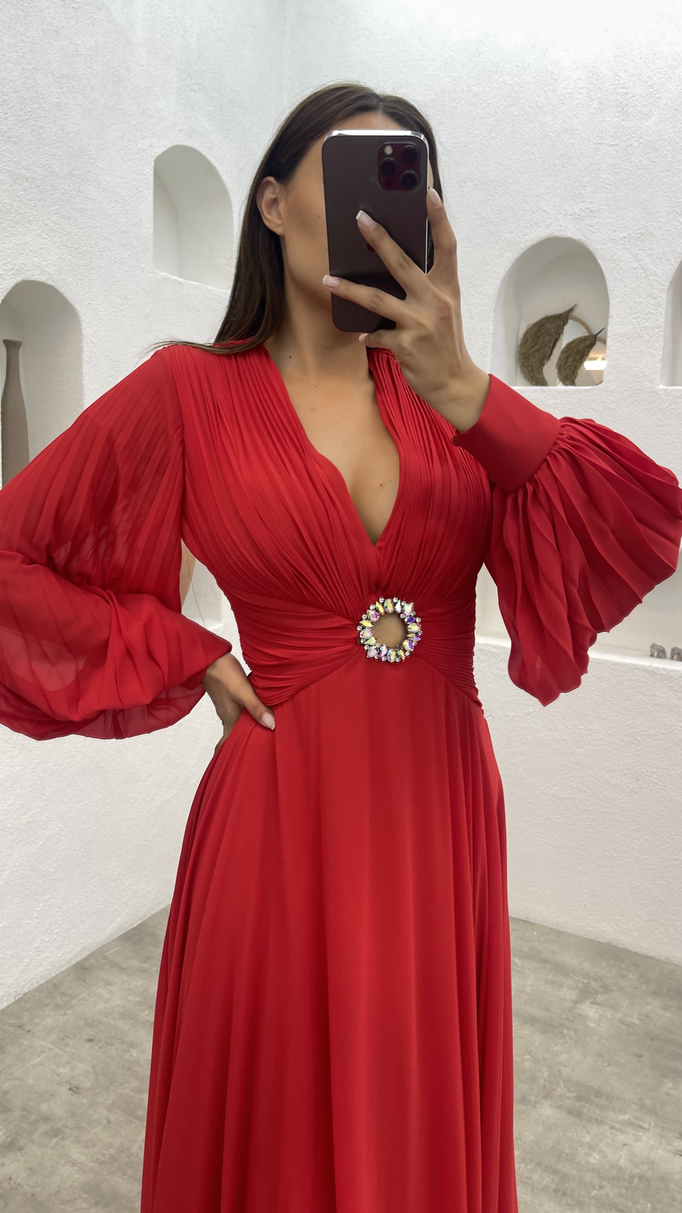 • Kırmızı Göğsü Ve Kolları Fırfırlı Tül Abiye Elbise