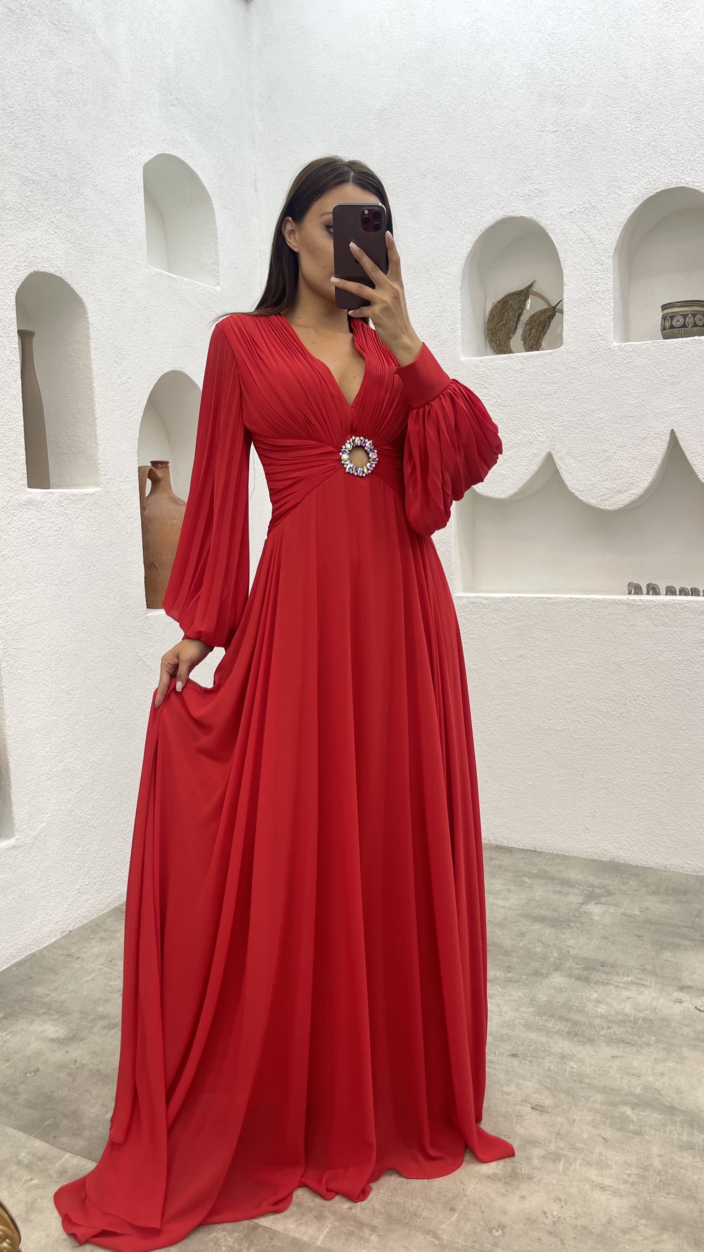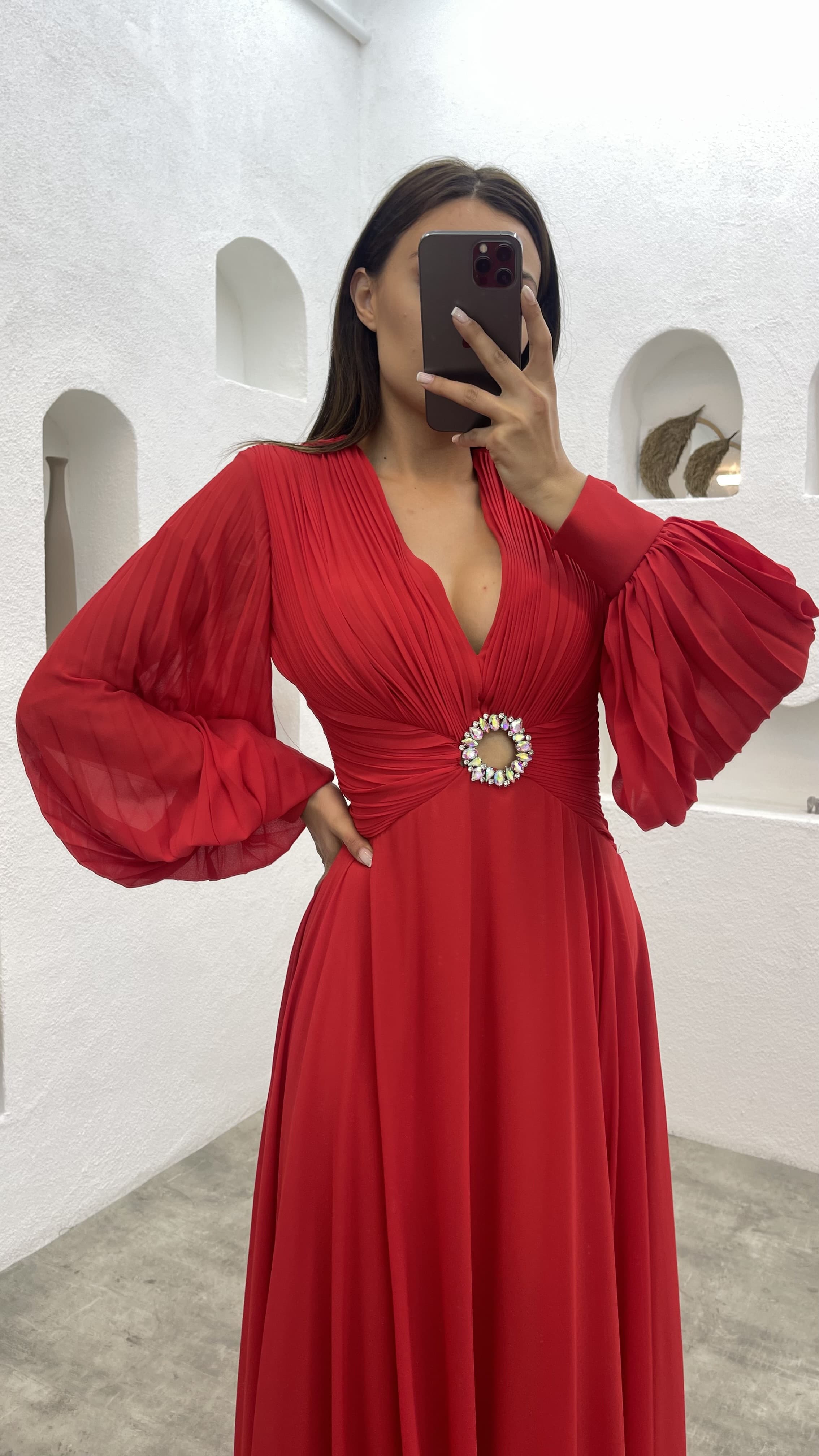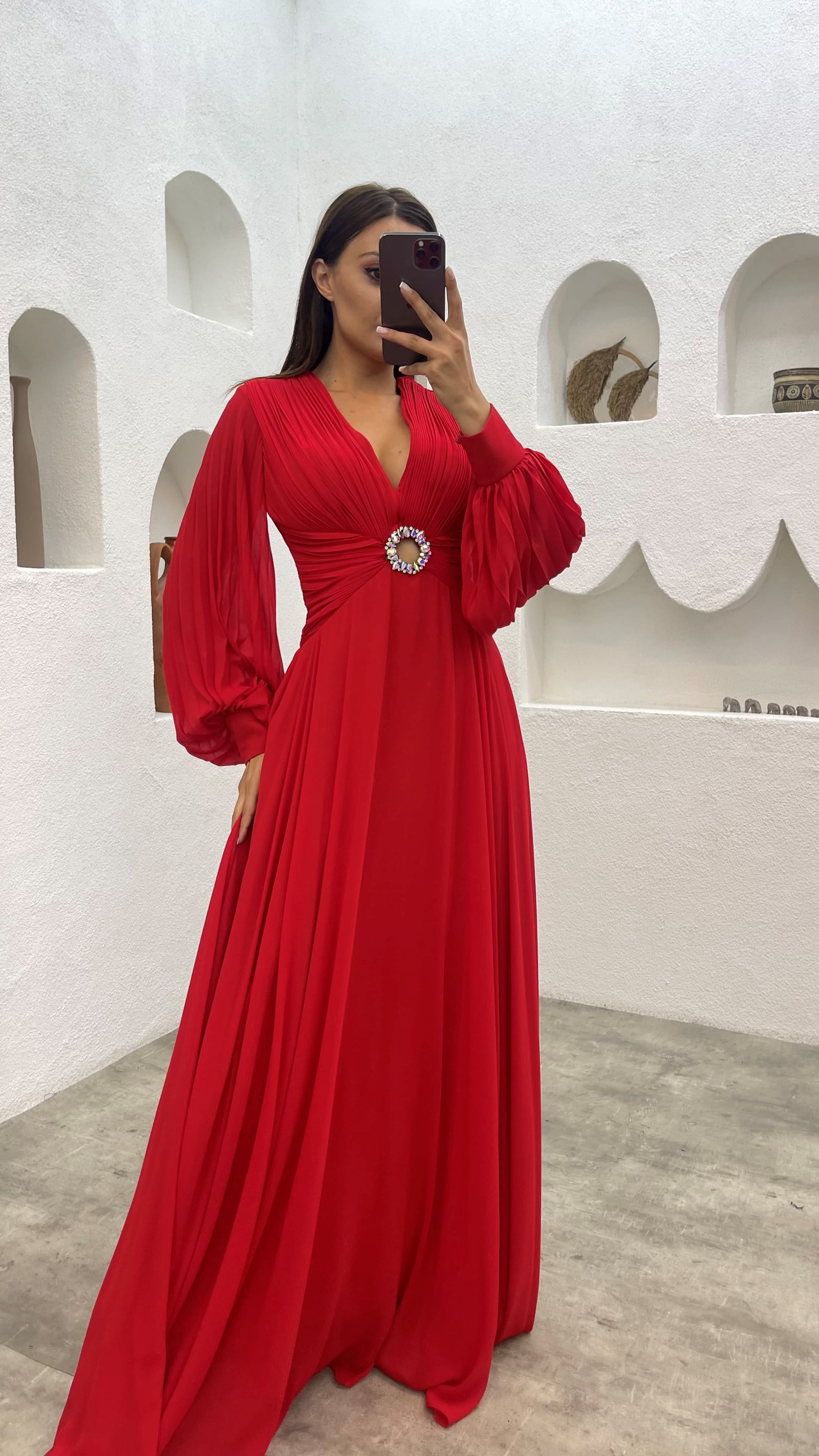 • Kırmızı Göğsü Ve Kolları Fırfırlı Tül Abiye Elbise