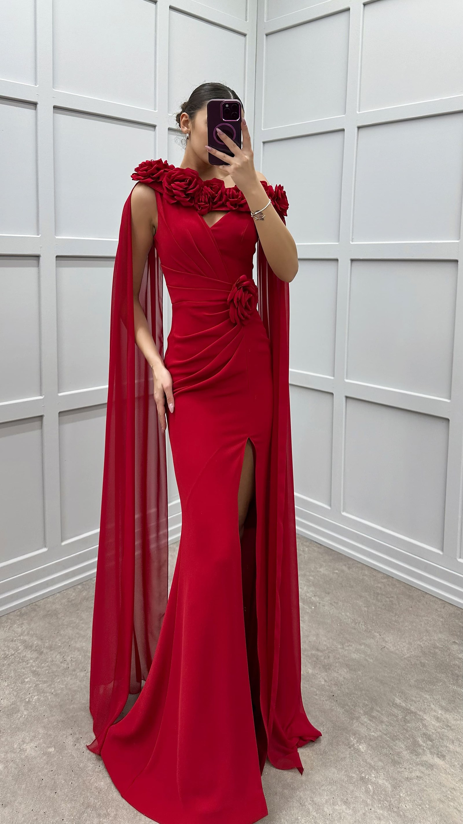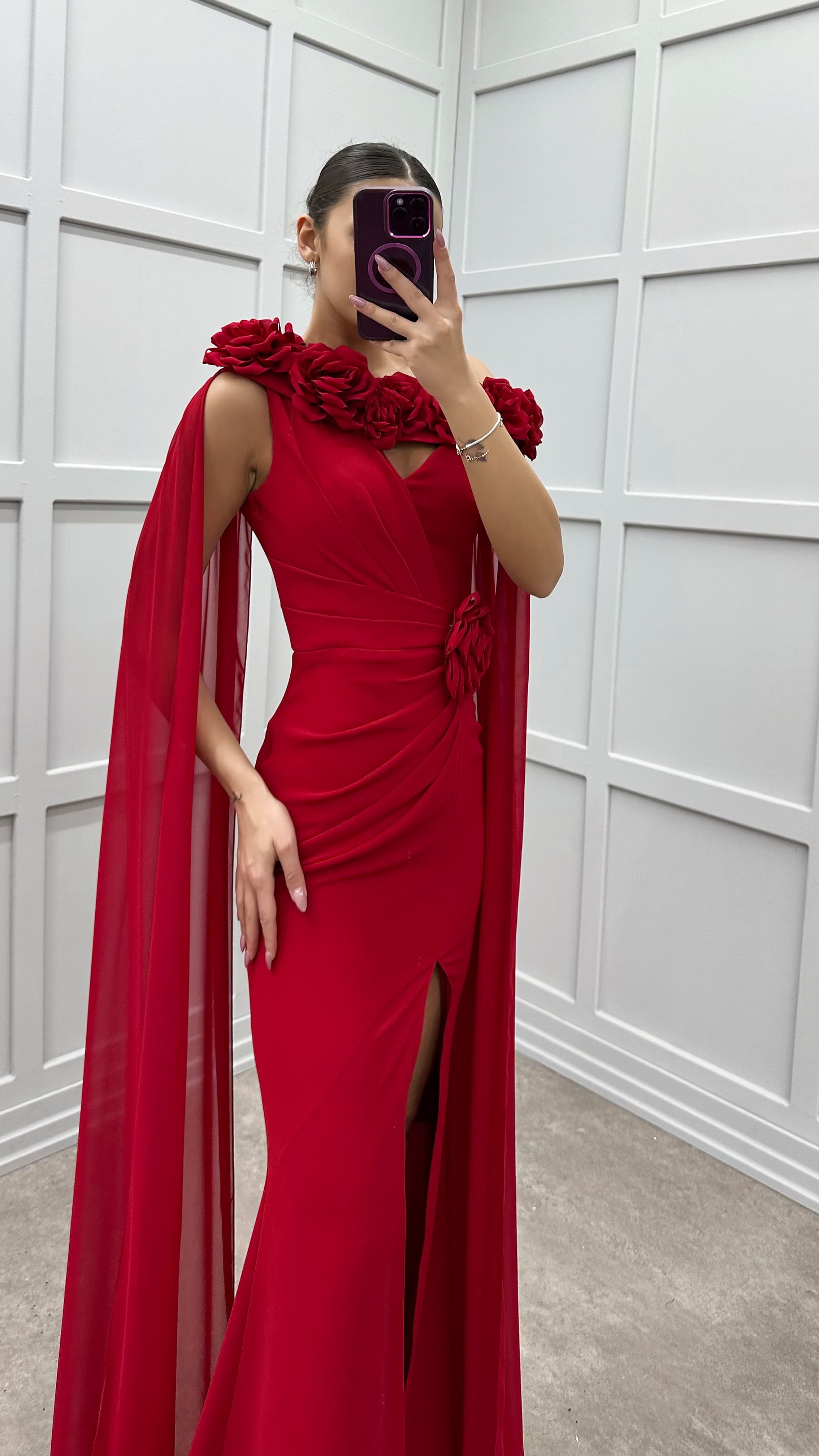 • Kırmızı Omuzları Gül Detay Abiye Elbise