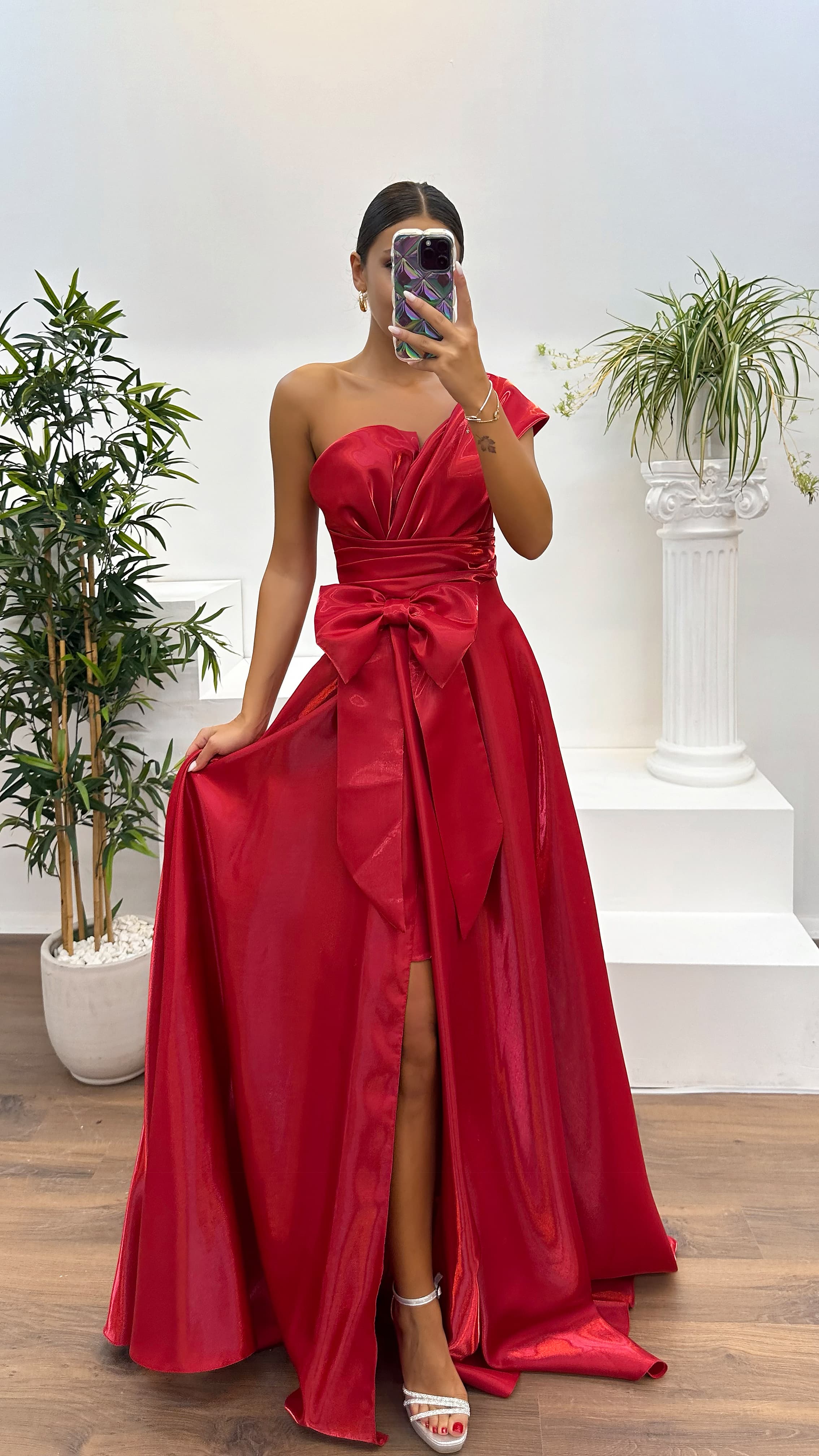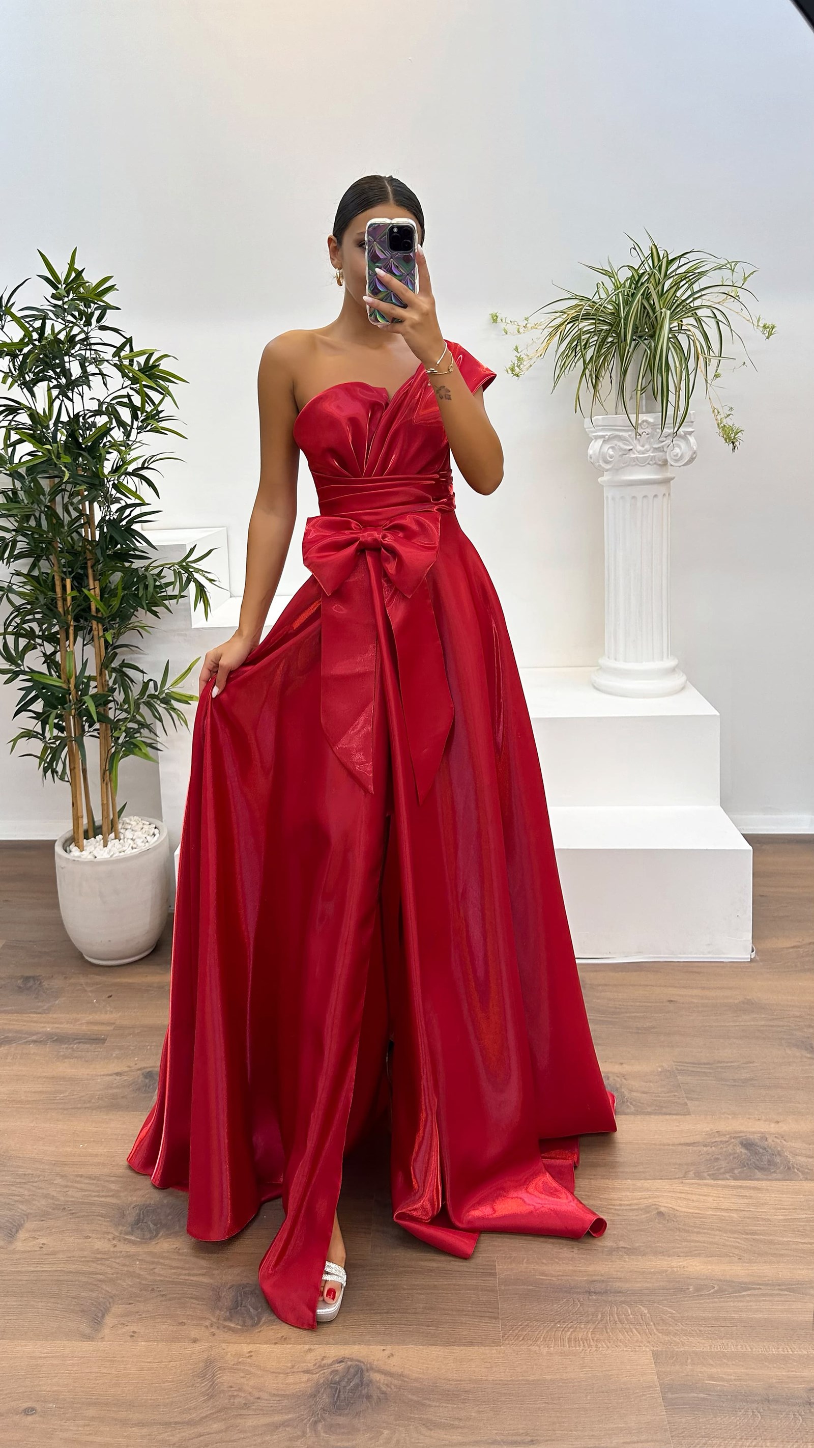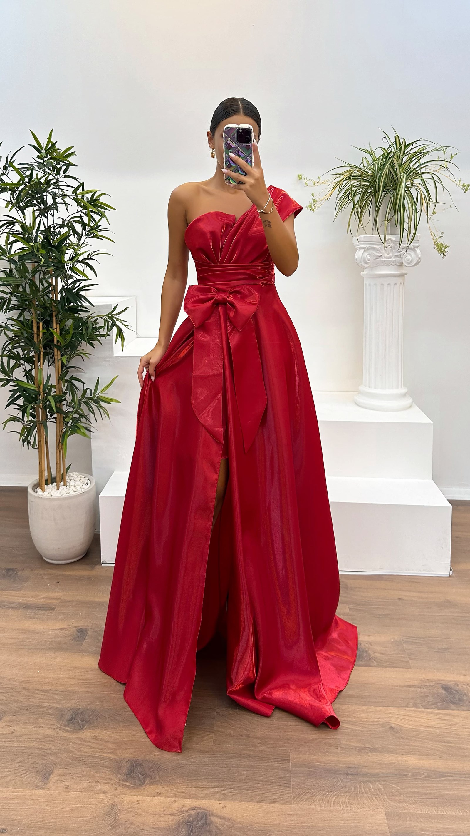 • Kırmızı Tek Kol Fiyonk Detay Abiye Elbise