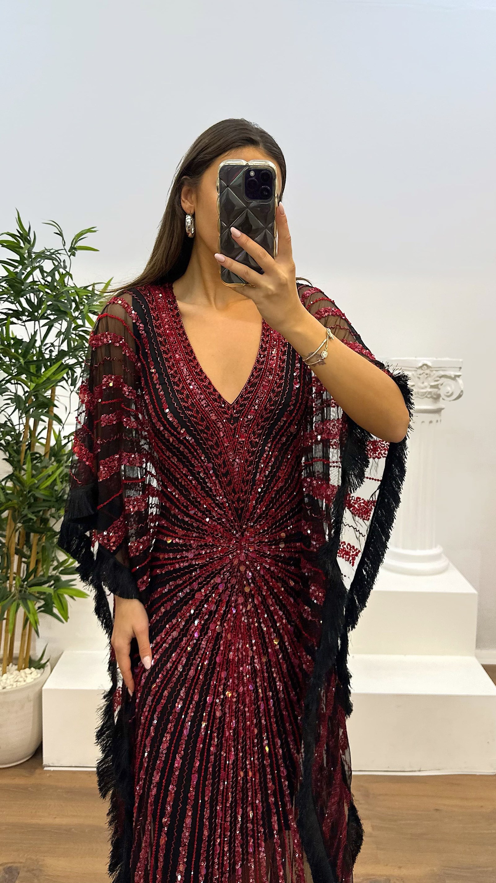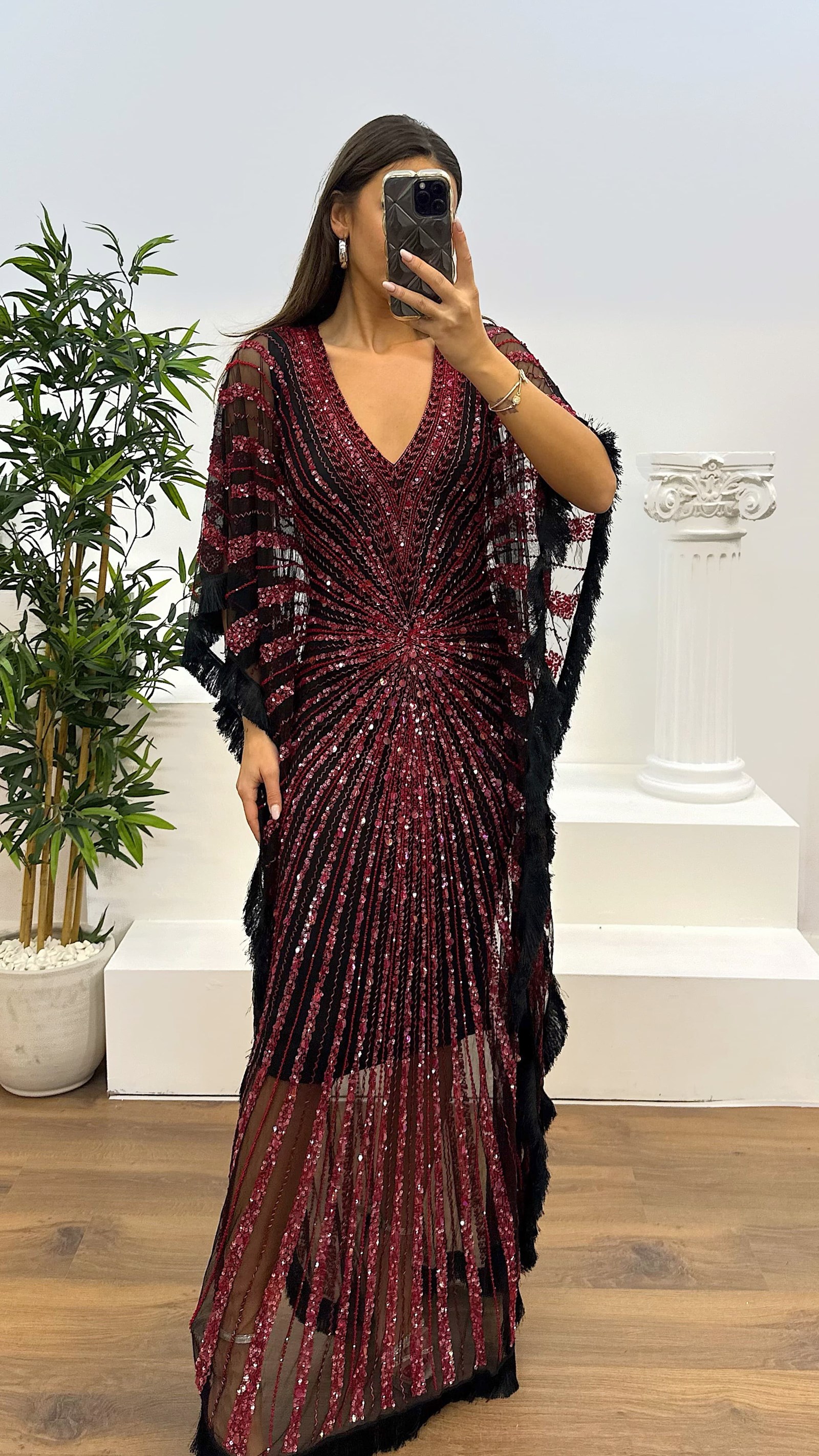 • Kırmızı V Yaka Saçaklı El İşlemesi Tasarım Abiye Elbise