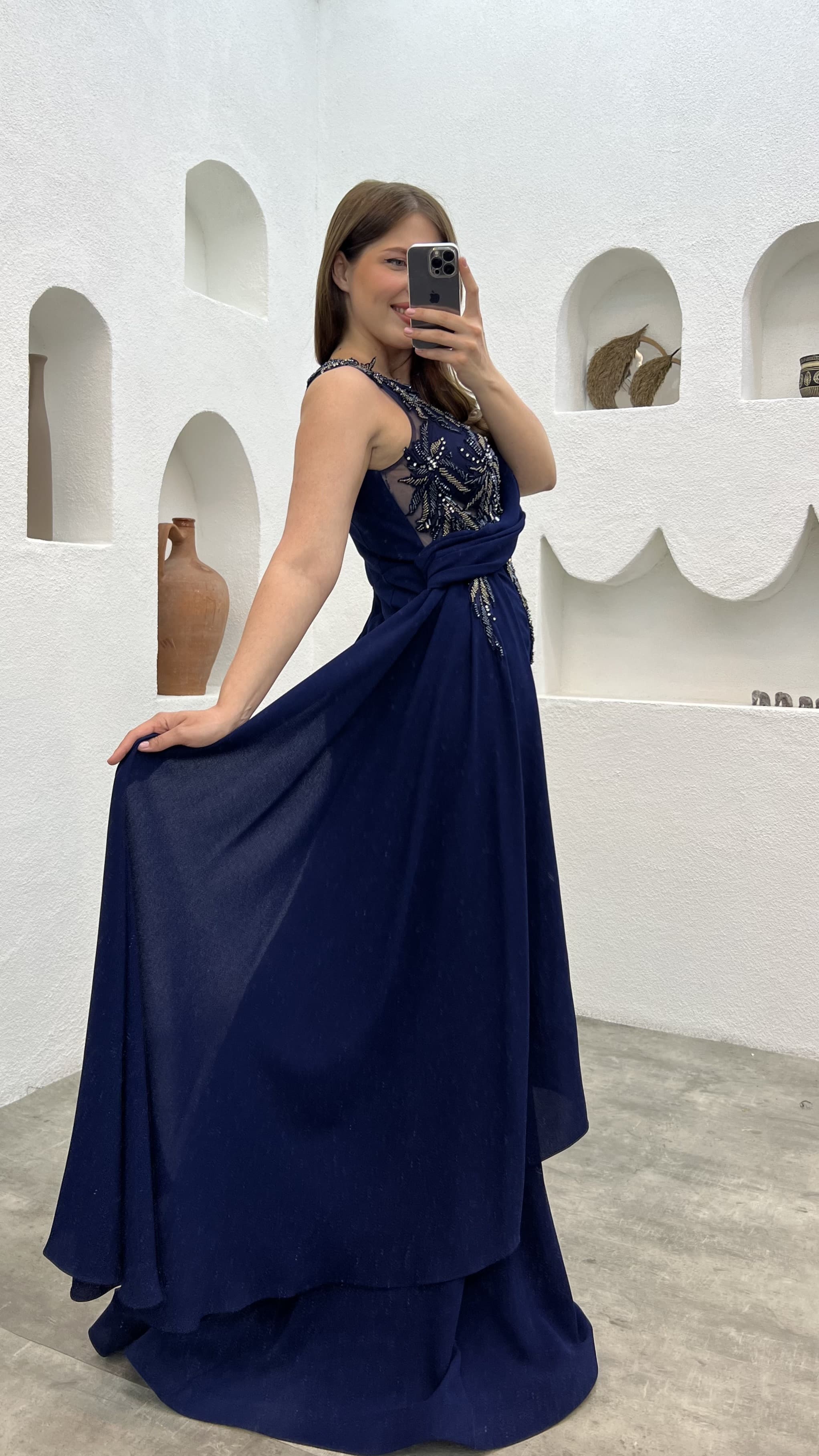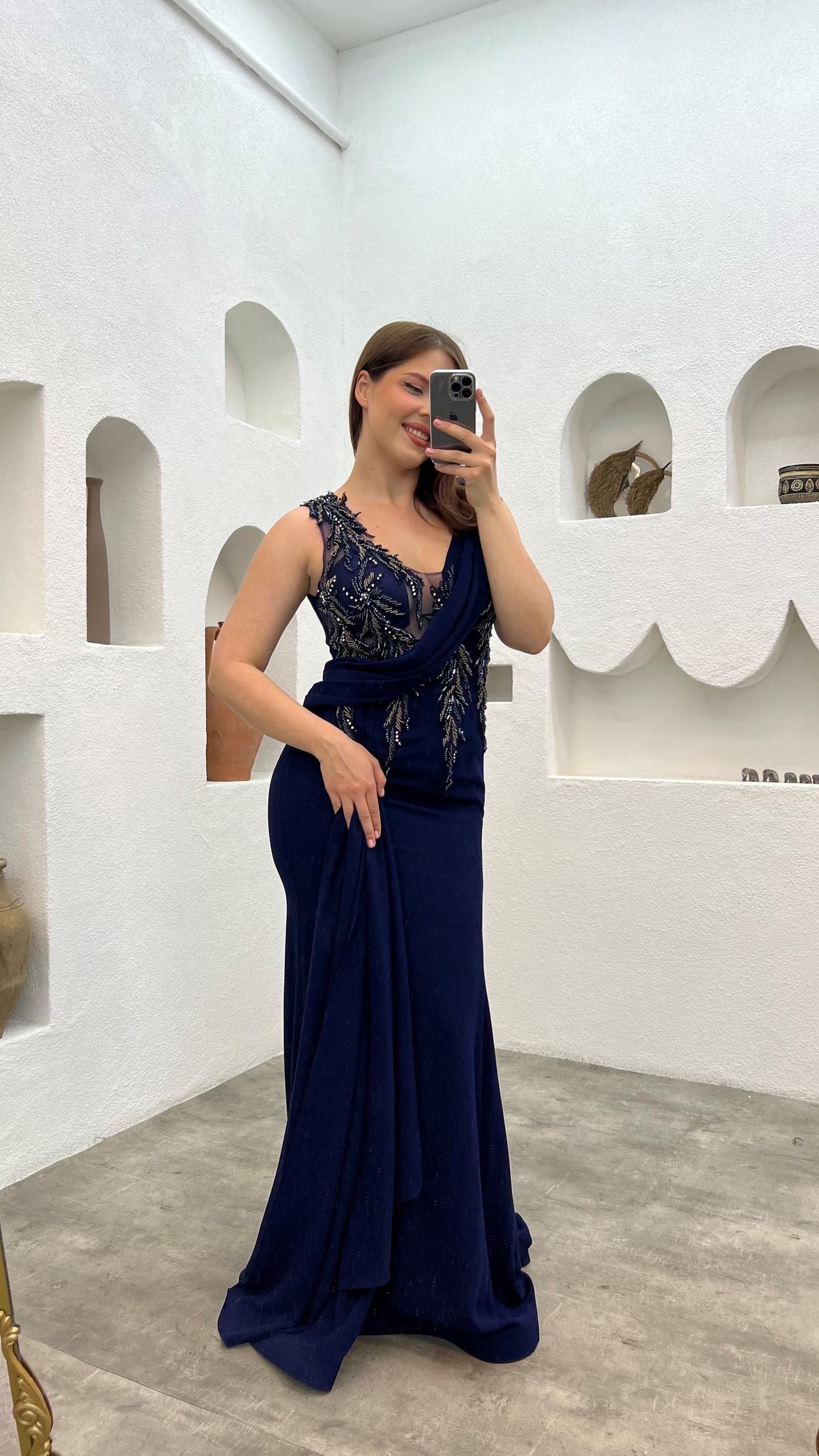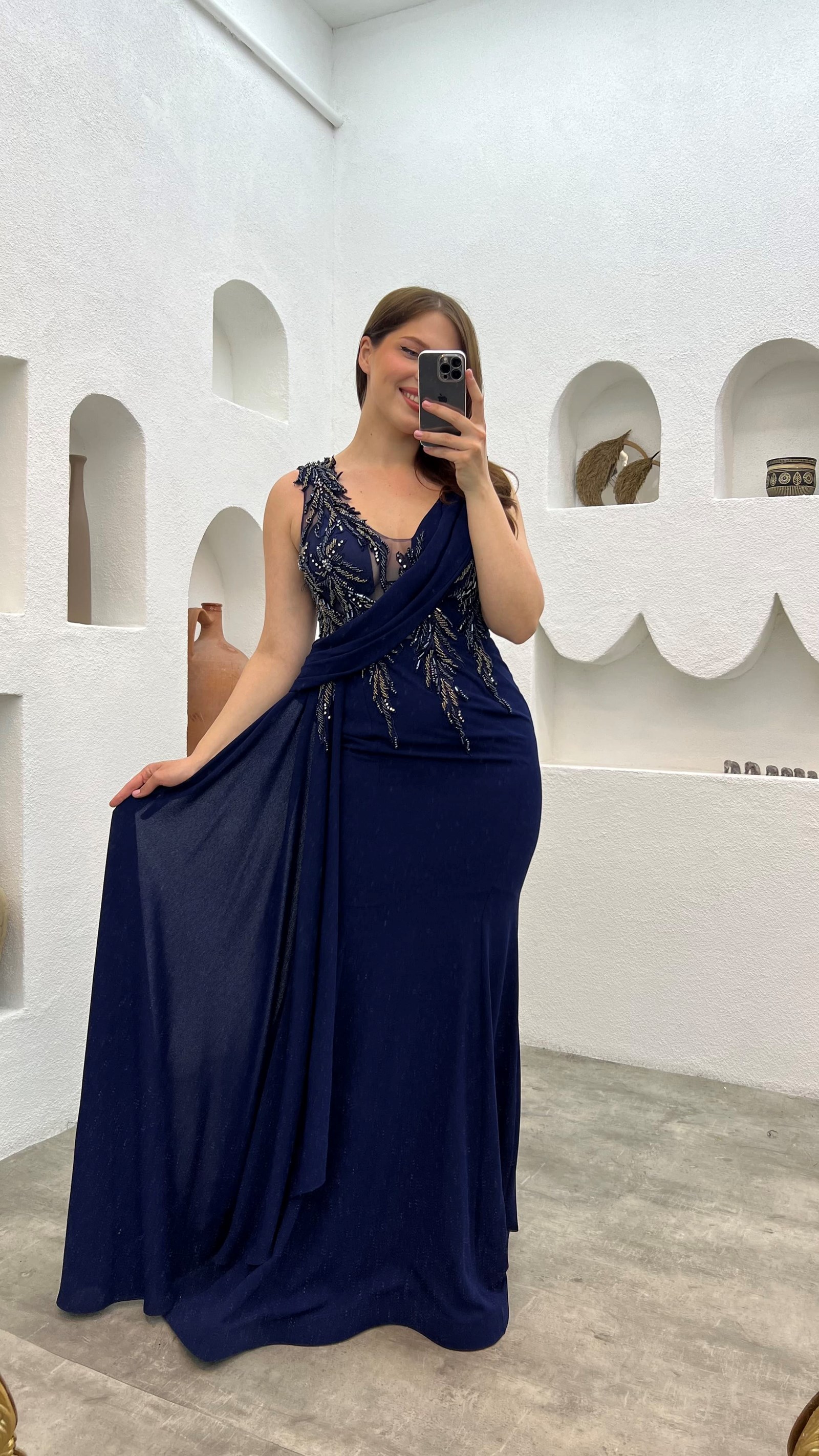 • Lacivert İşlemeli Drapeli Büyük Beden Abiye Elbise