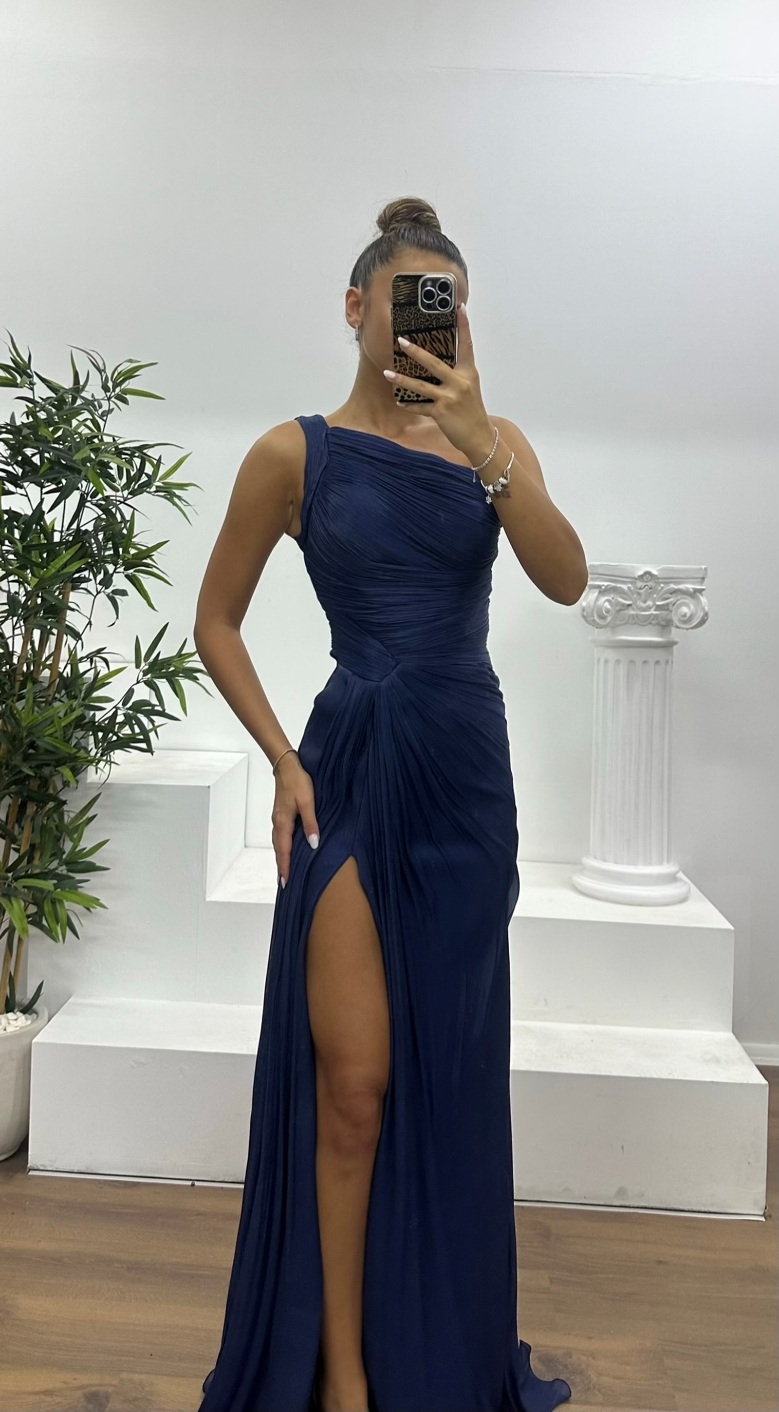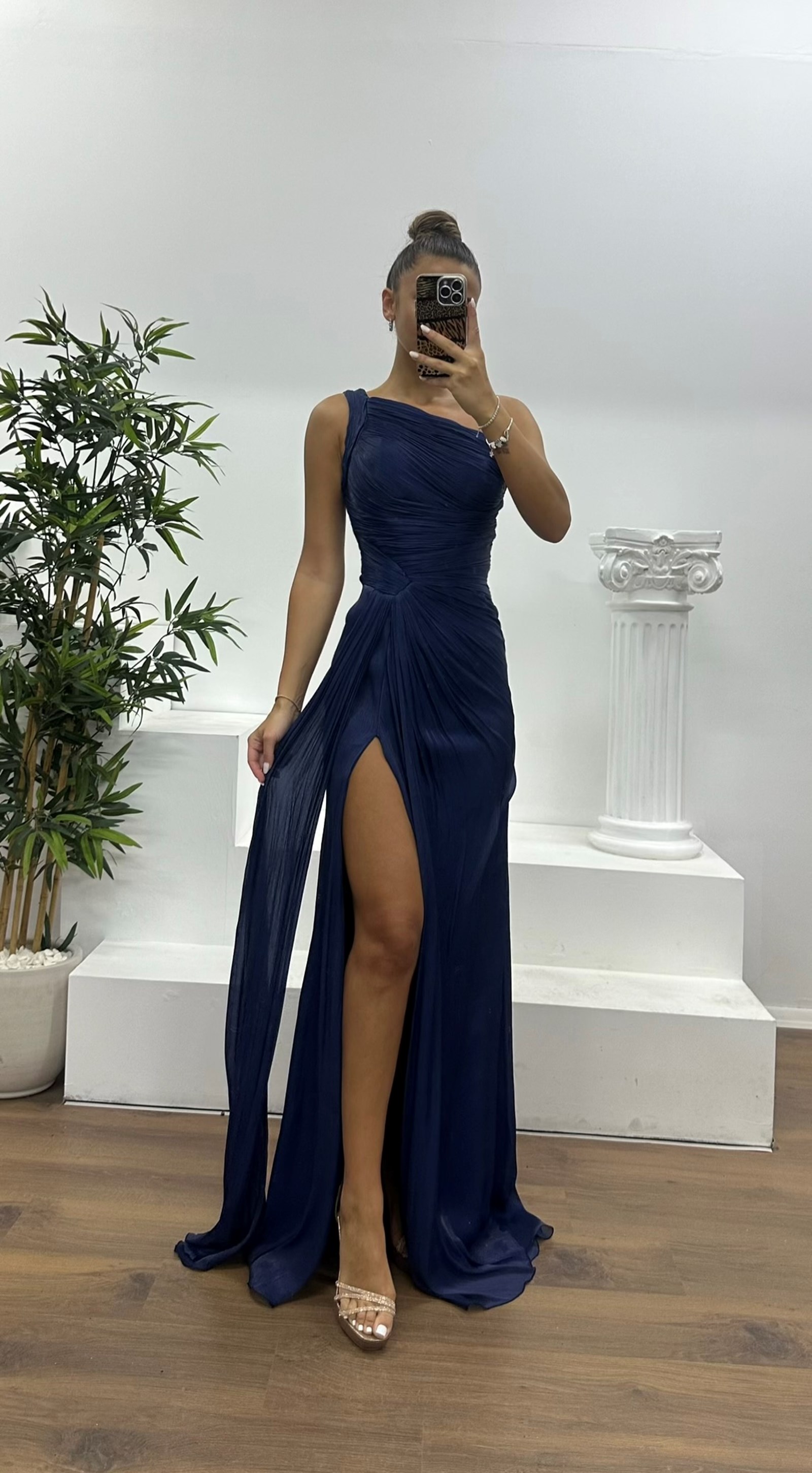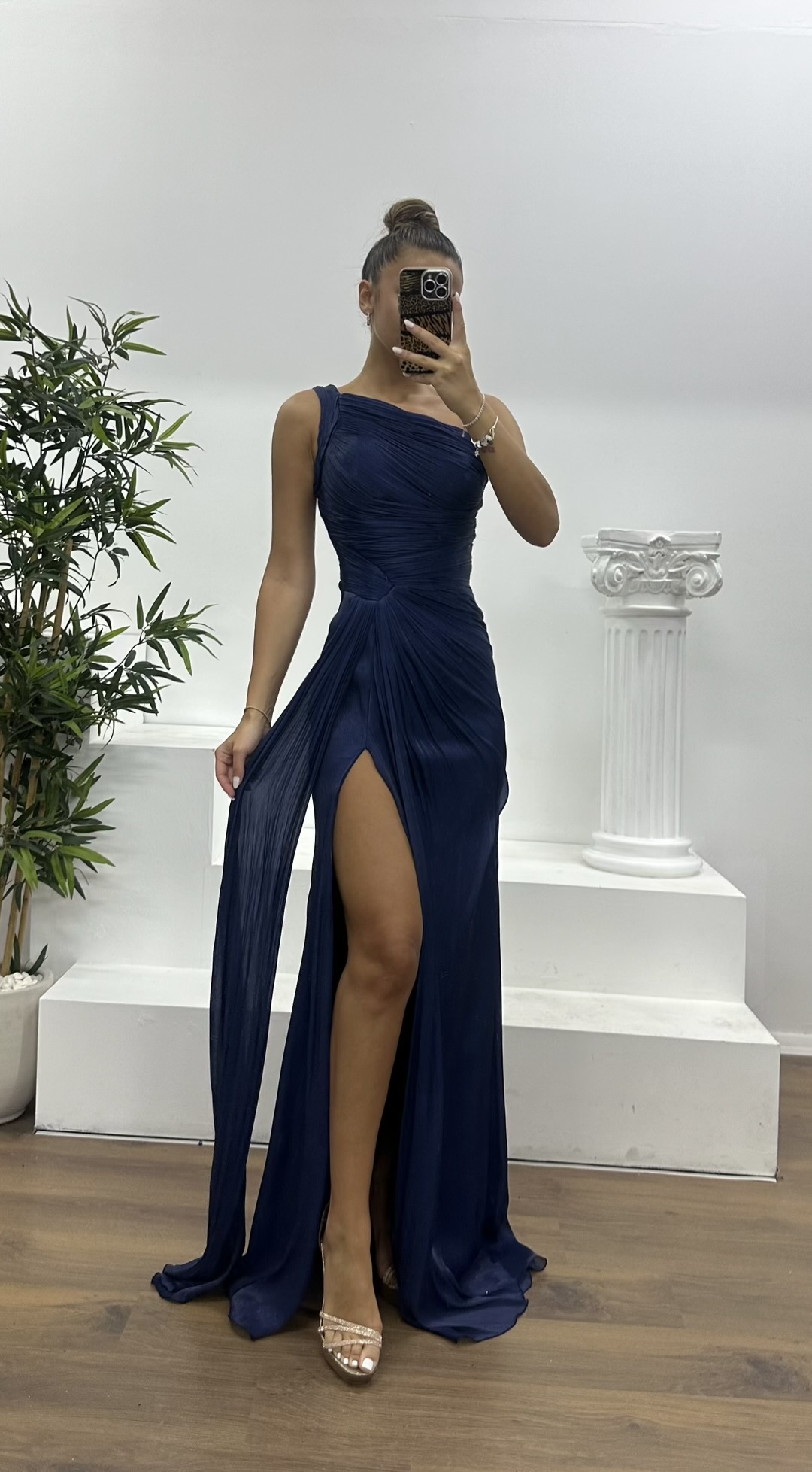 • Lacivert Tek Omuz Drape Detay Şifon Abiye Elbise