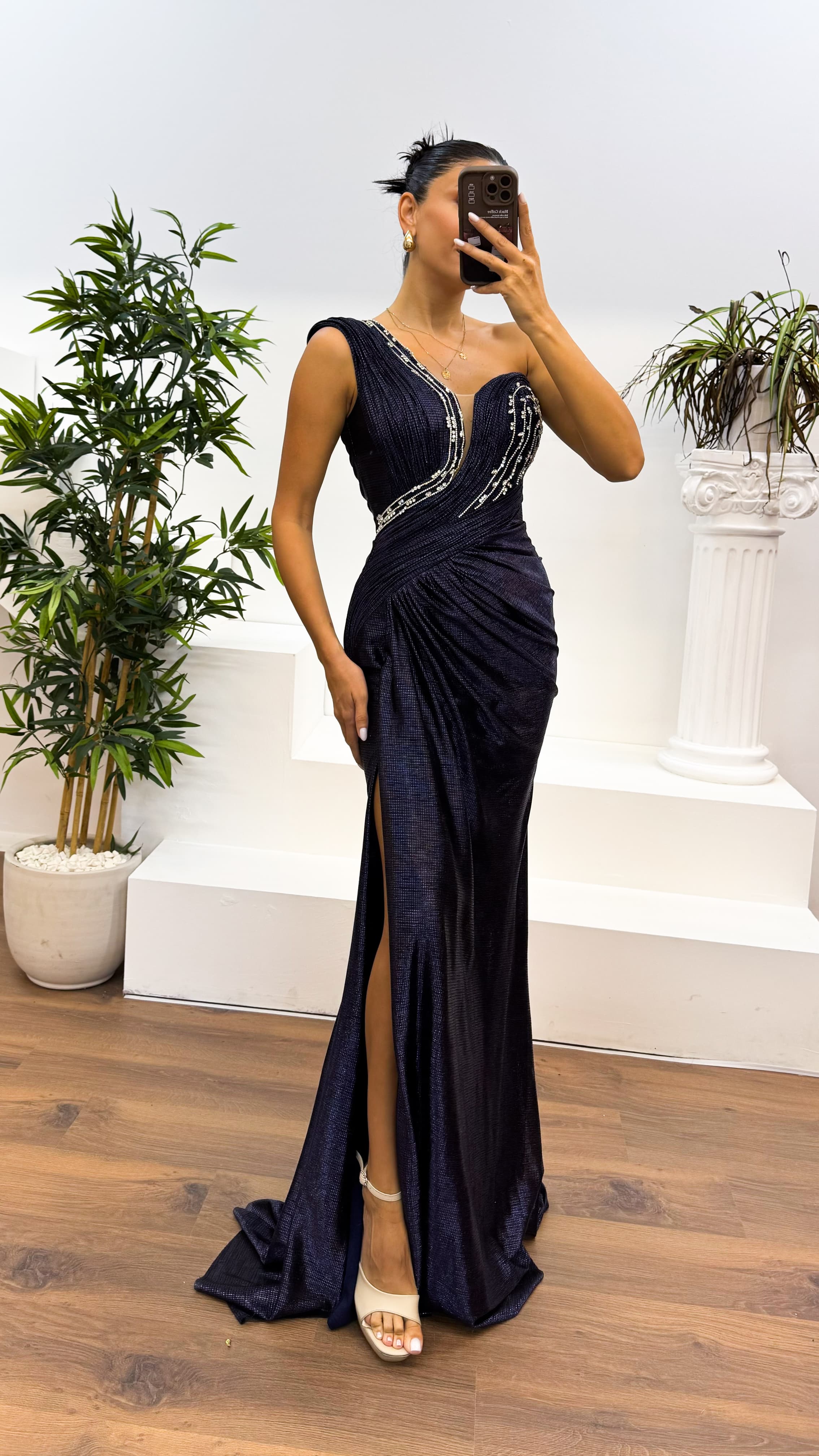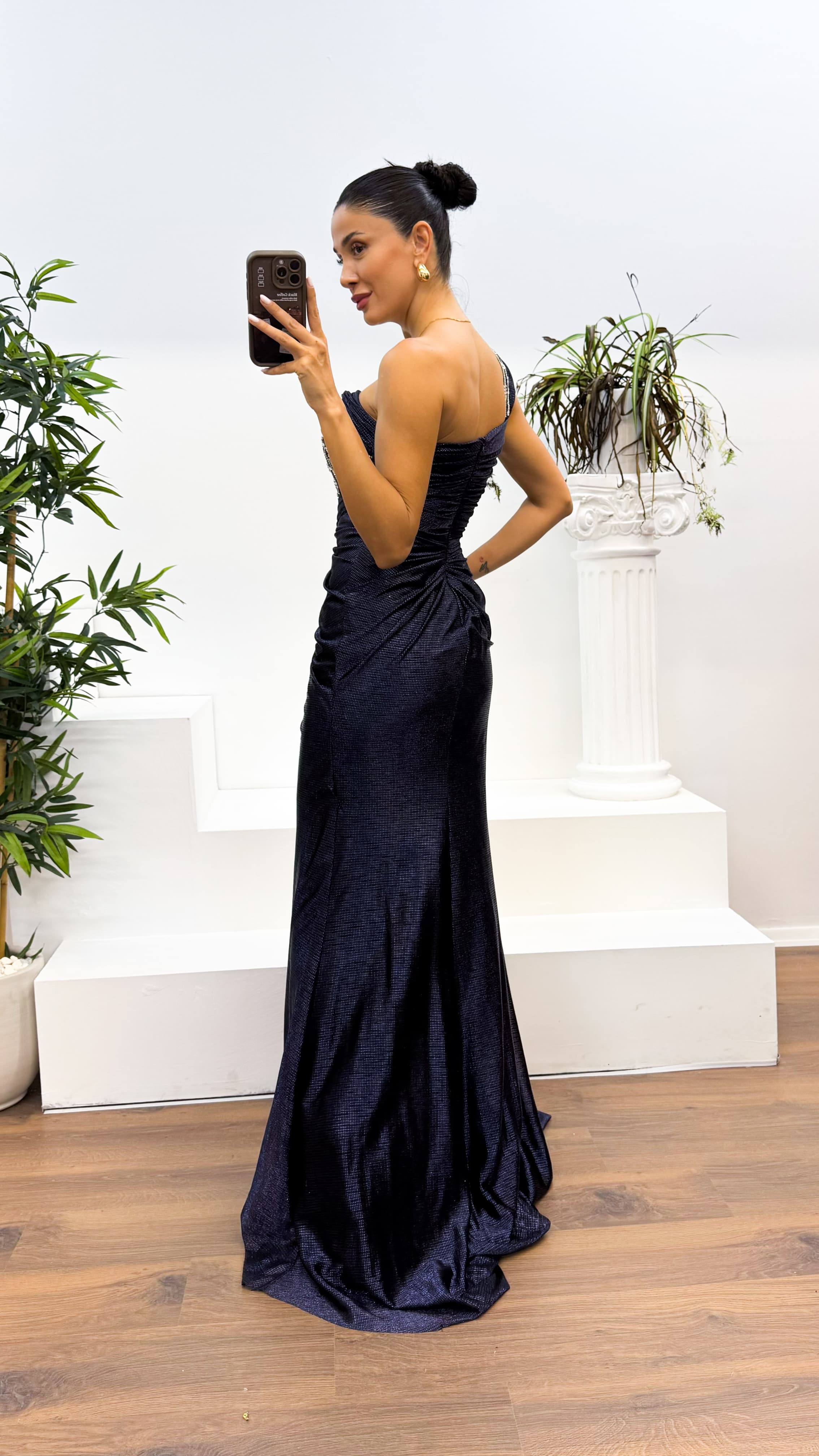 Lacivert Tek Omuz İşleme Detay Abiye Elbise