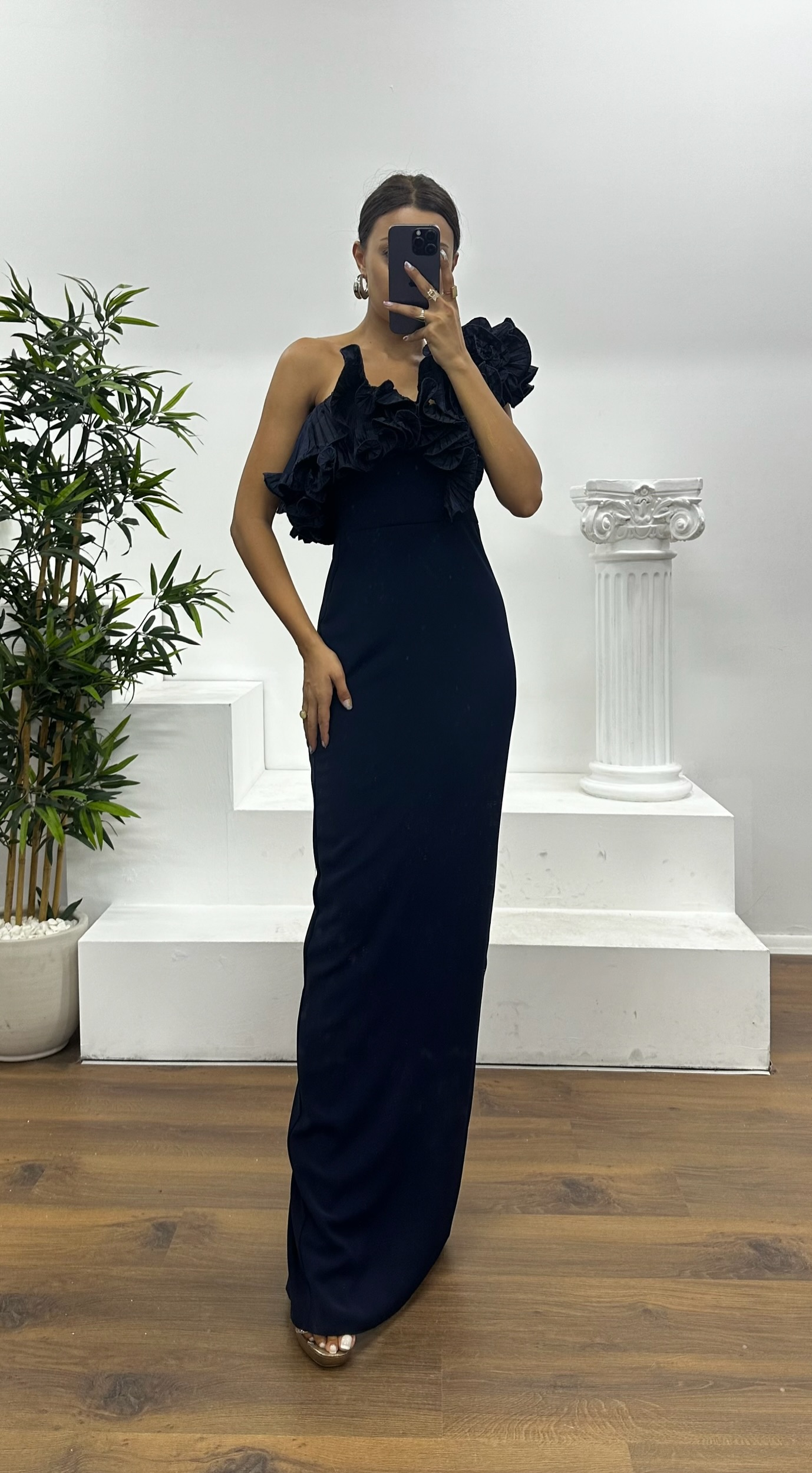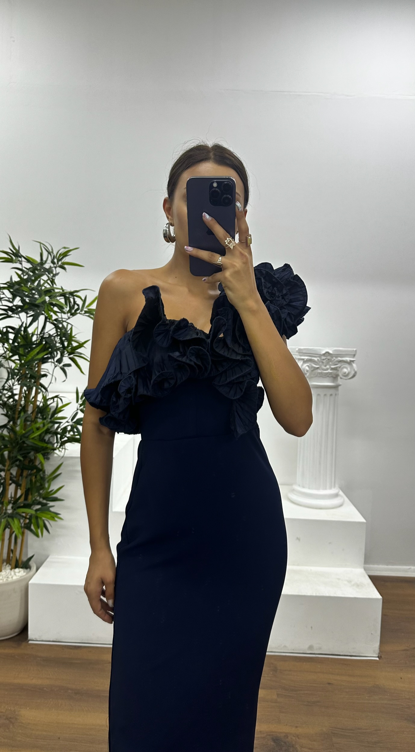 • Lacivert Tek Omuz Volanlı Abiye Elbise