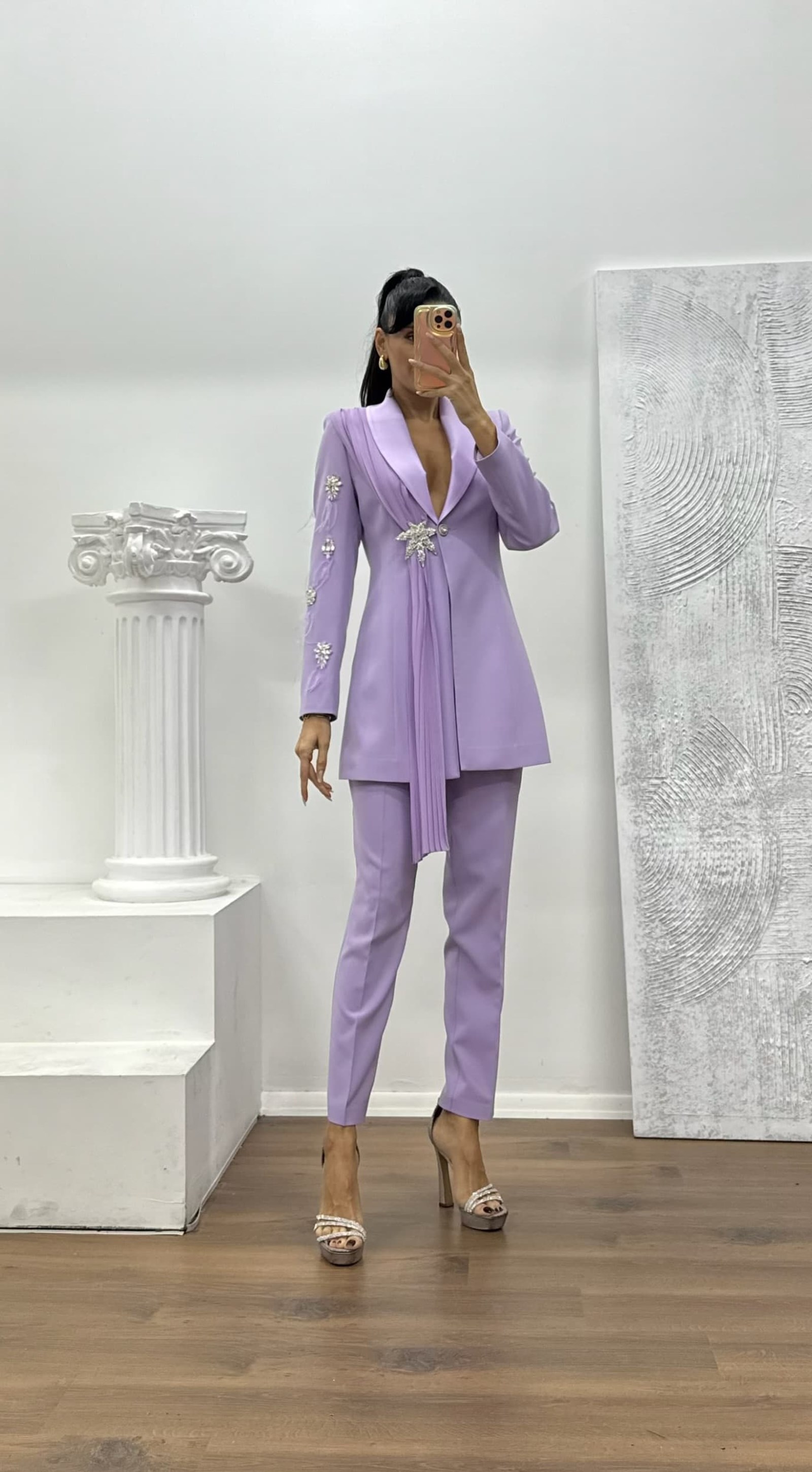 Lila Broş Detaylı Ceket - Pantolon Takım Abiye