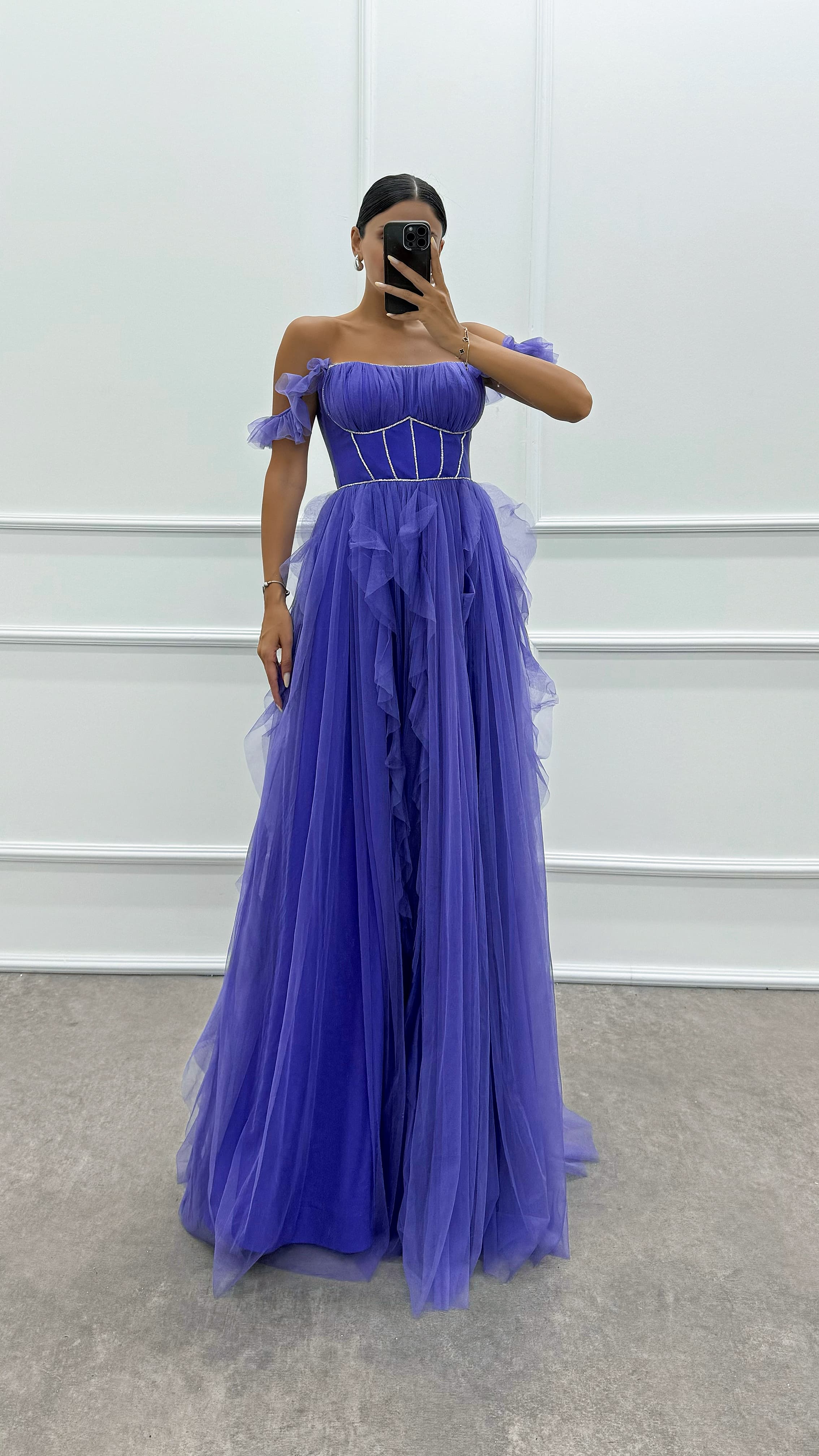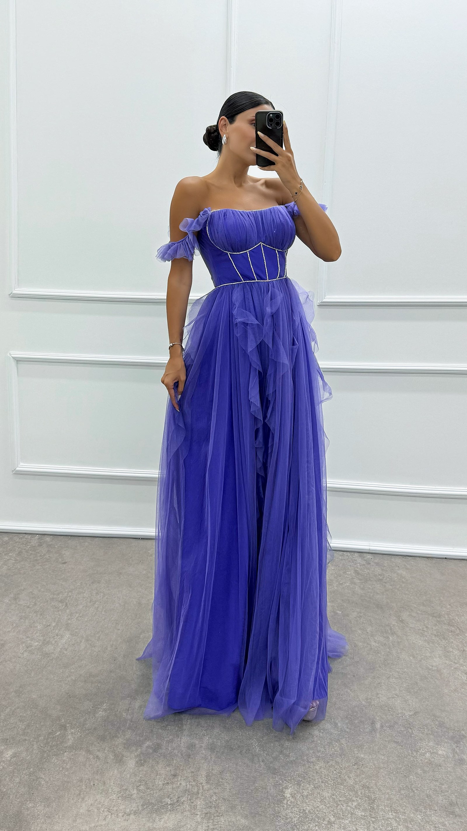 • Kırmızı Omuz Detay Tasarım Tül Elbise