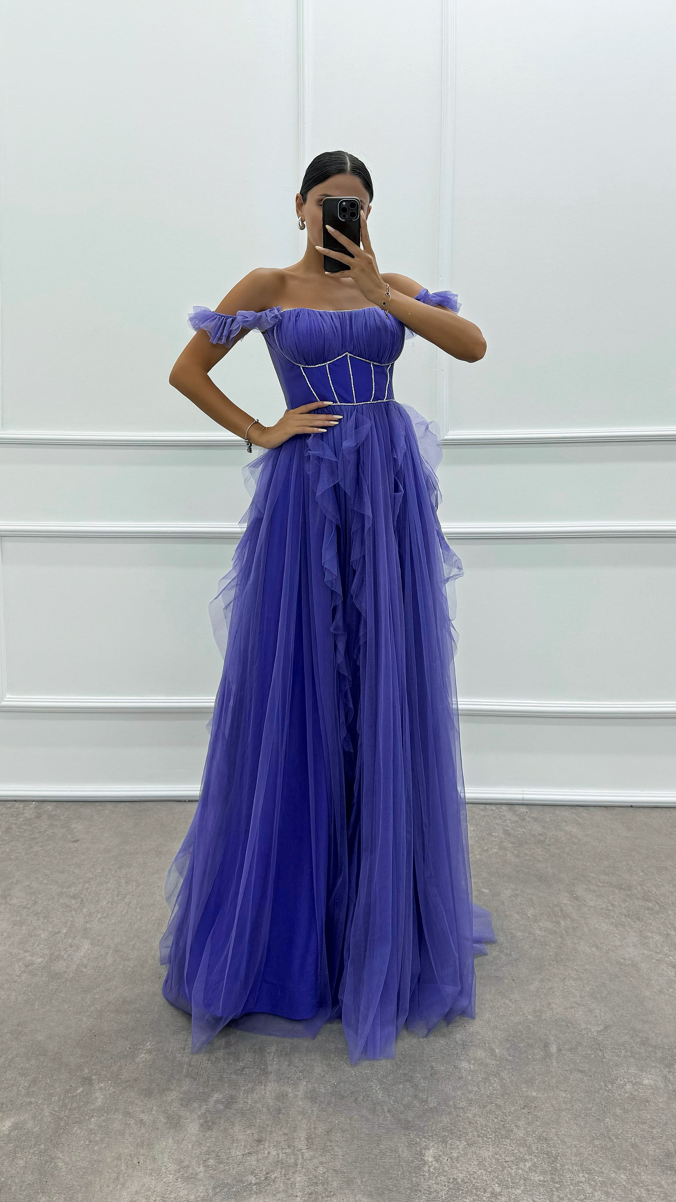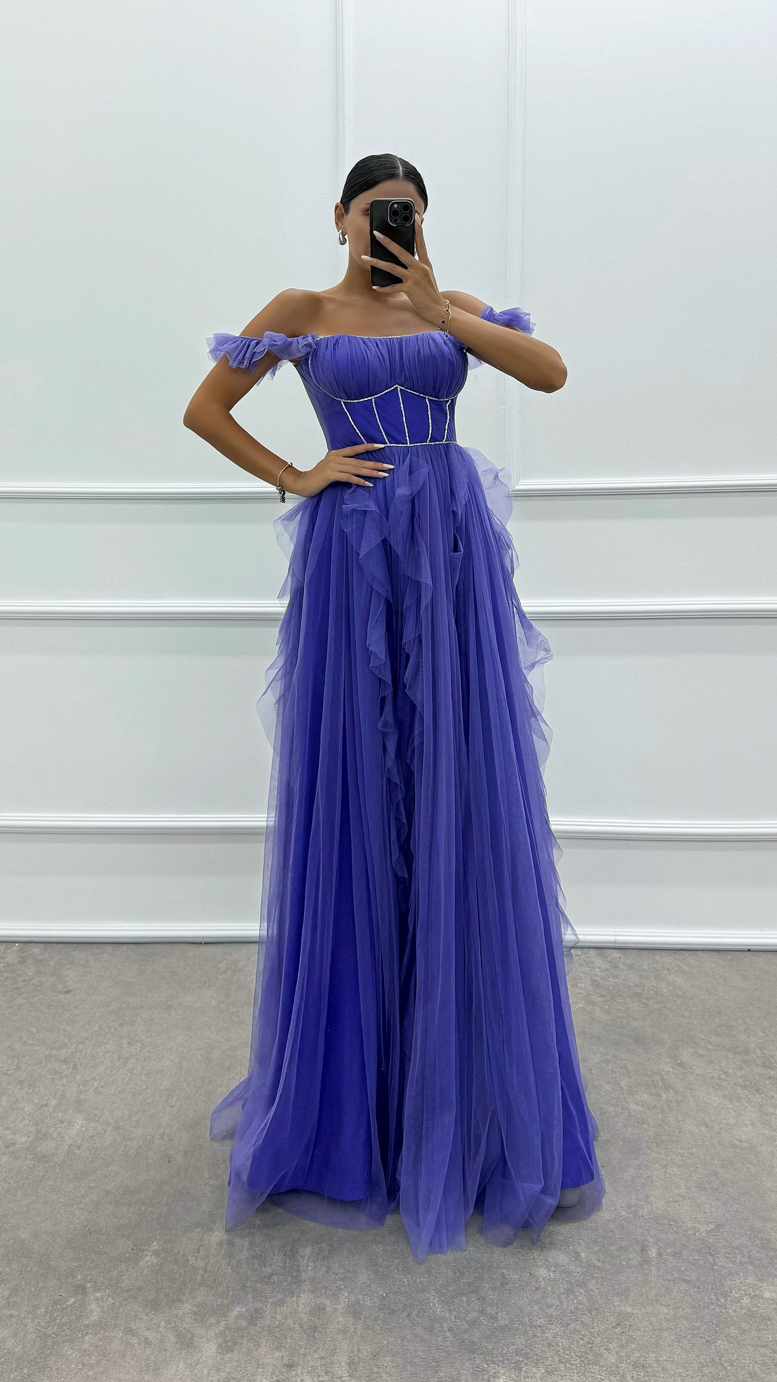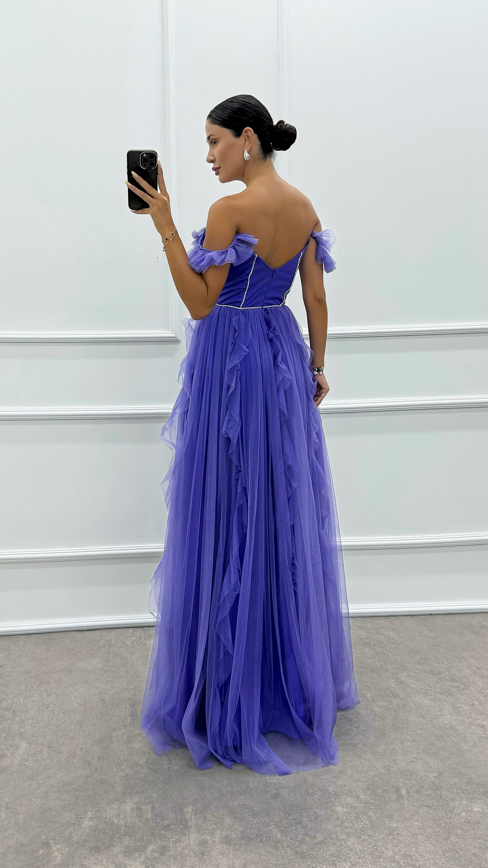 • Yeşil Omuz Detay Tasarım Tül Elbise