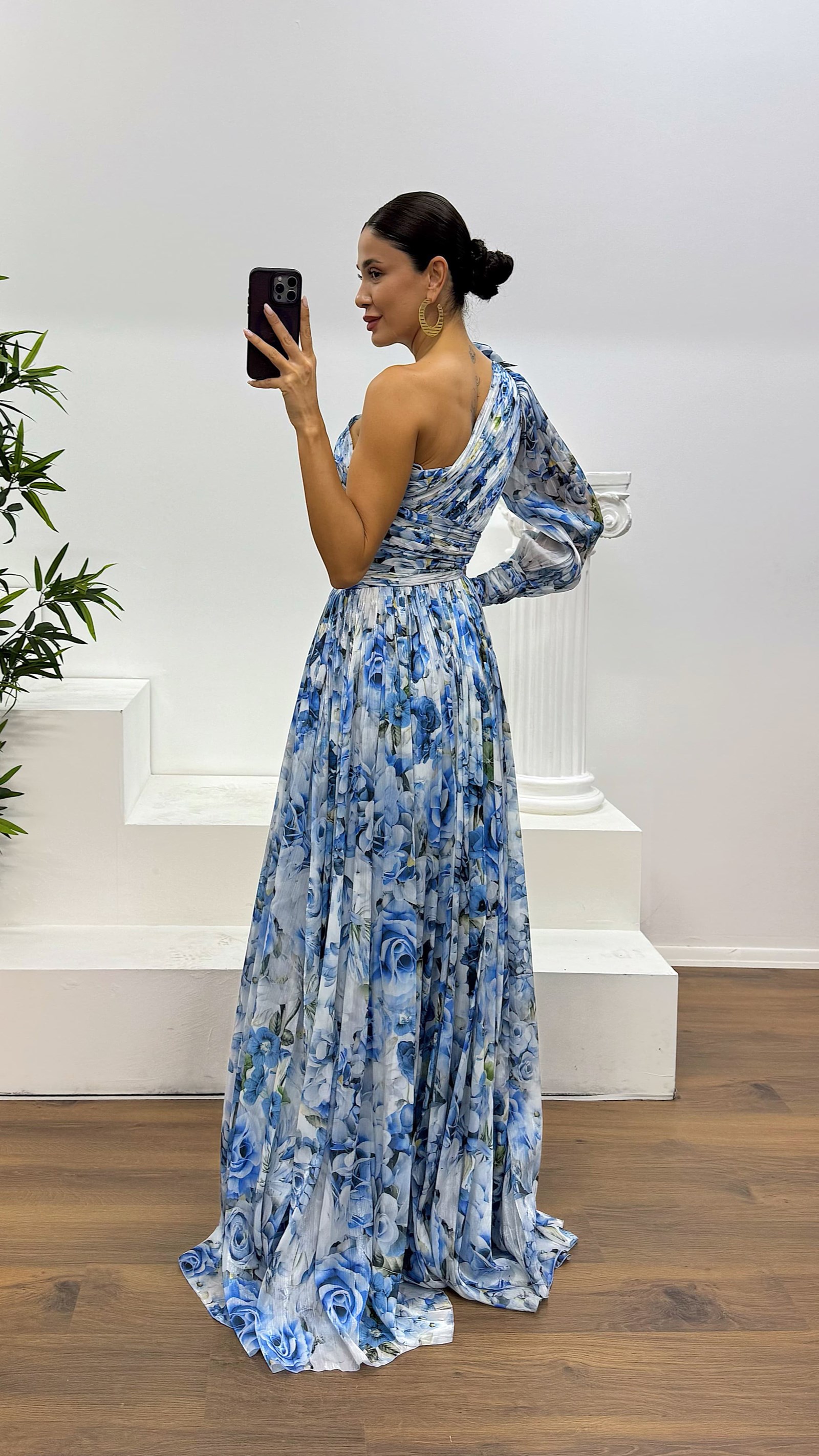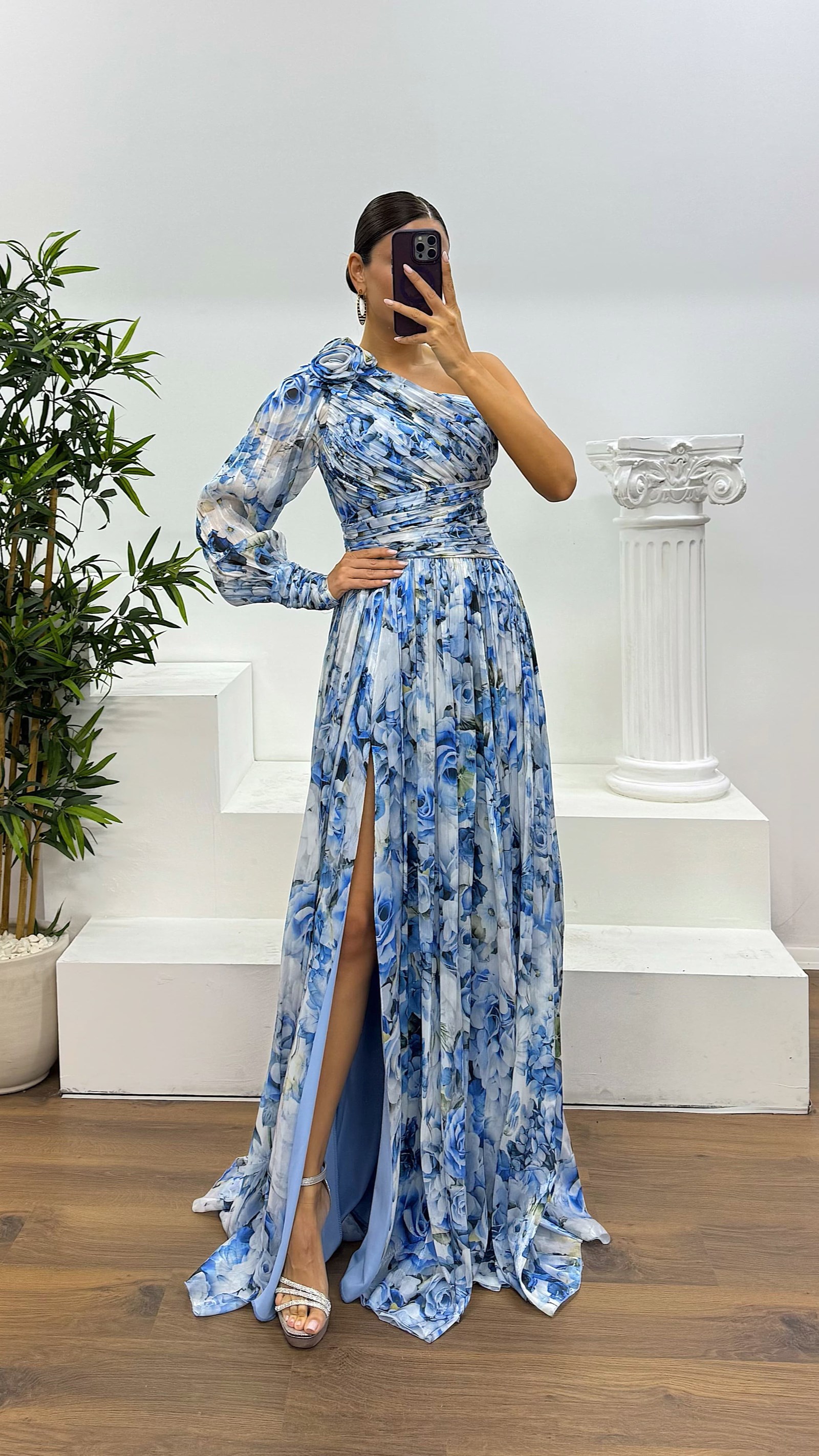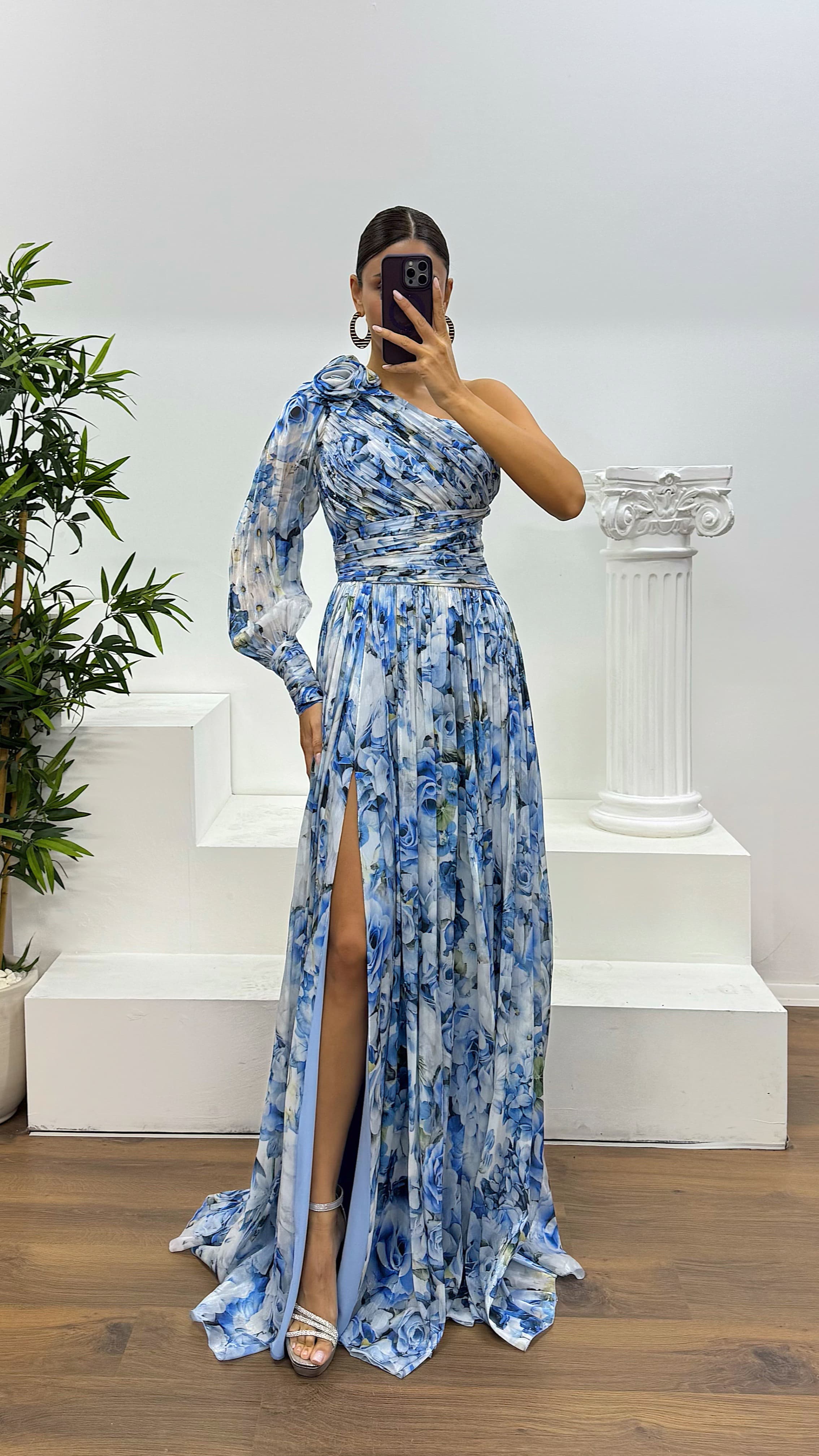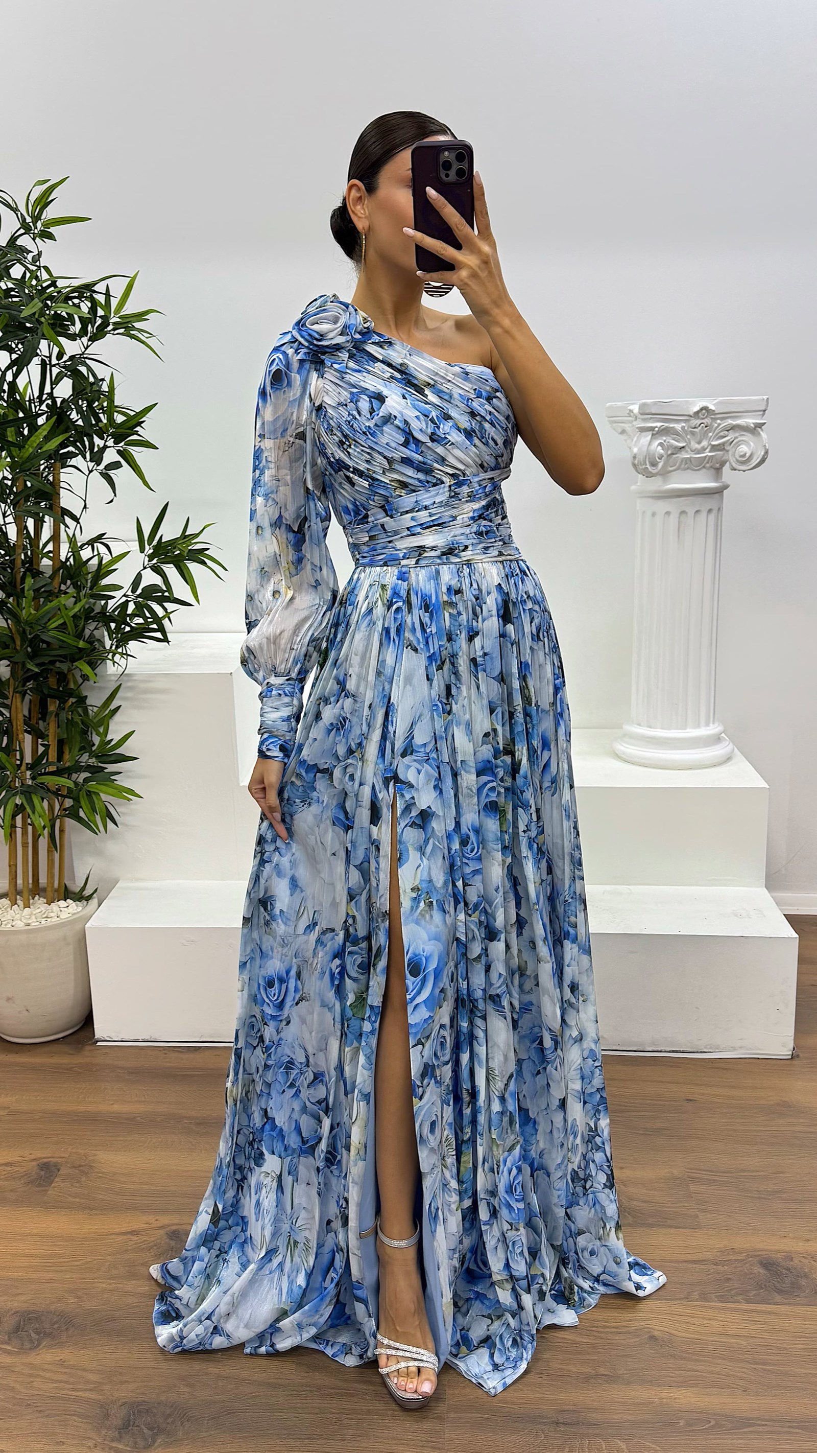 فستان سهرة أزرق منقوش بأكمام واحدة