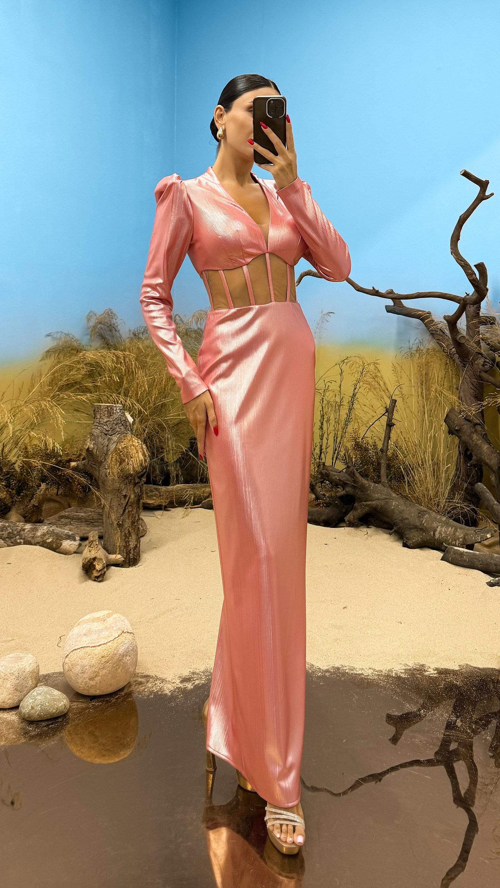 • Pembe Uzun Kol Bel Transparan Abiye Elbise