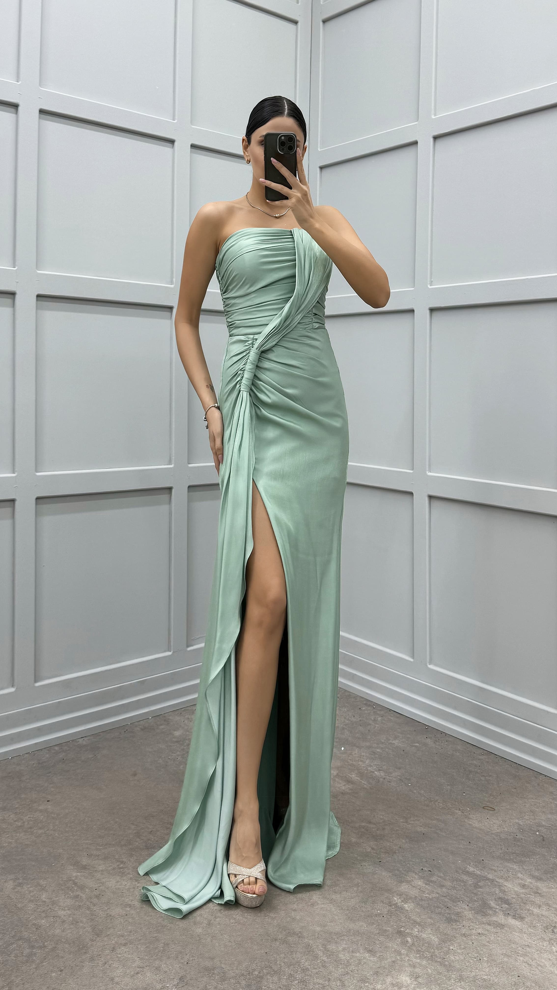 Mint Yeşili Straplez Bel Detay Tasarım Abiye