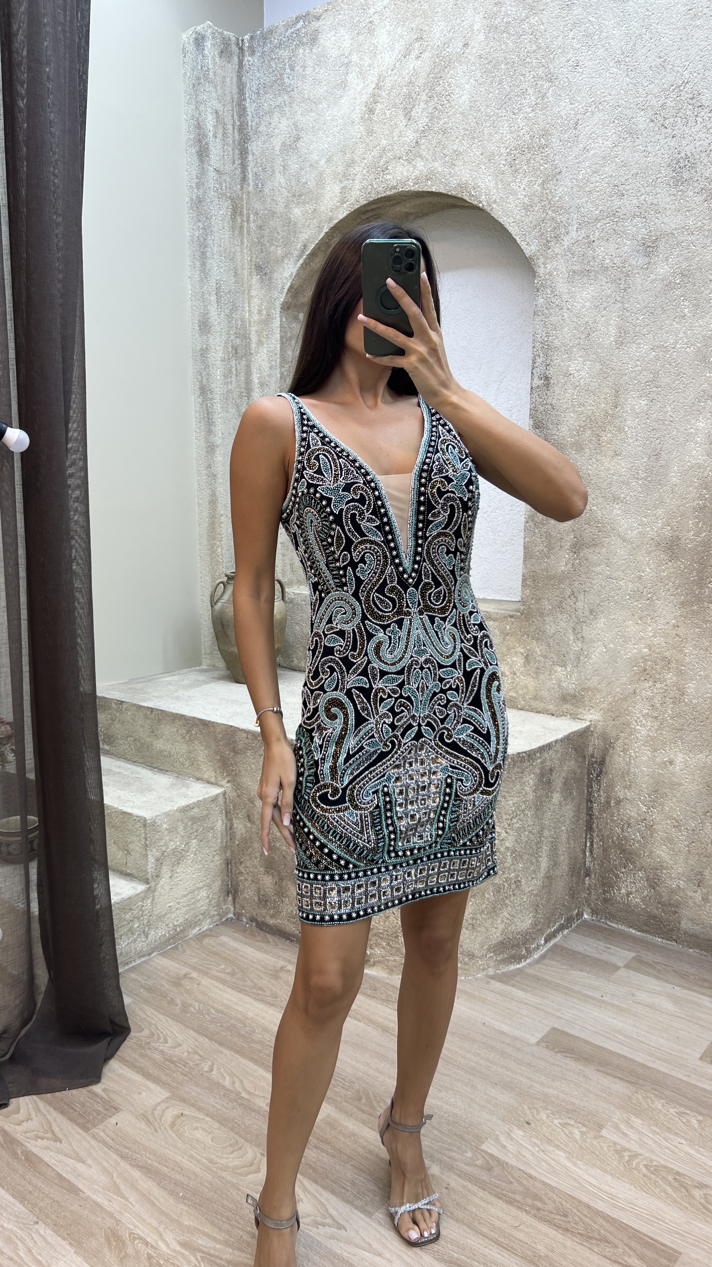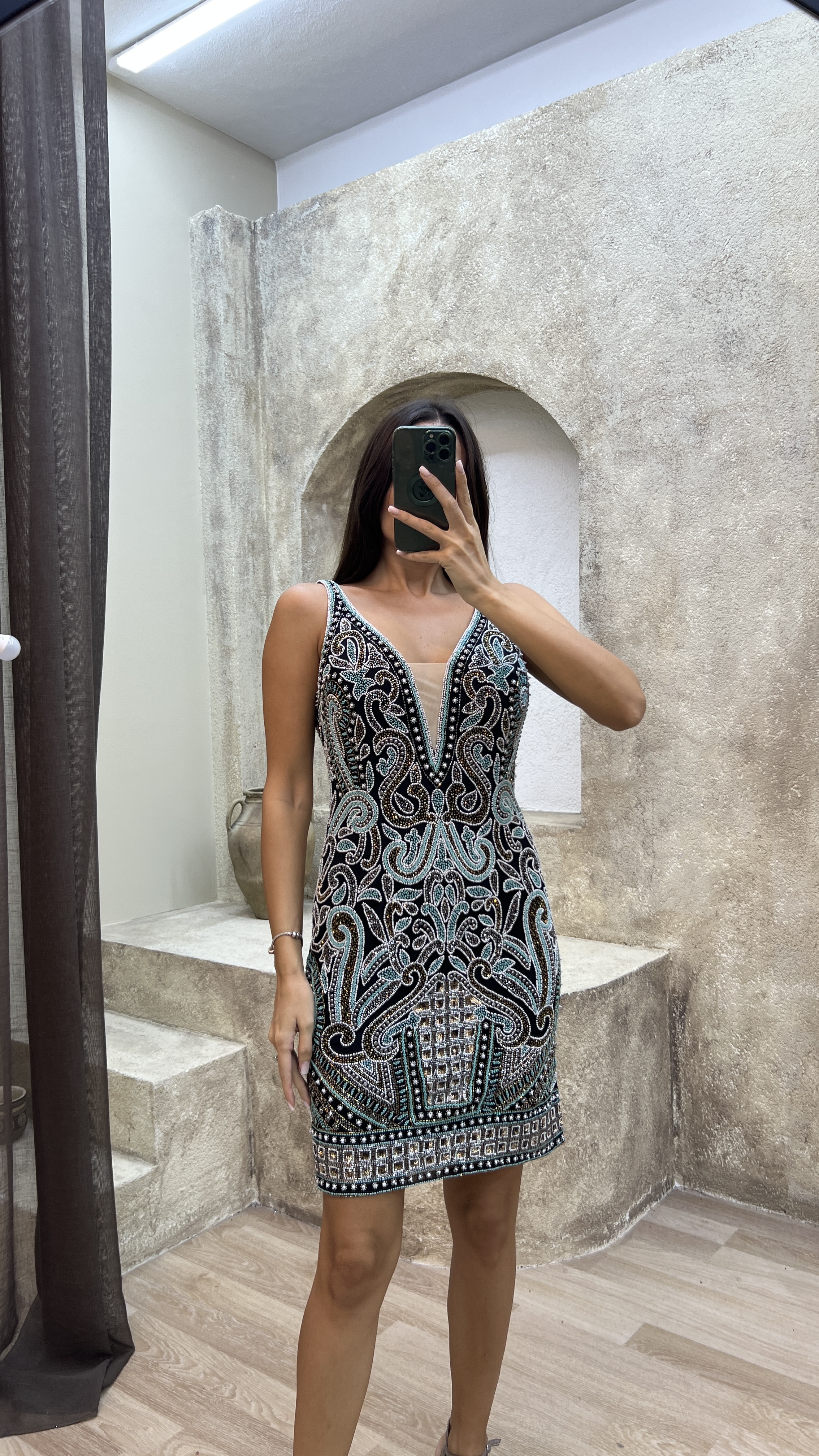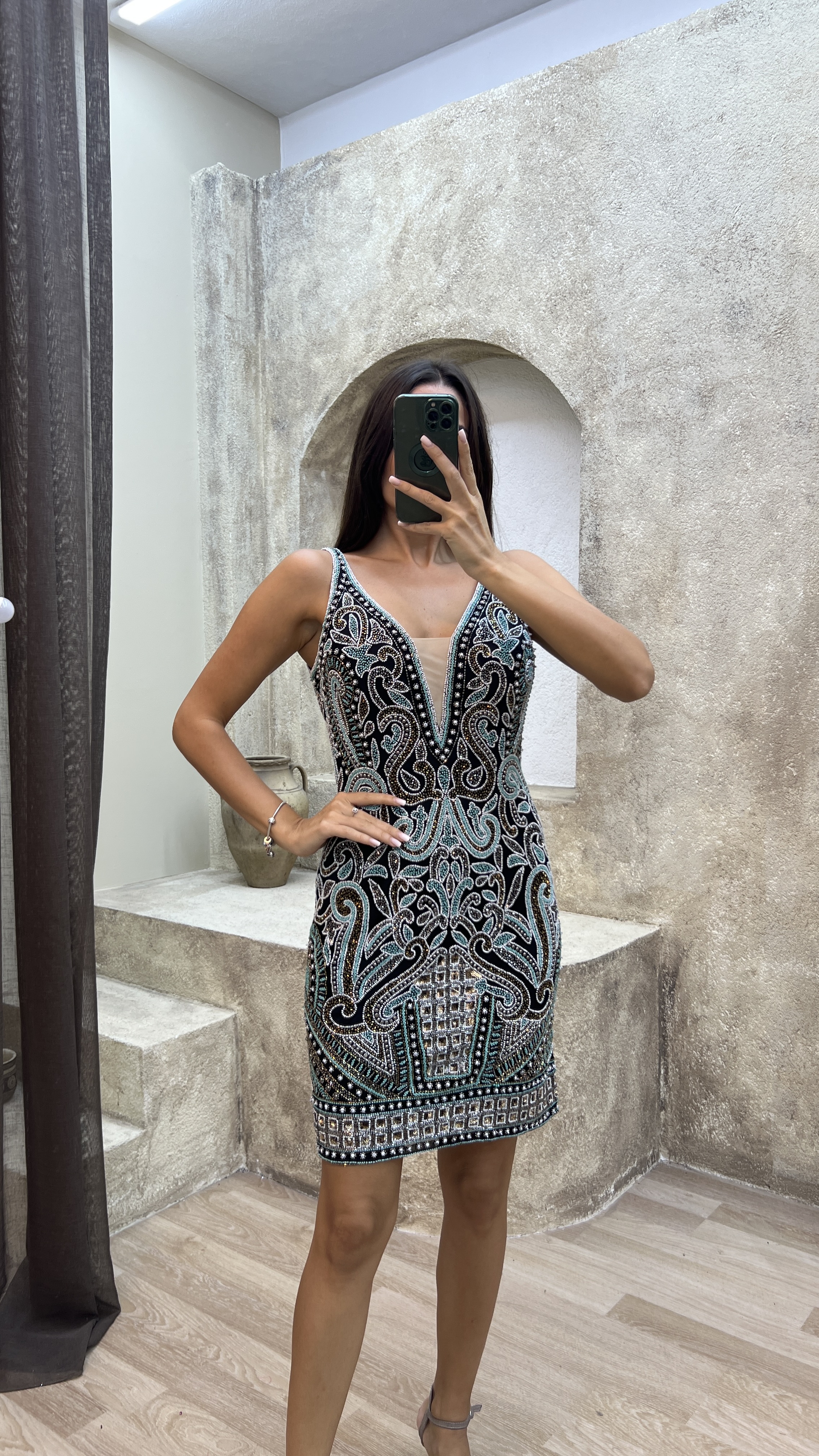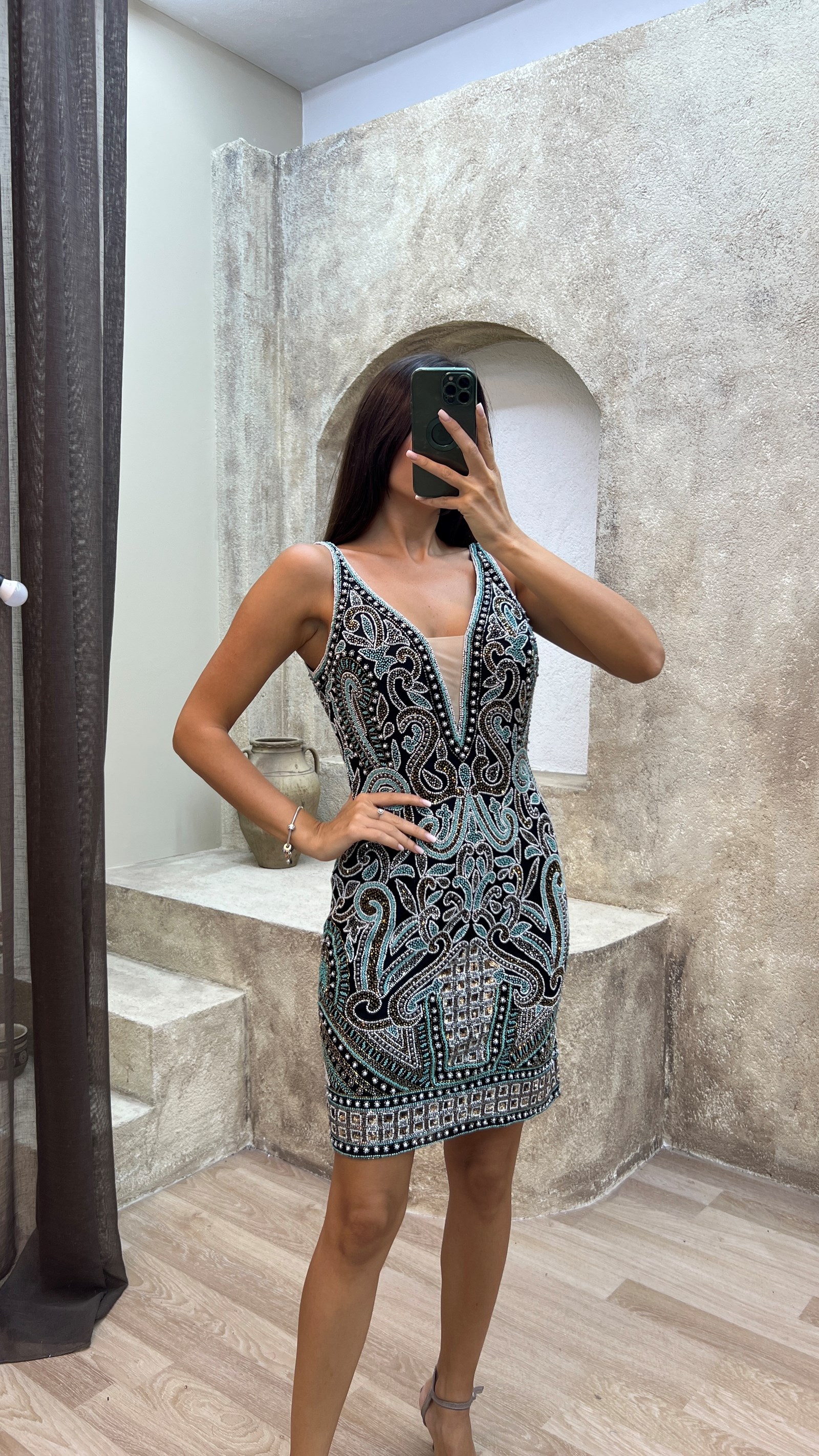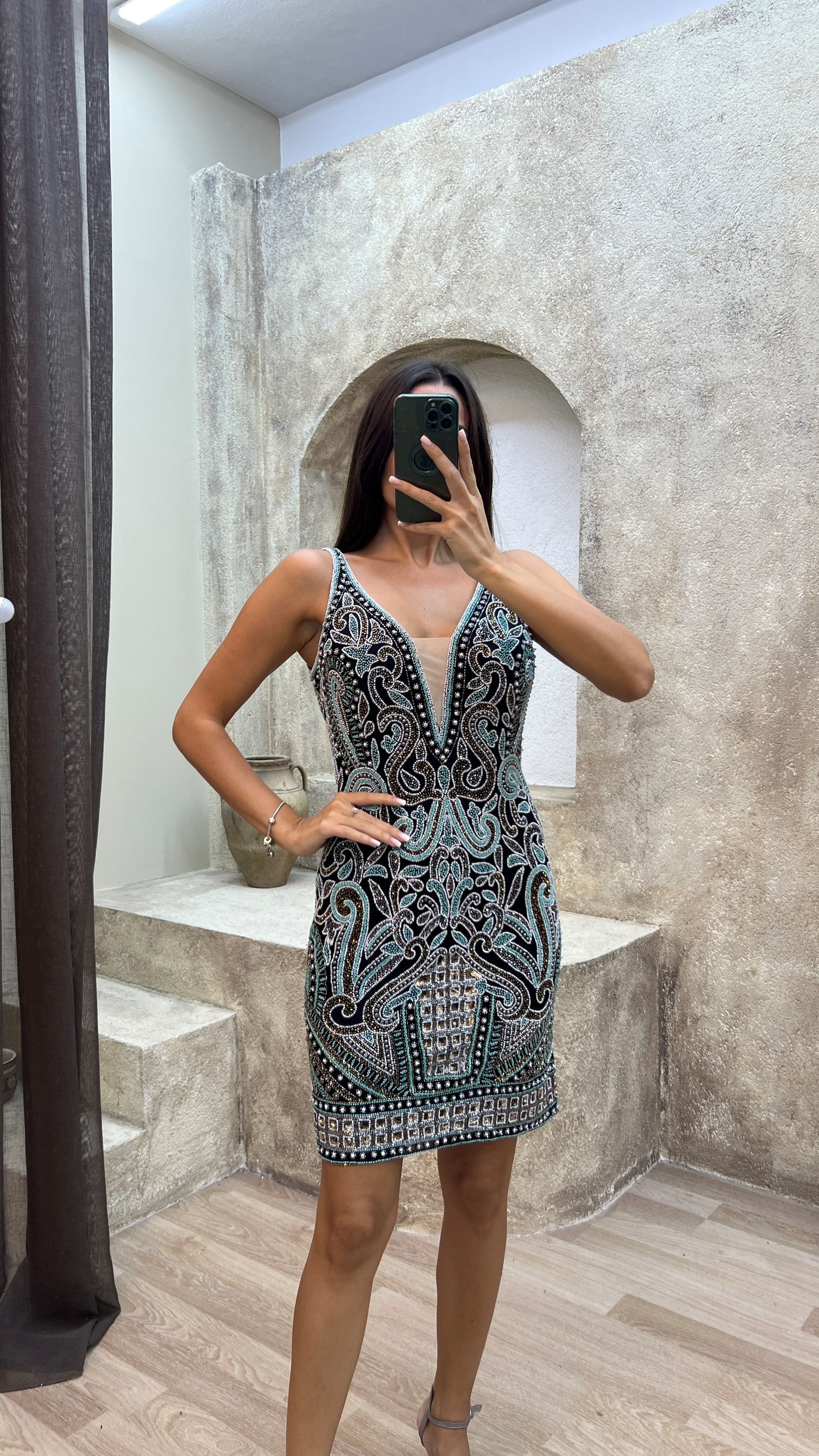 • Turkuaz V Yaka Göğüs Detay Özel İşlemeli Tasarım Elbise