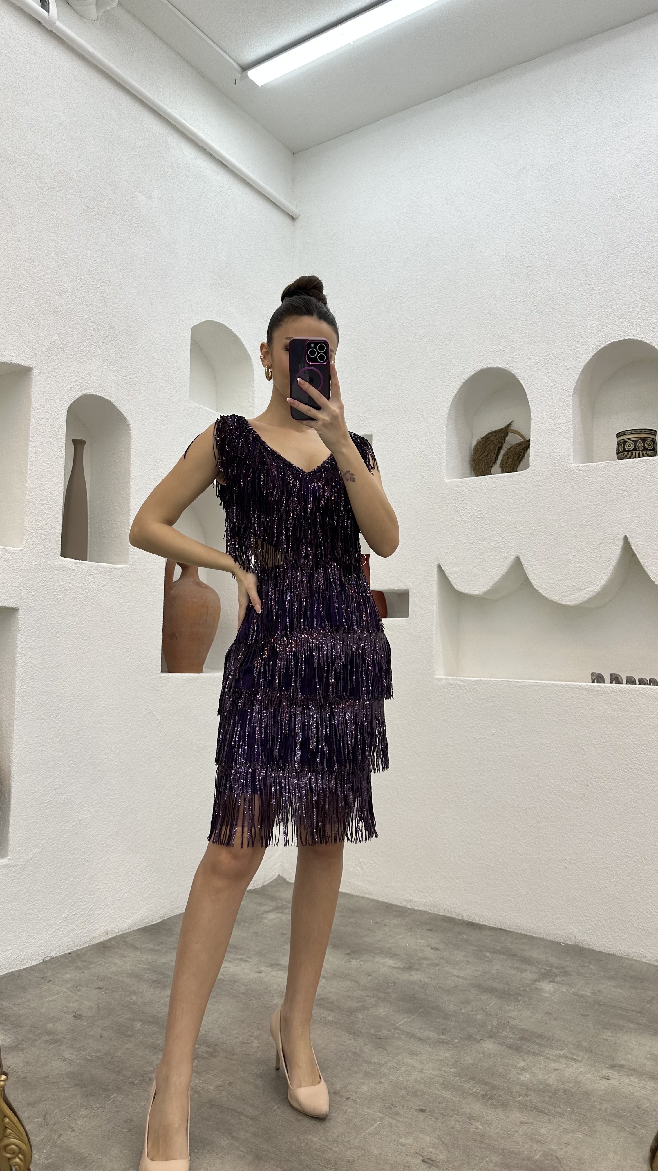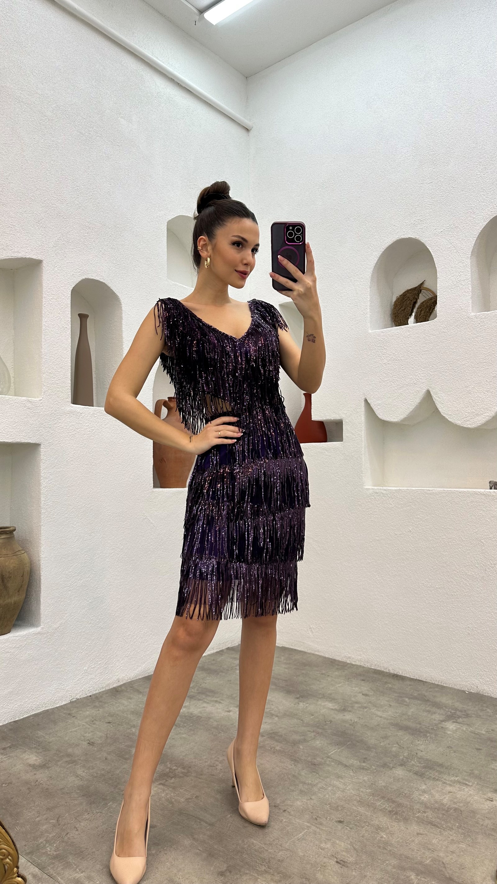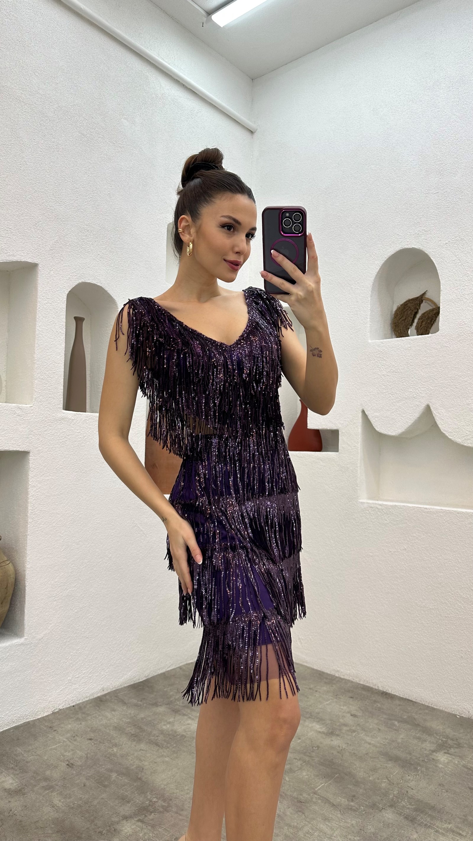 • Mor Bel Detay Saçaklı Abiye Elbise