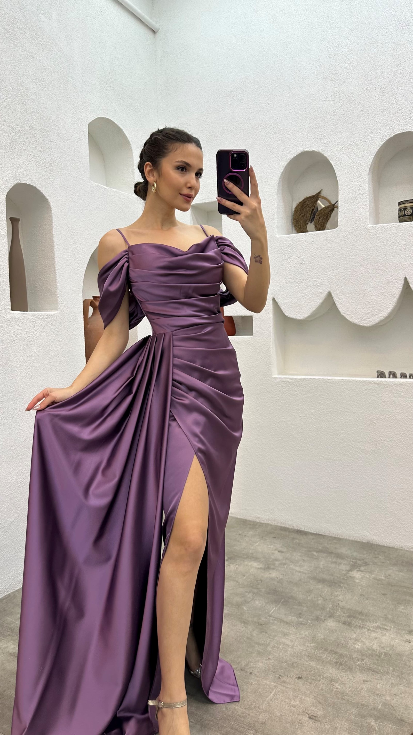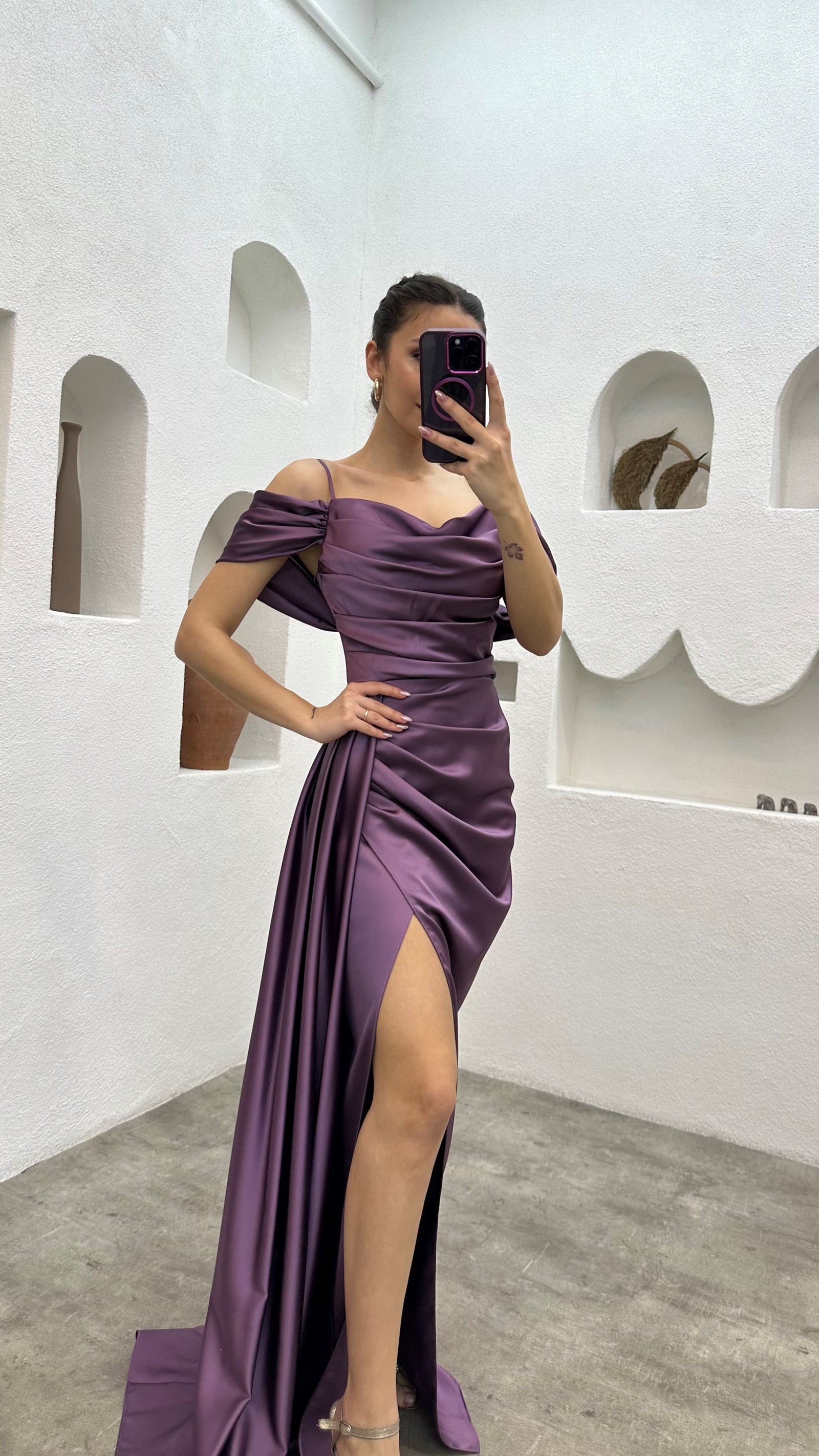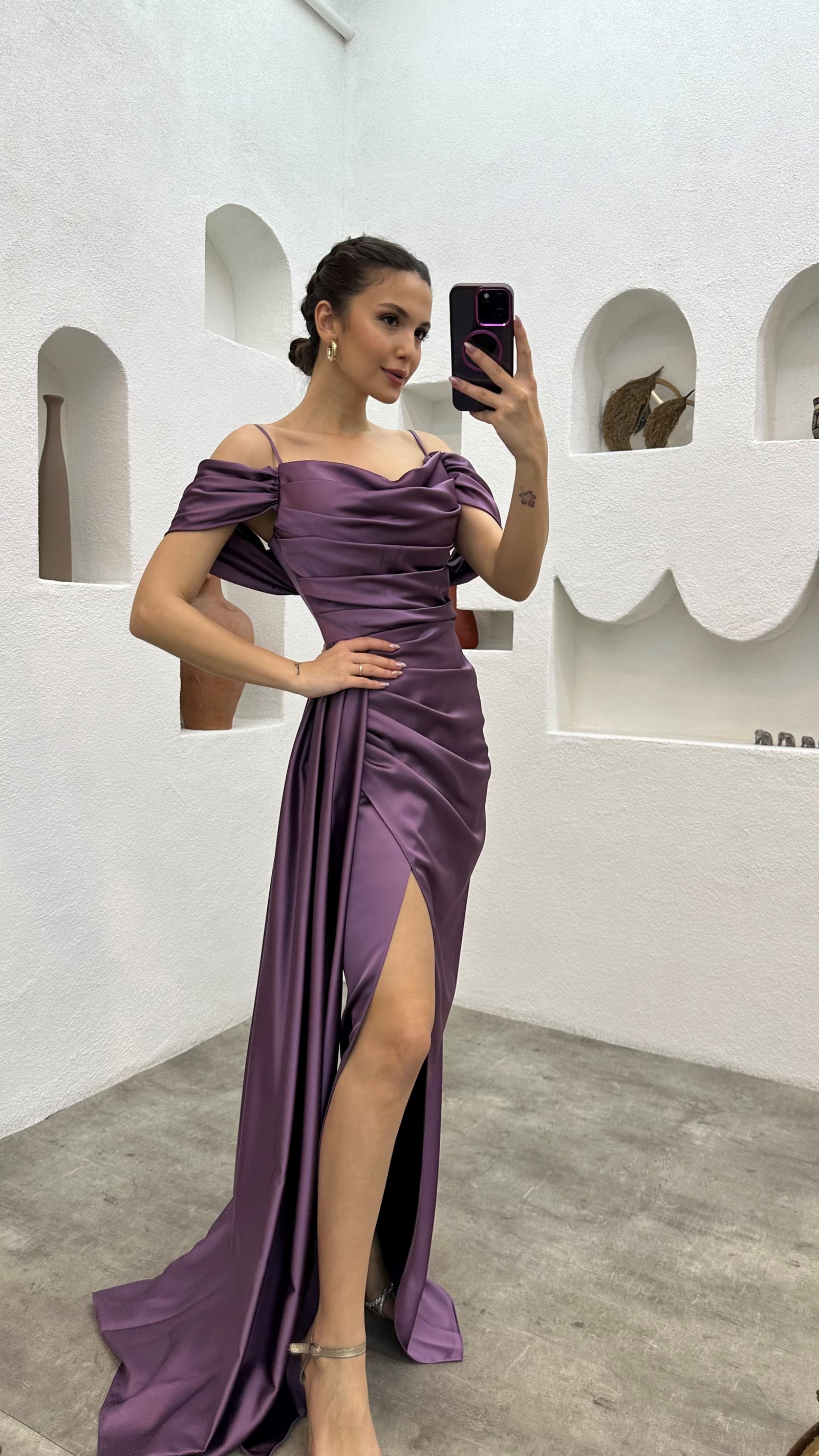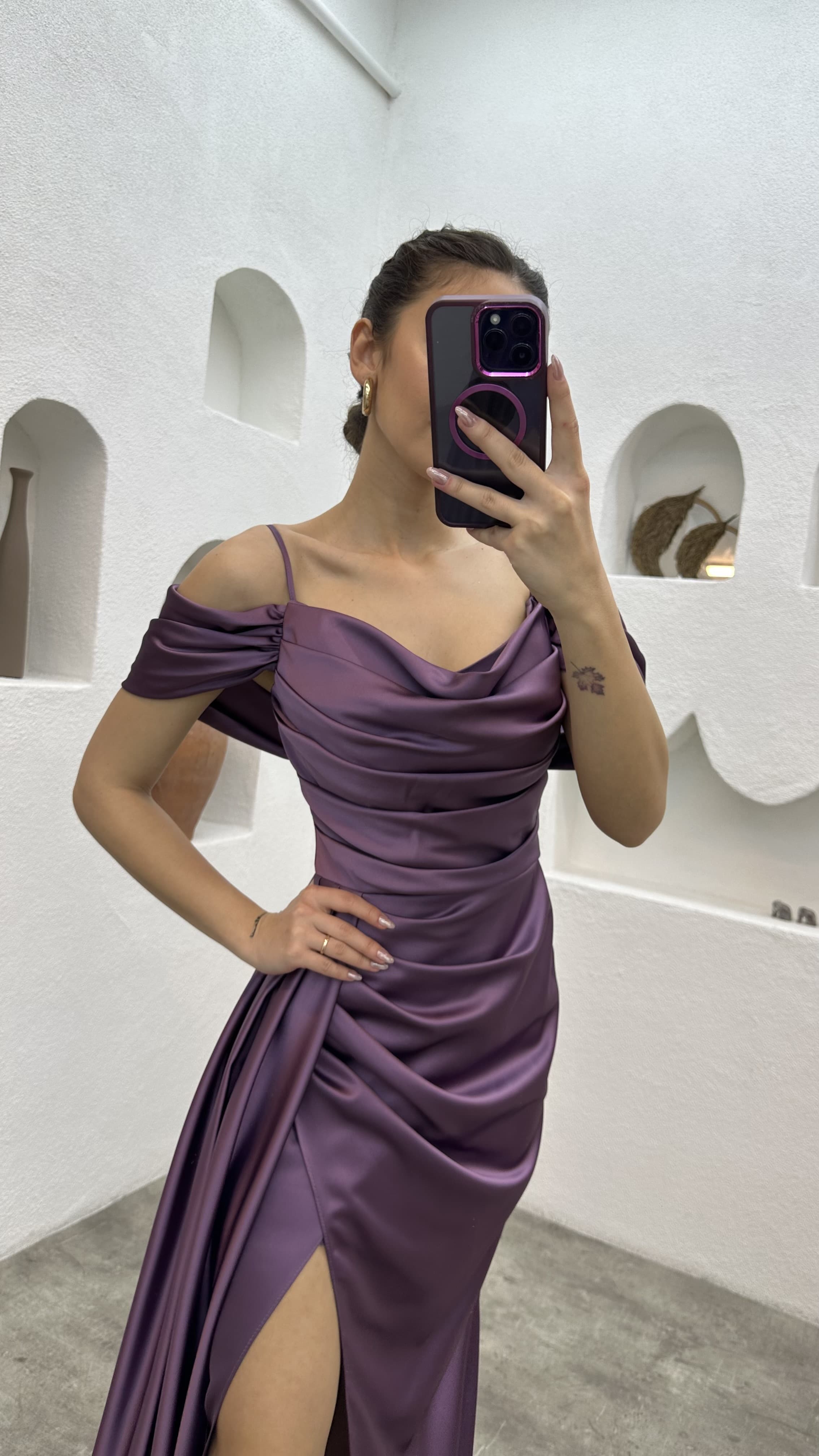 • Mürdüm İp Askılı Drapeli Saten Abiye Elbise
