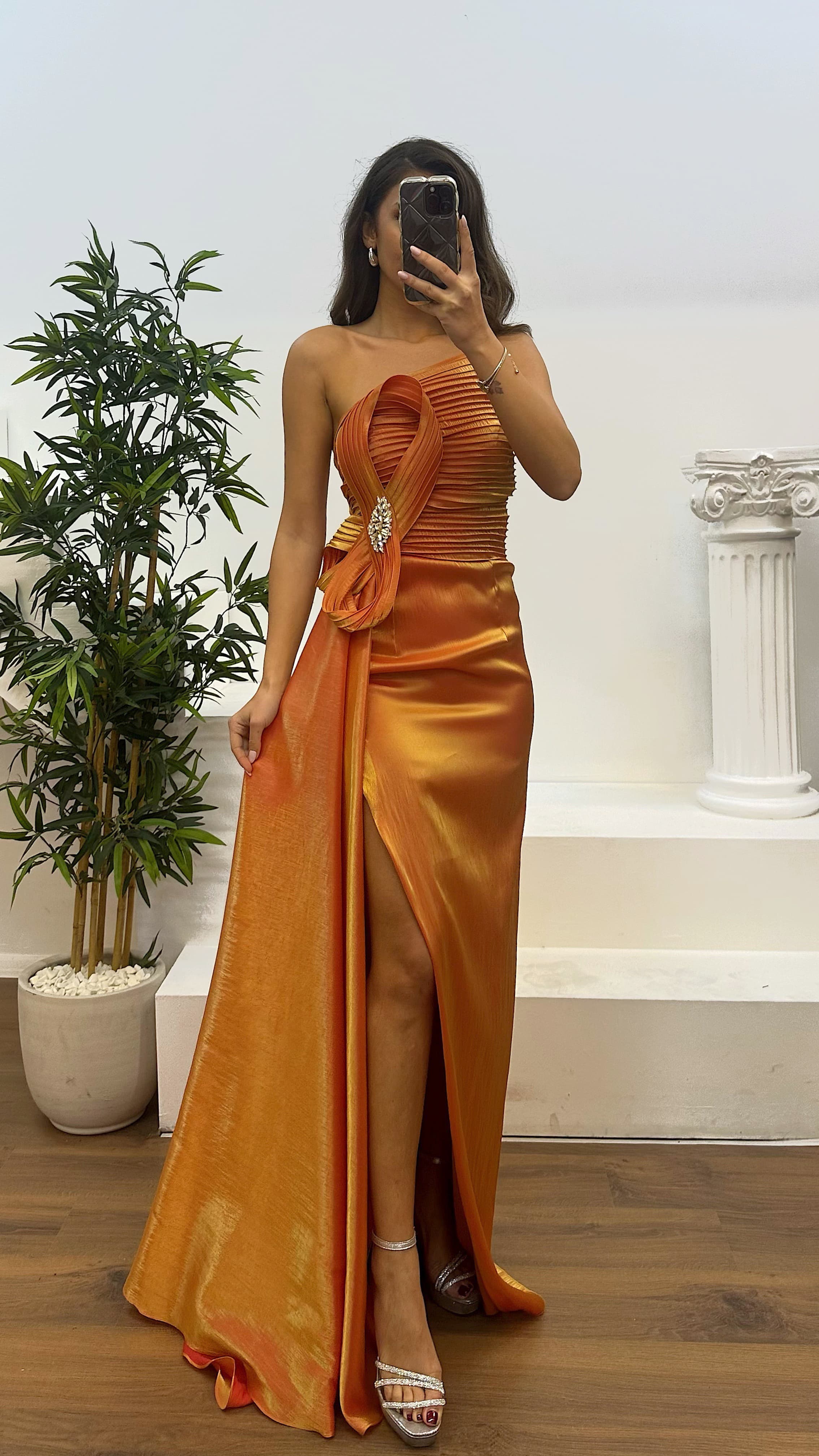 • Fuşya Straplez Drape Detay Abiye Elbise