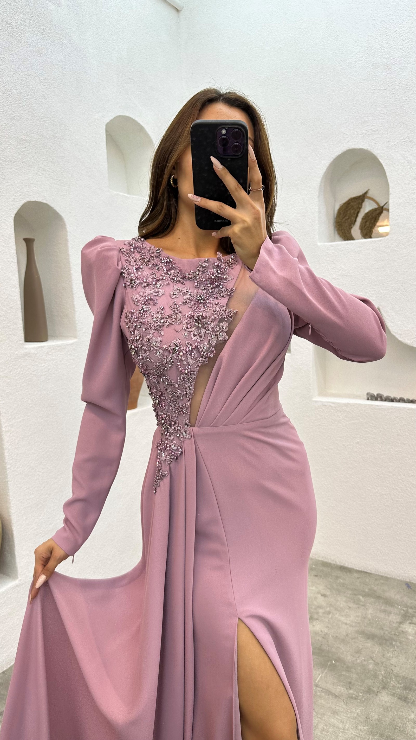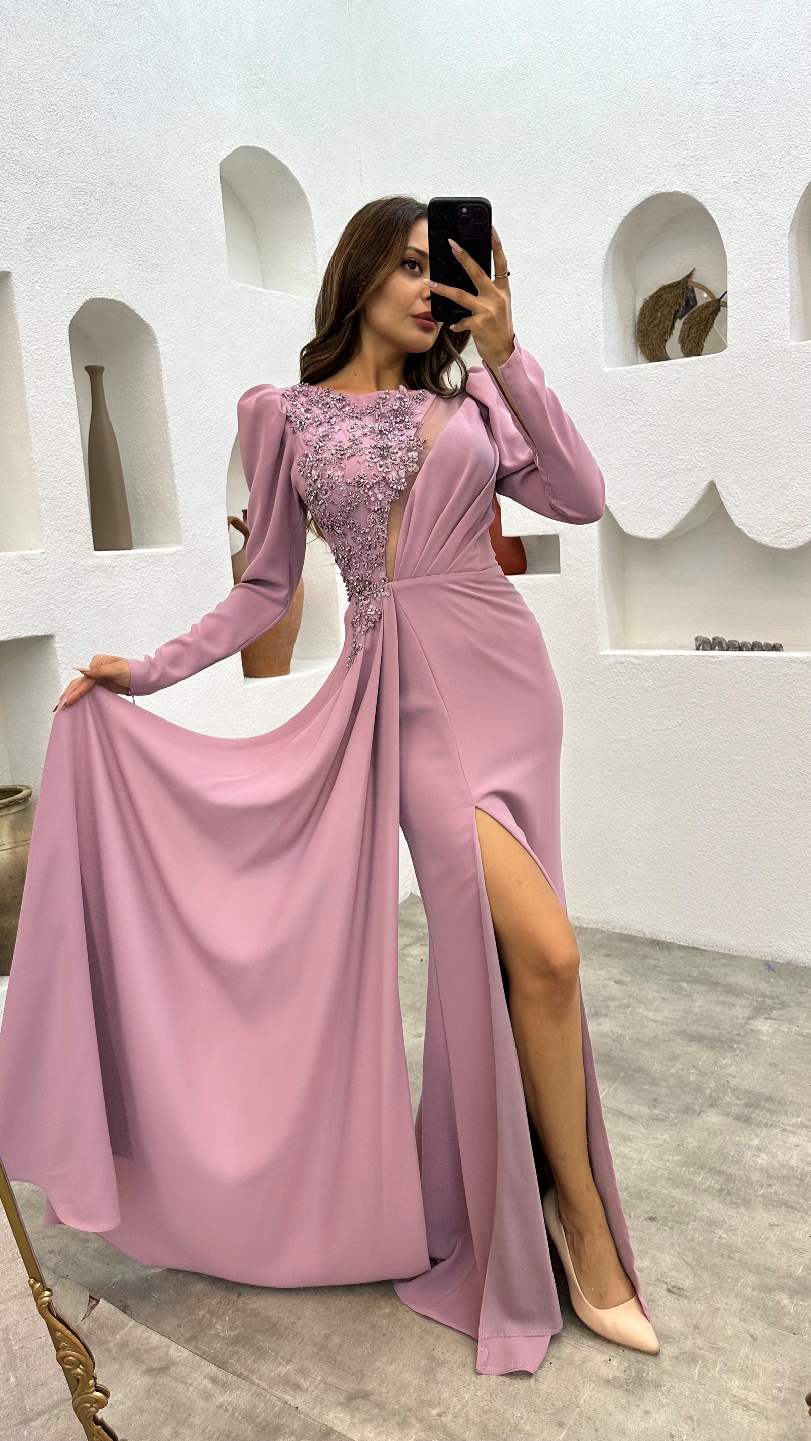 • Pembe İşlemeli  Abiye Elbise