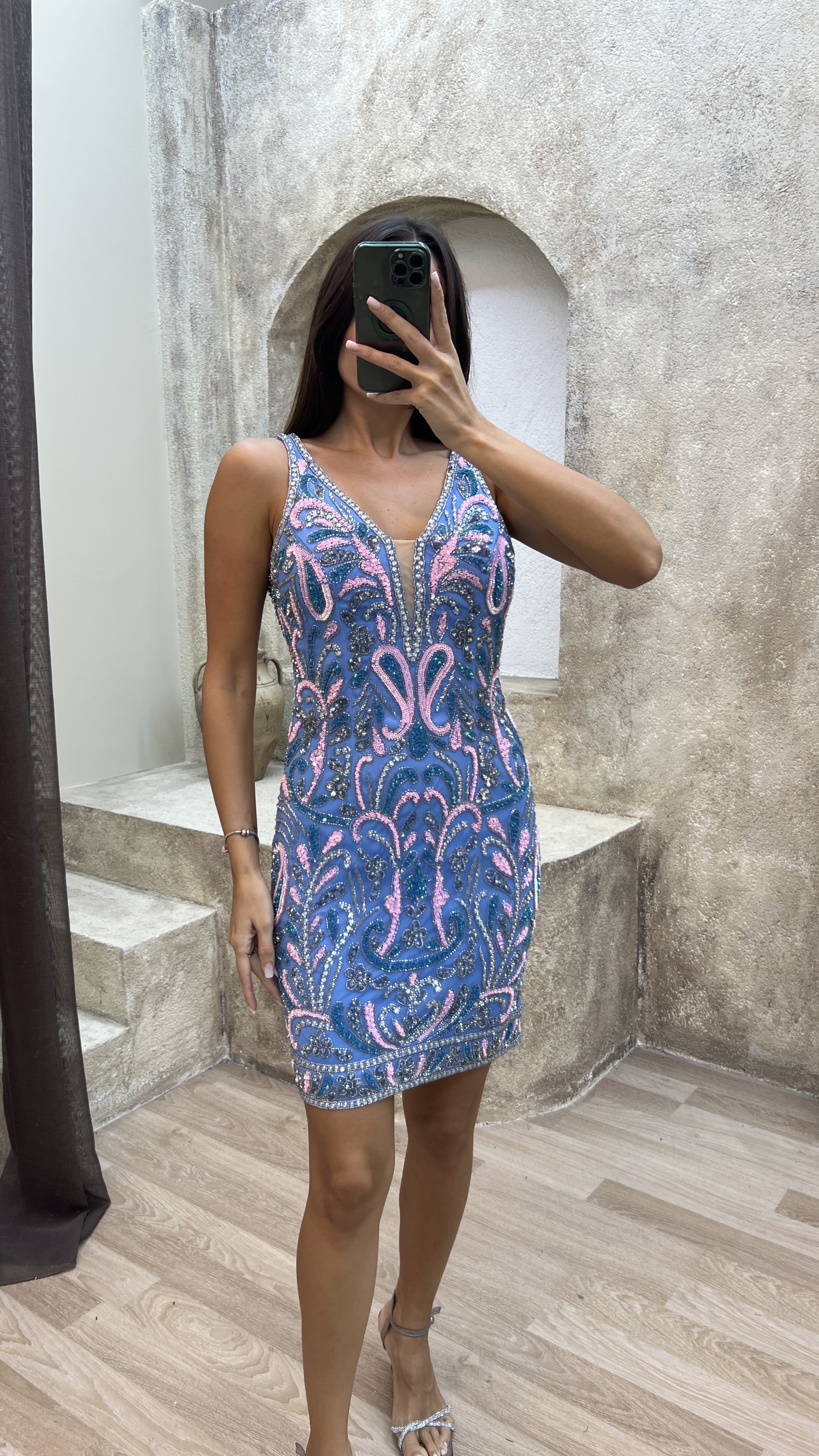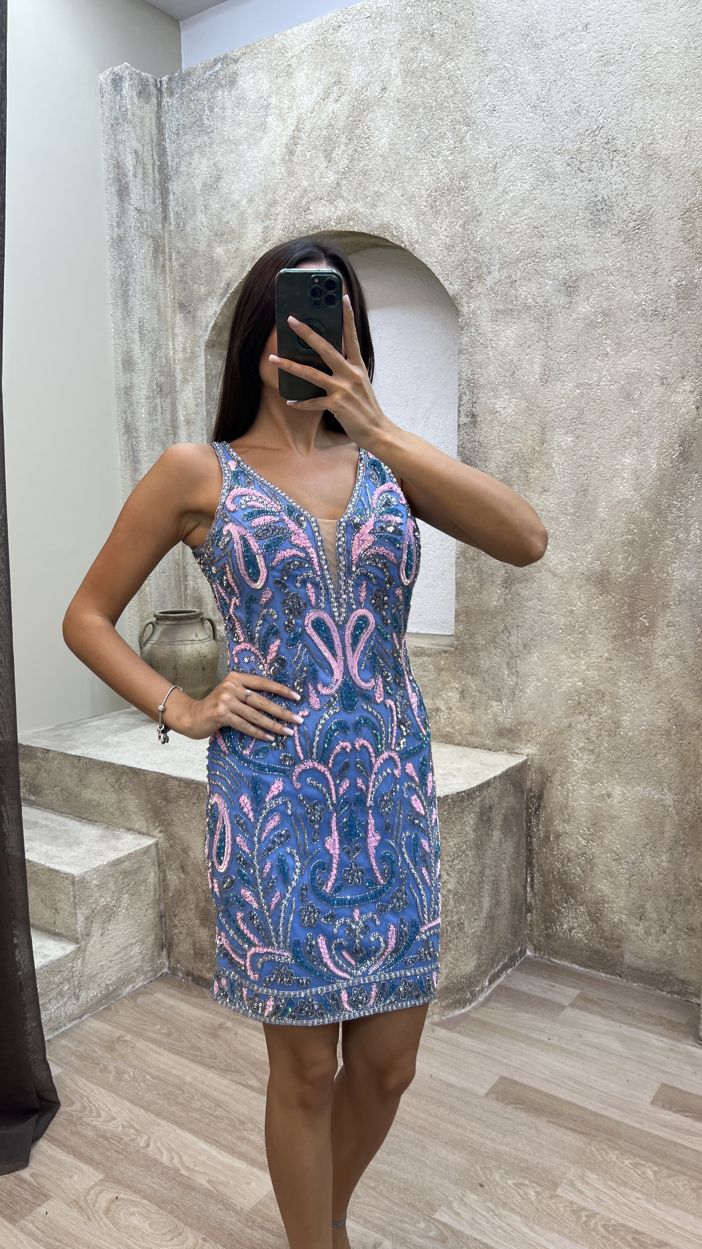 • Mavi V Yaka Göğüs Detay Özel İşlemeli Tasarım Elbise