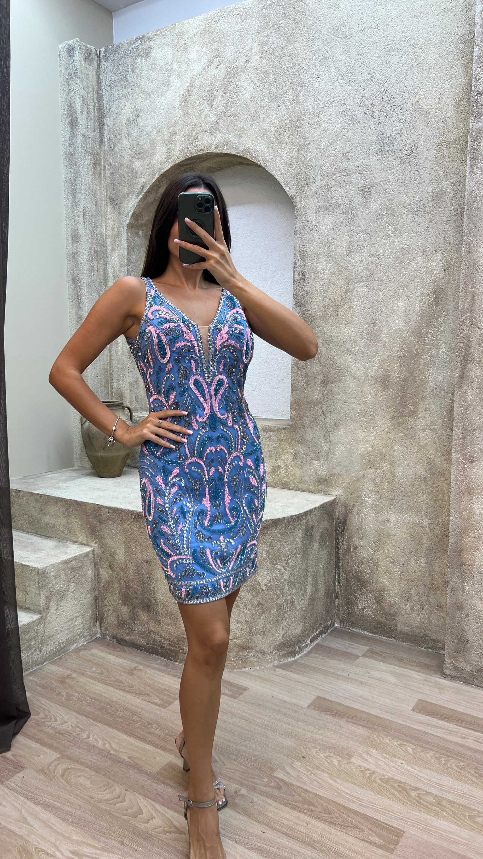 • Turkuaz V Yaka Göğüs Detay Özel İşlemeli Tasarım Elbise