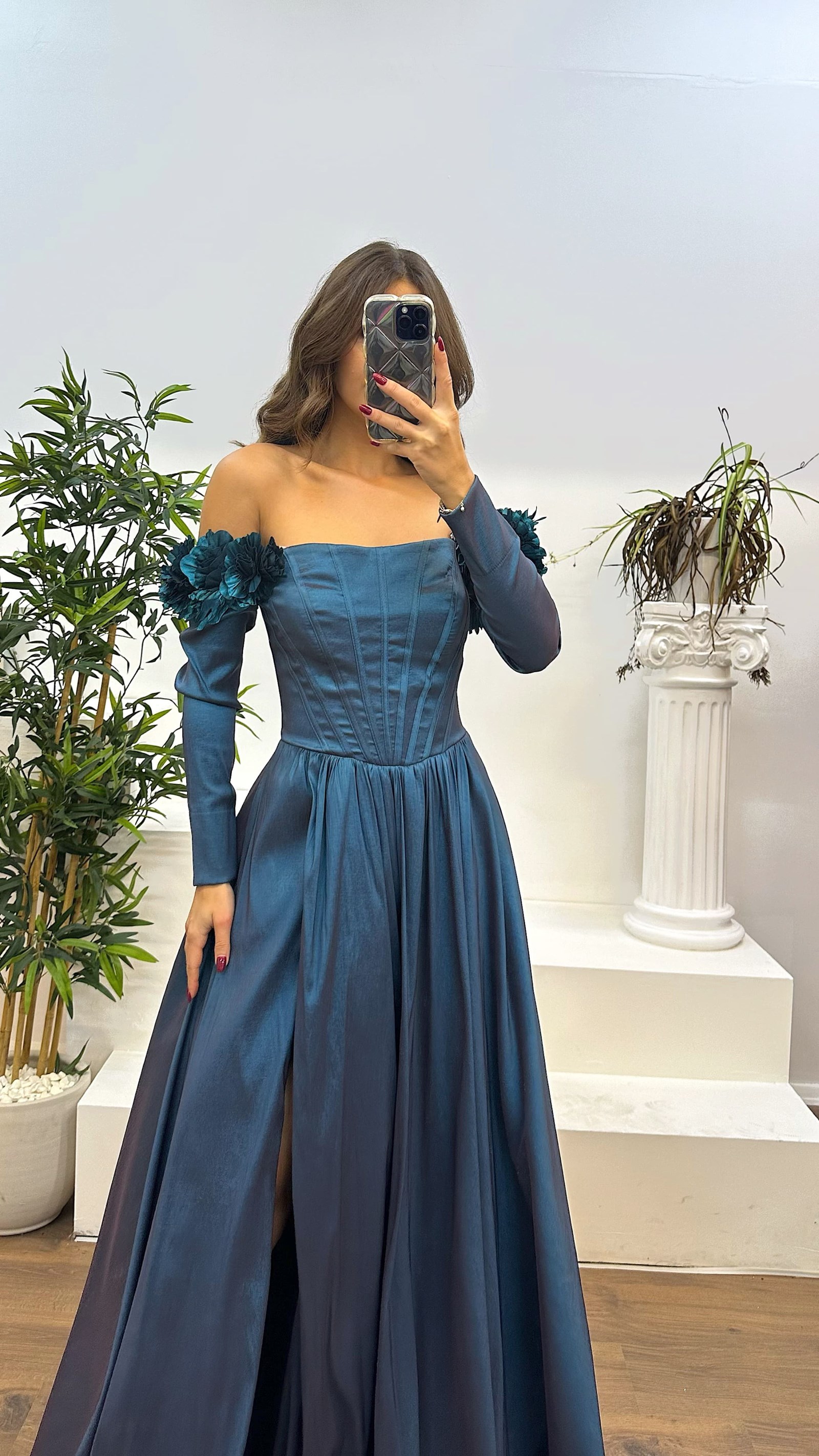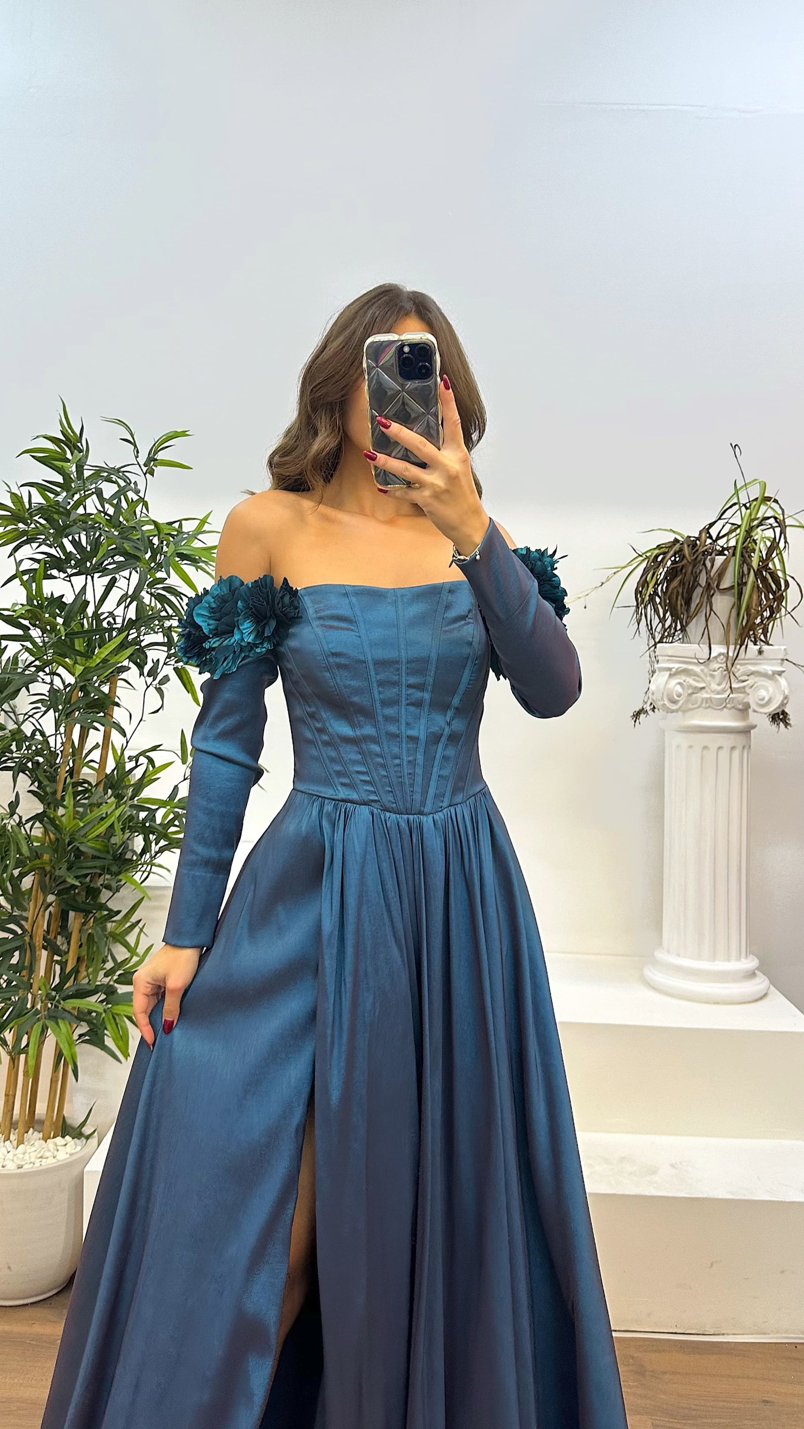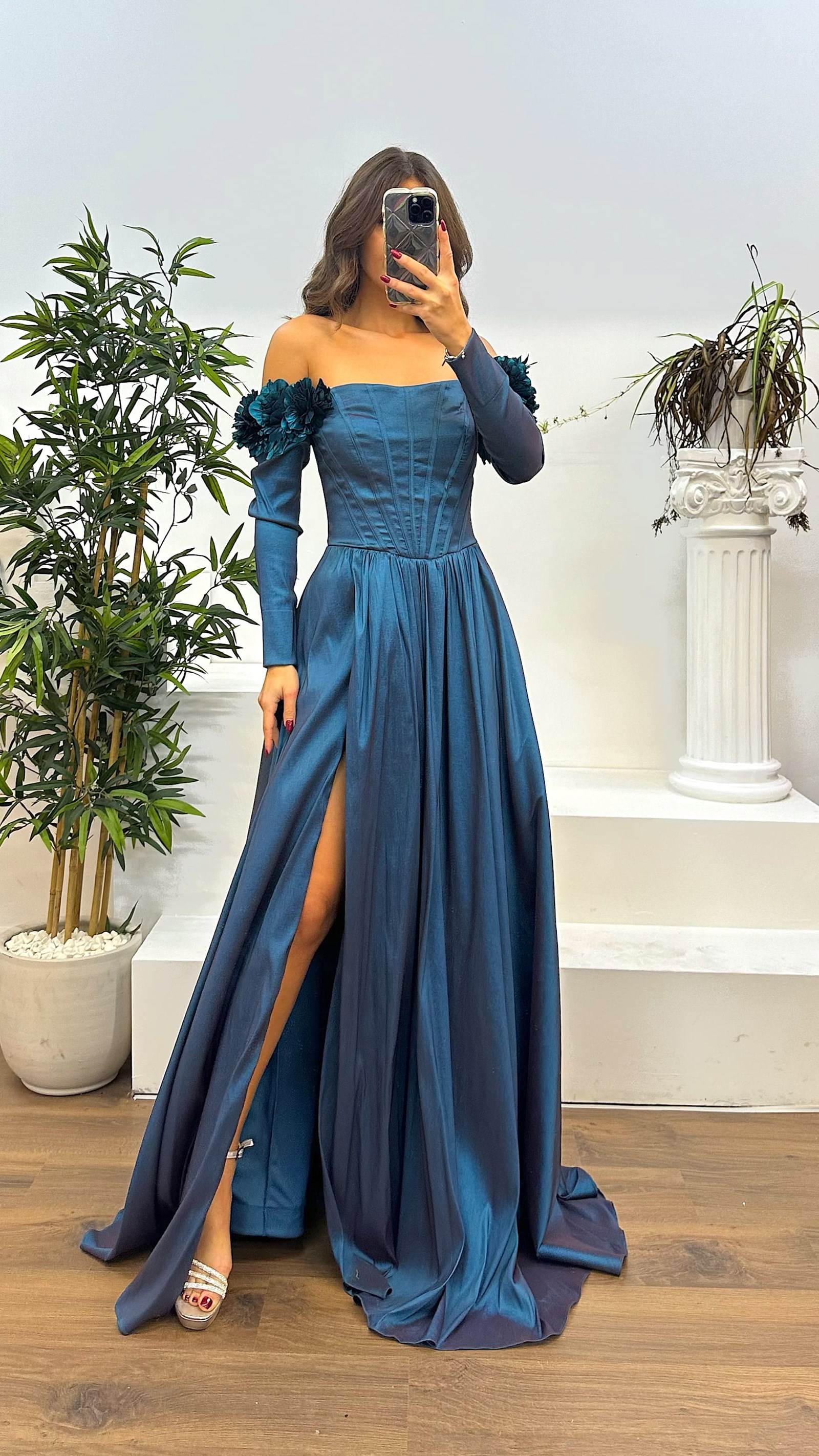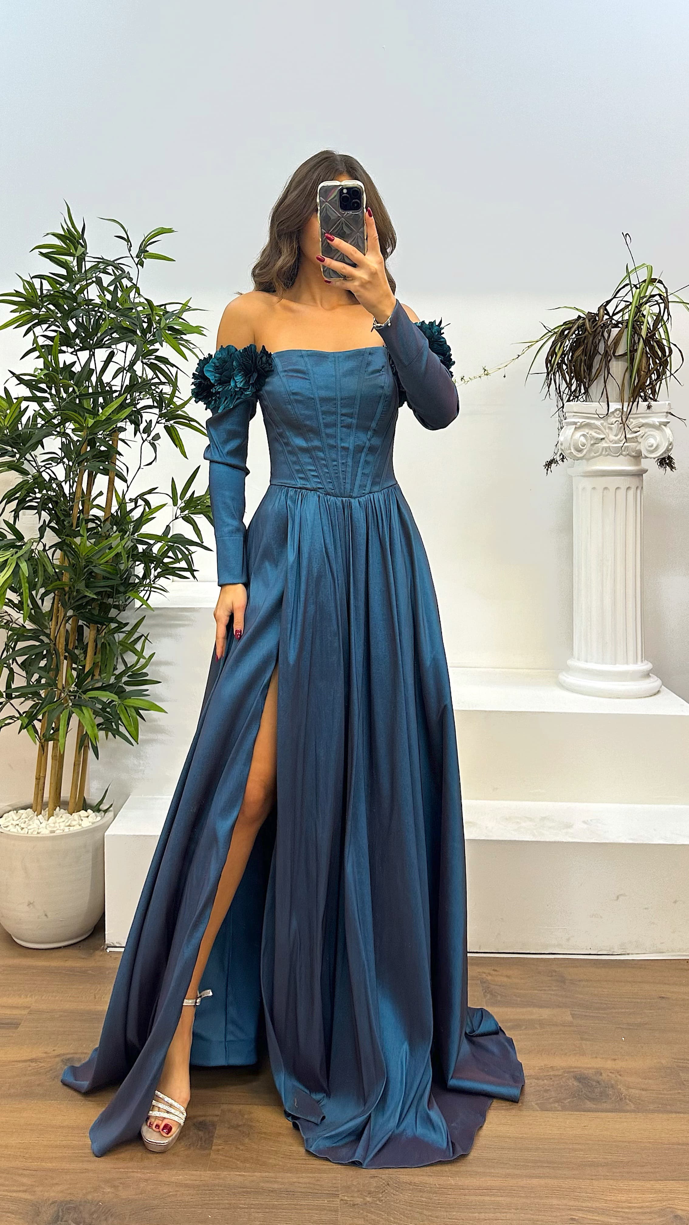 • Petrol Kayık Yaka Uzun Kol Abiye Elbise