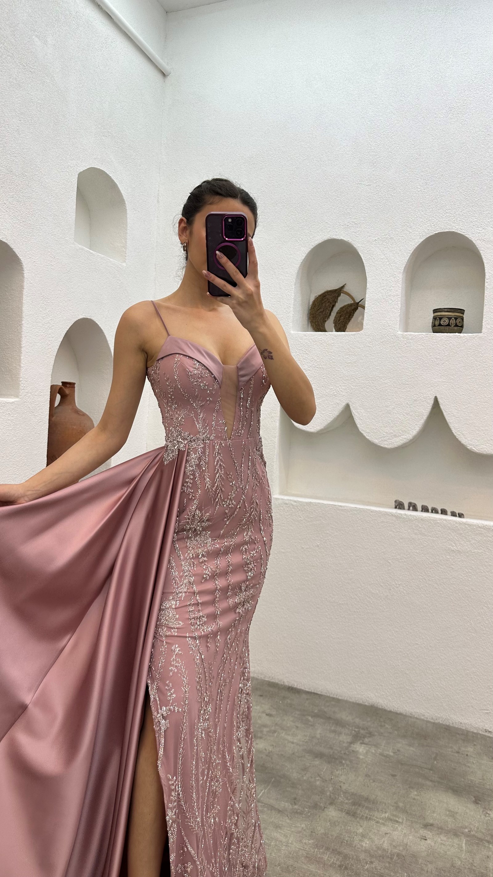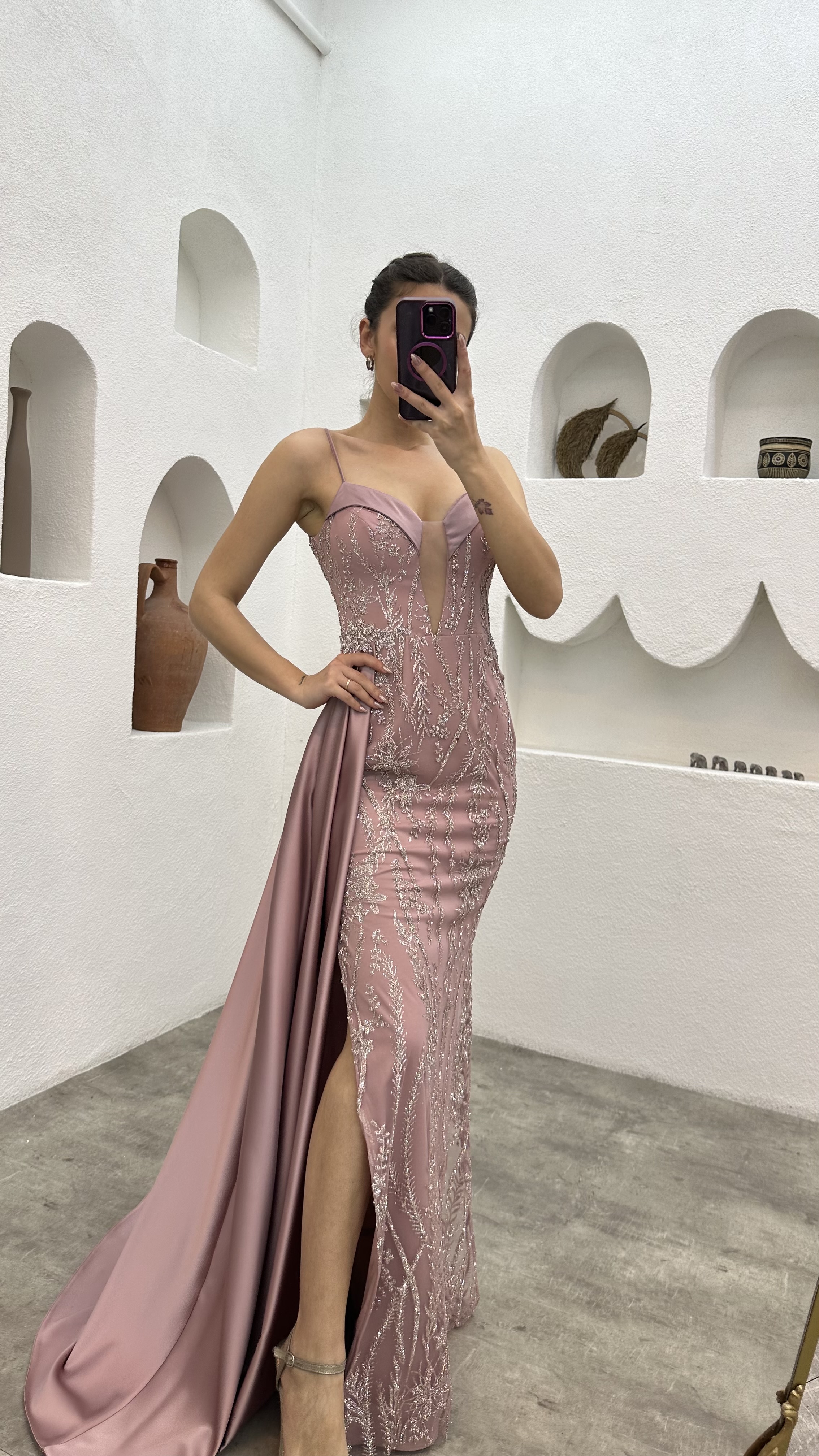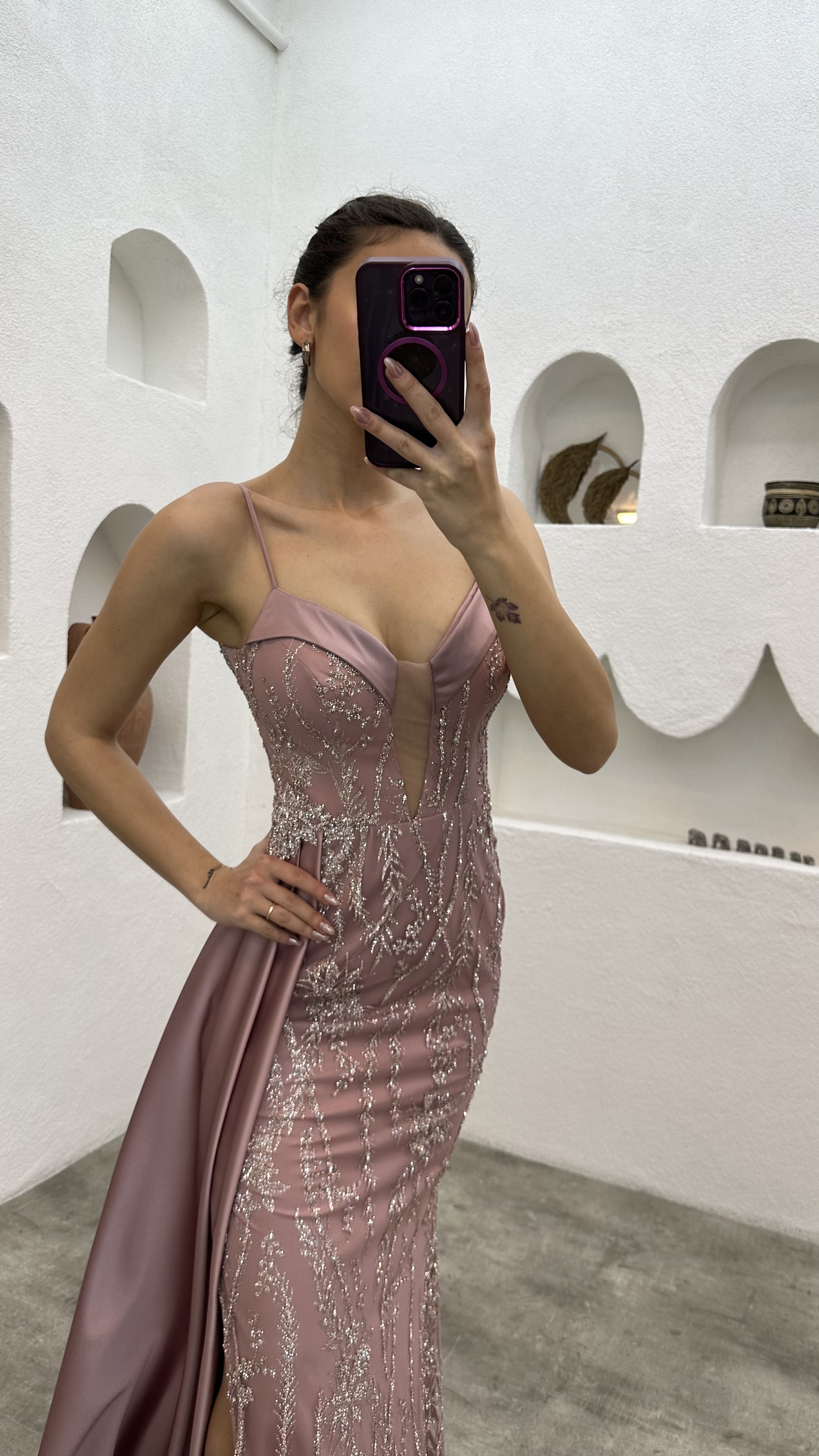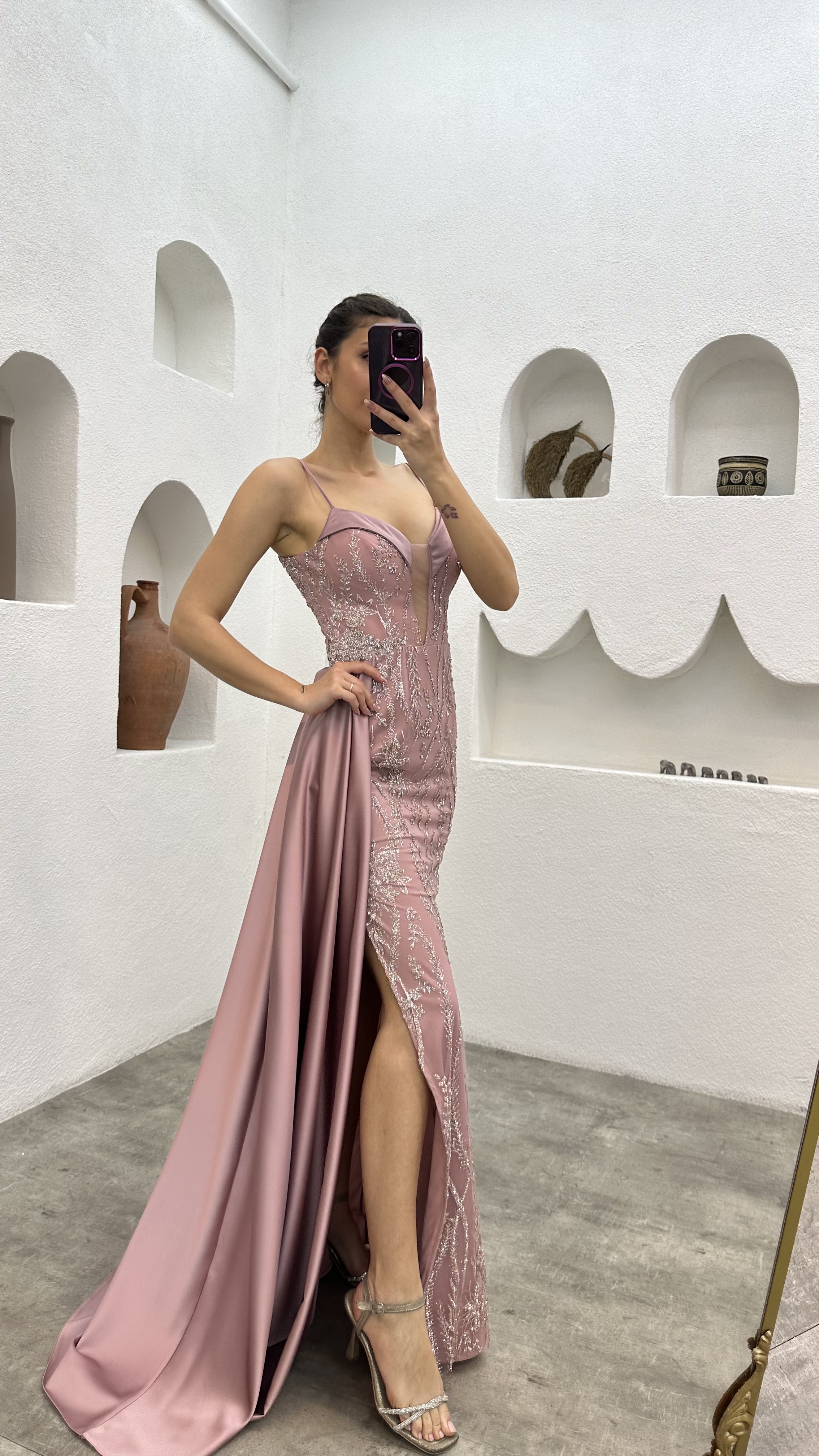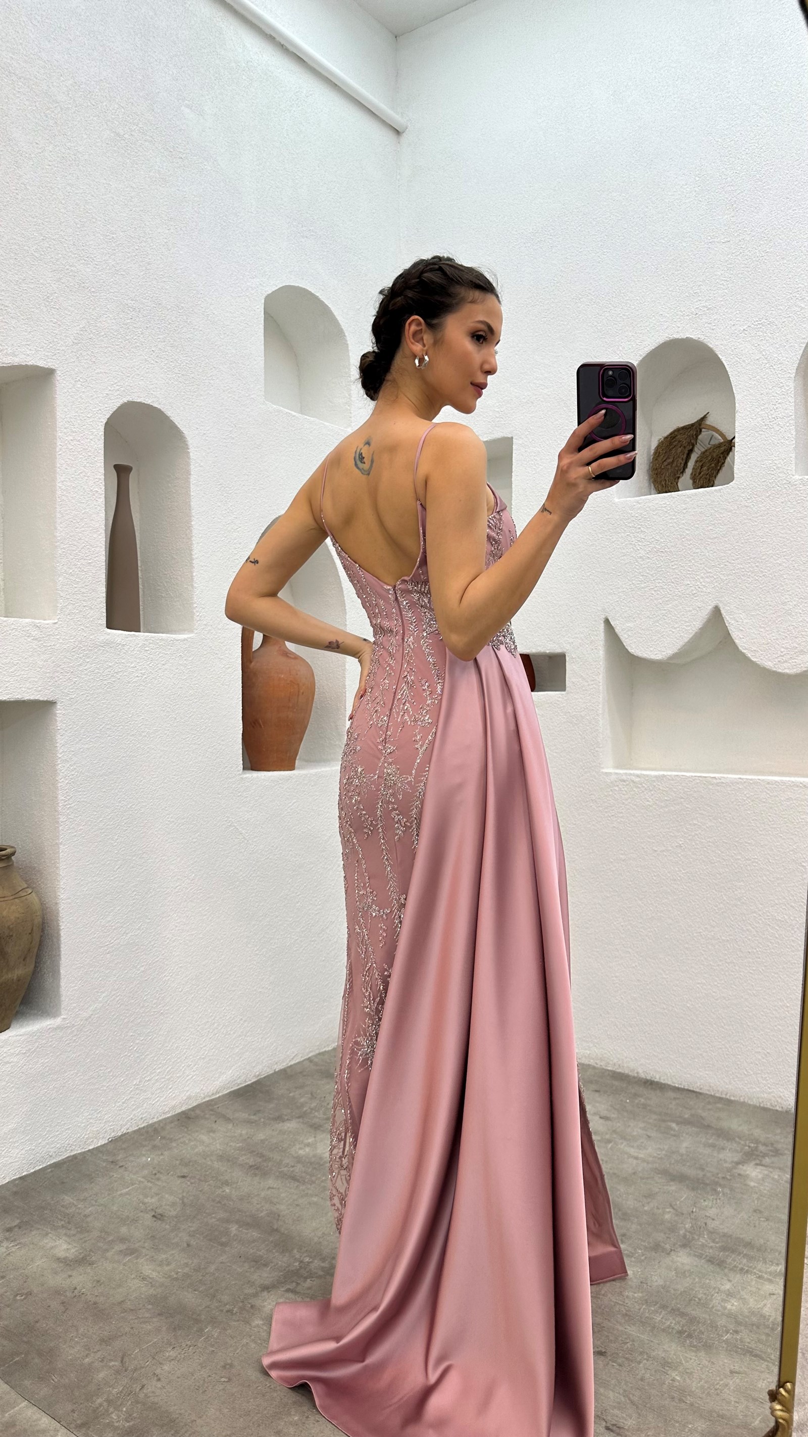 • Pudra İp Askılı İşlemeli Göğüs Detay Abiye Elbise