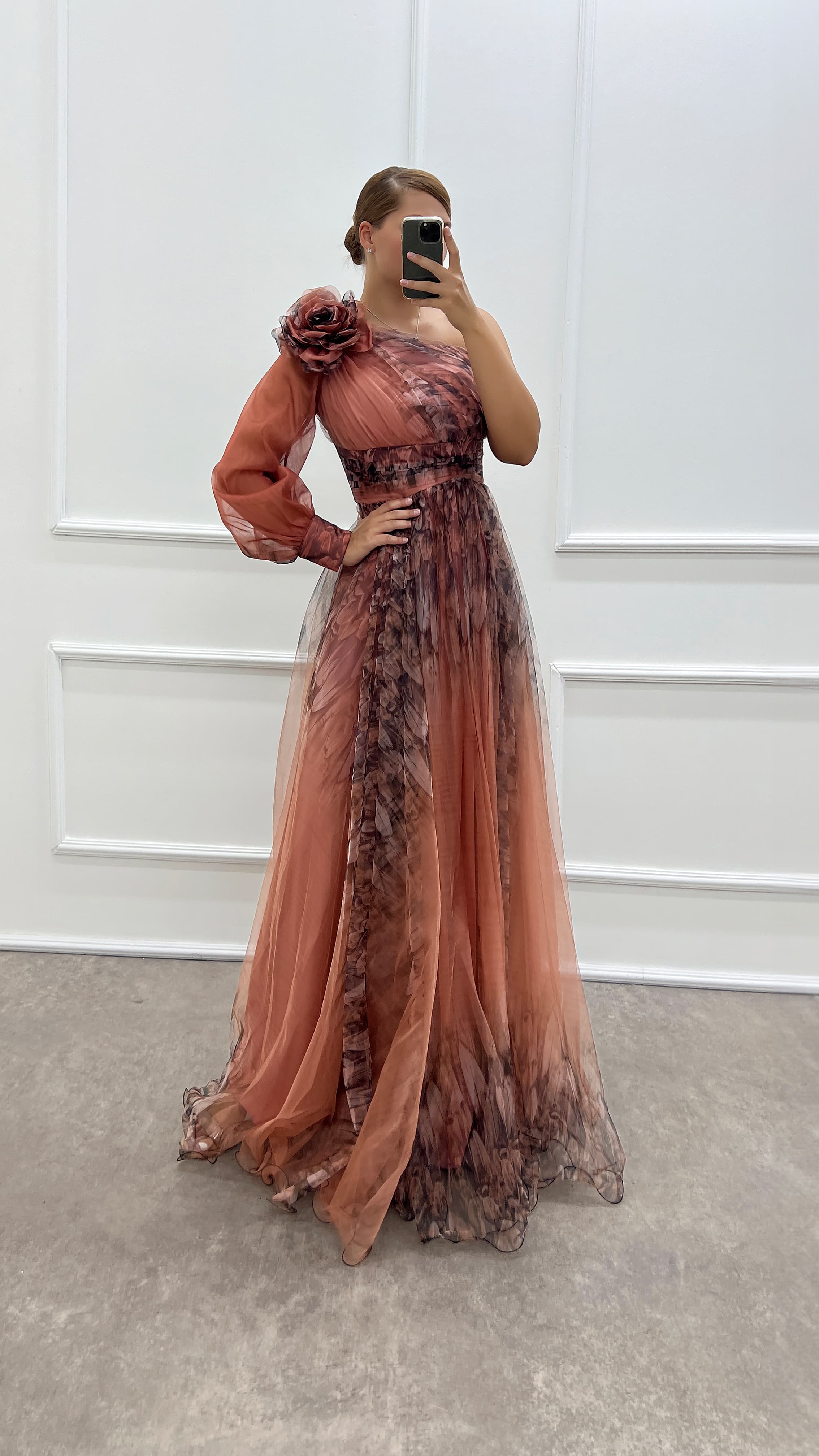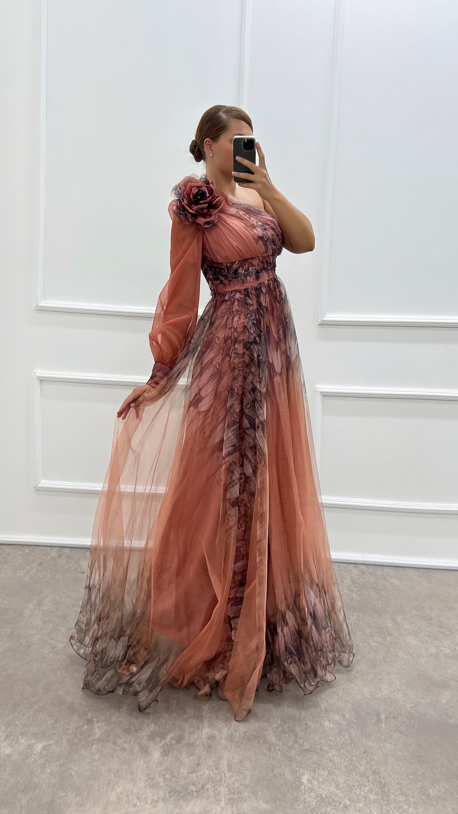 • Pudra Tek Omuz Gül Detay Desenli Tasarım Tül Büyük Beden Abiye Elbise