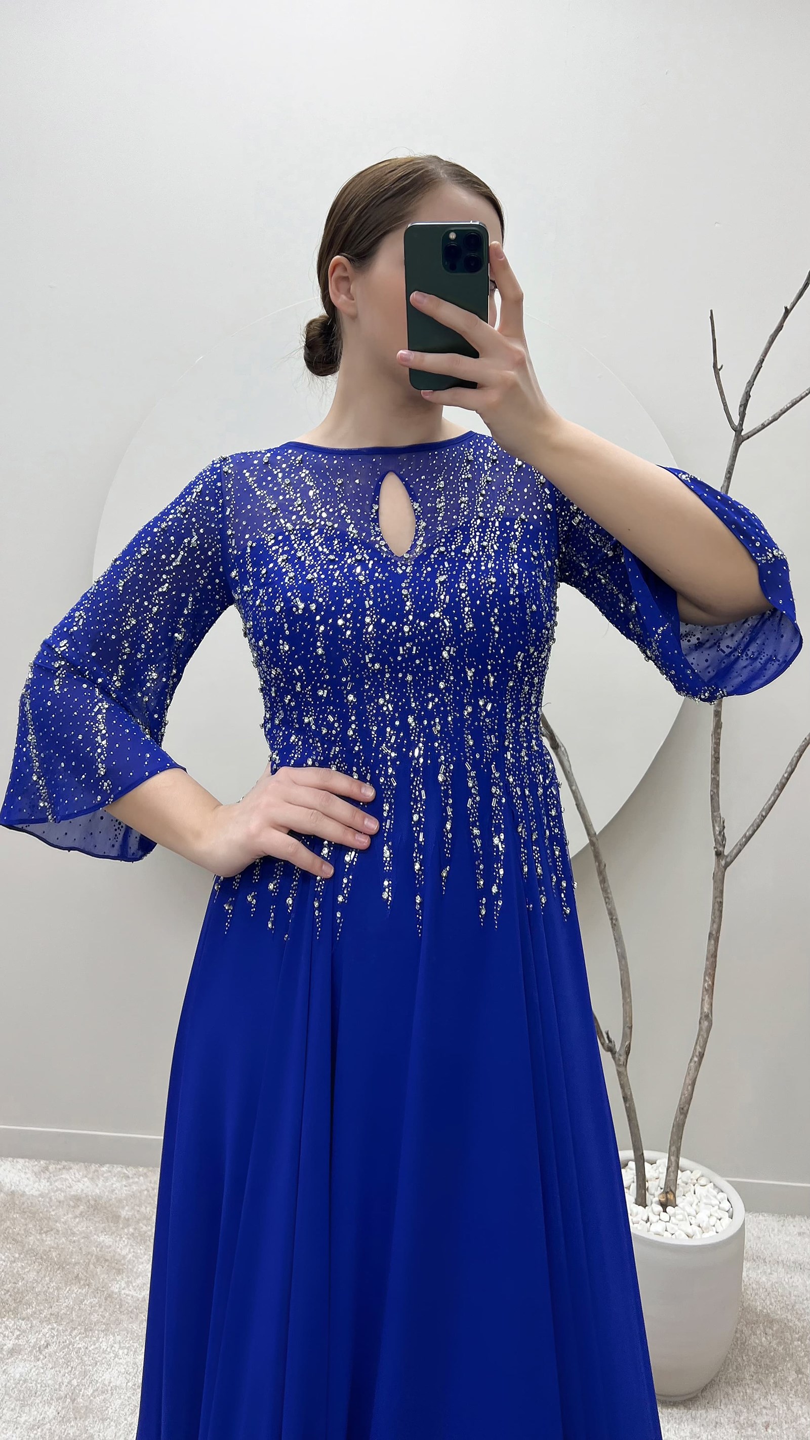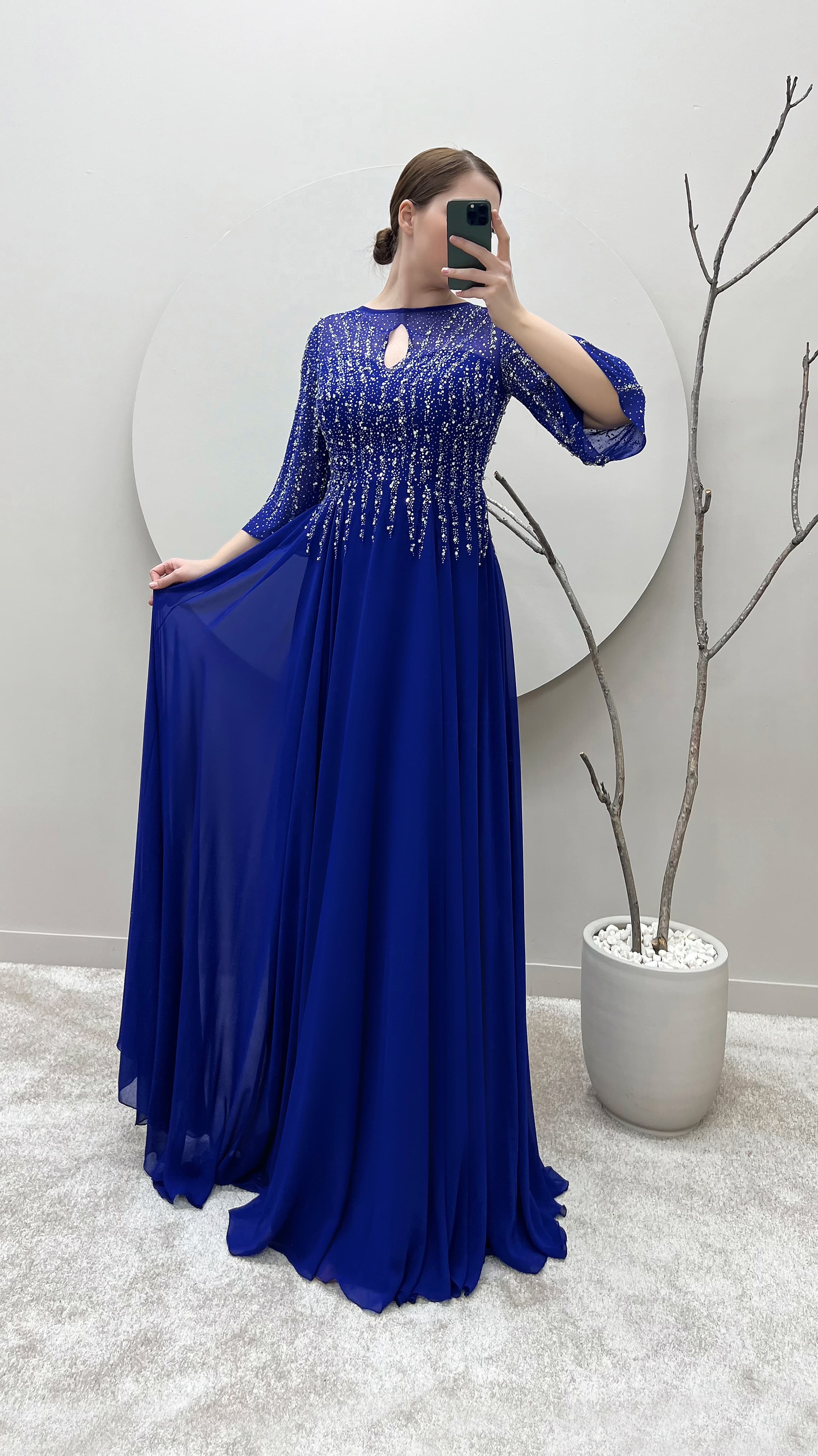 • Saks Göğsü Taşlı Tasarım Büyük Beden Abiye Elbise