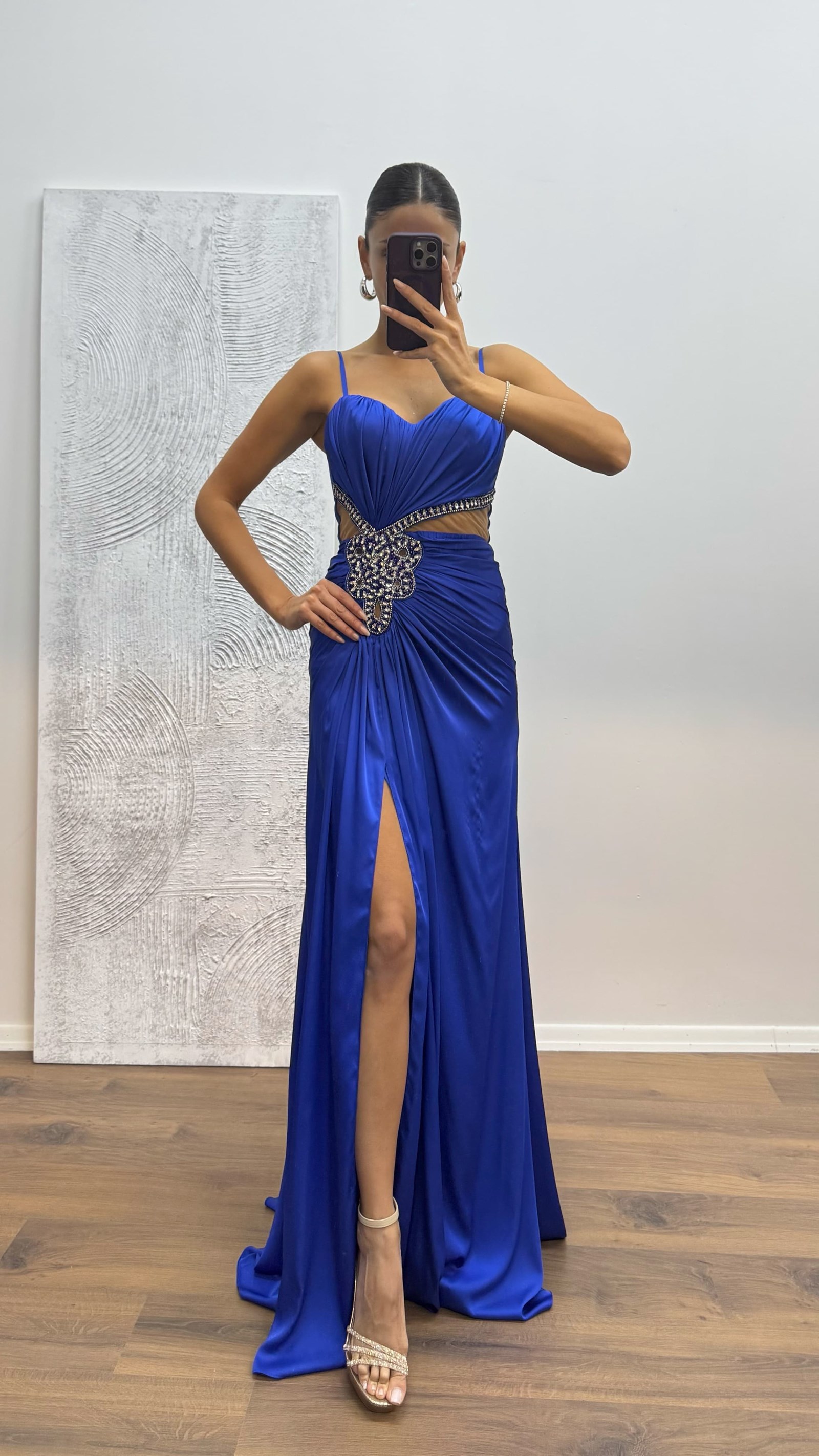 فستان سهرة بتفاصيل مطرزة المنتج مناسب للمقاسات من 36 إلى 42، مزود بحشوات صدر، مبطن، برباط متقاطع وسحاب خلفي، يحتوي على شق، شفاف ومطرز. طول الفستان: يتراوح بين 165 و170 سم. نوع القماش: ساتان بوليستر، فيسكوز.