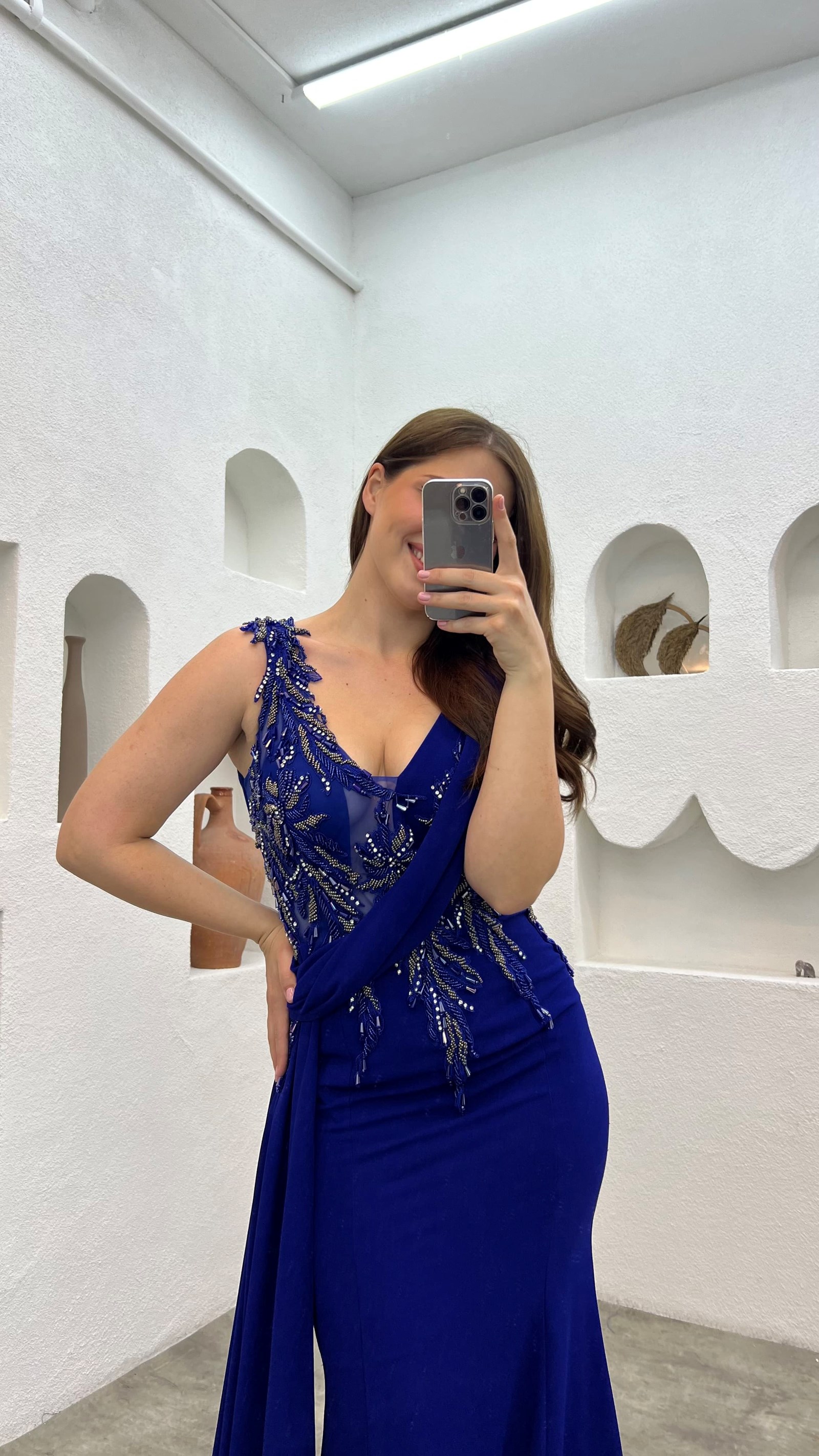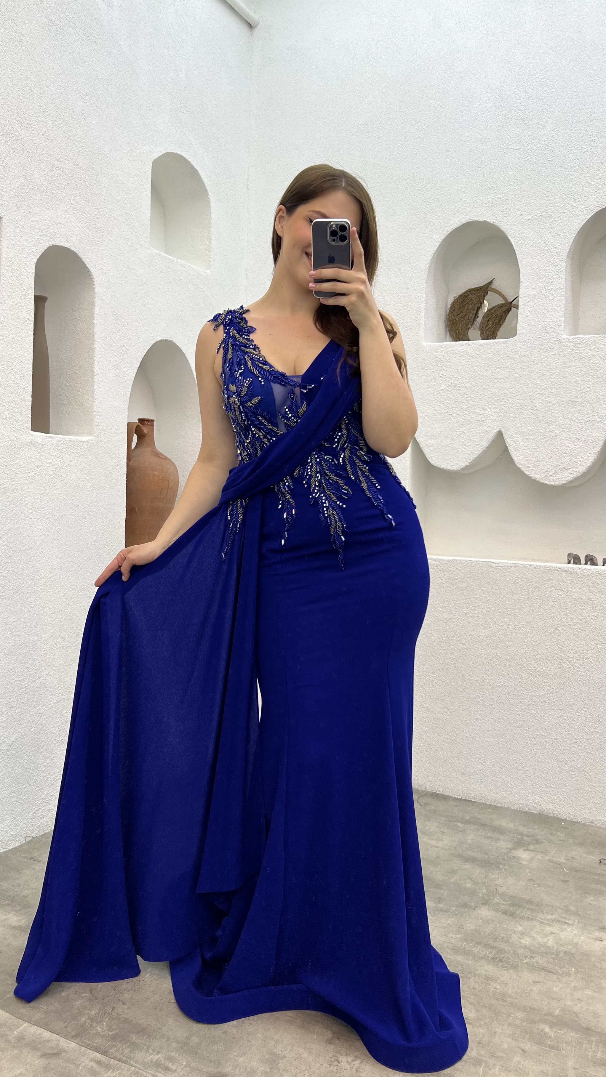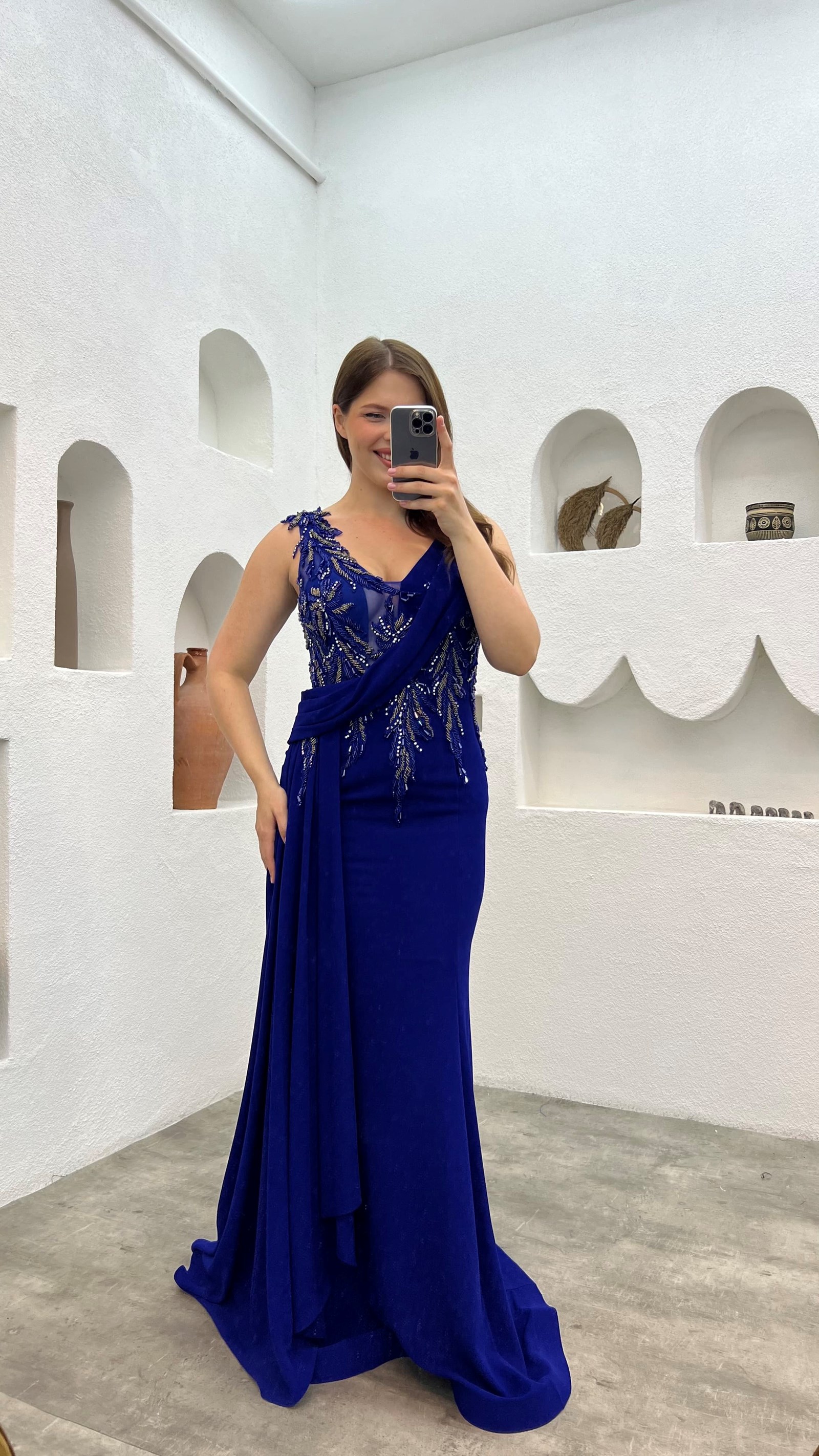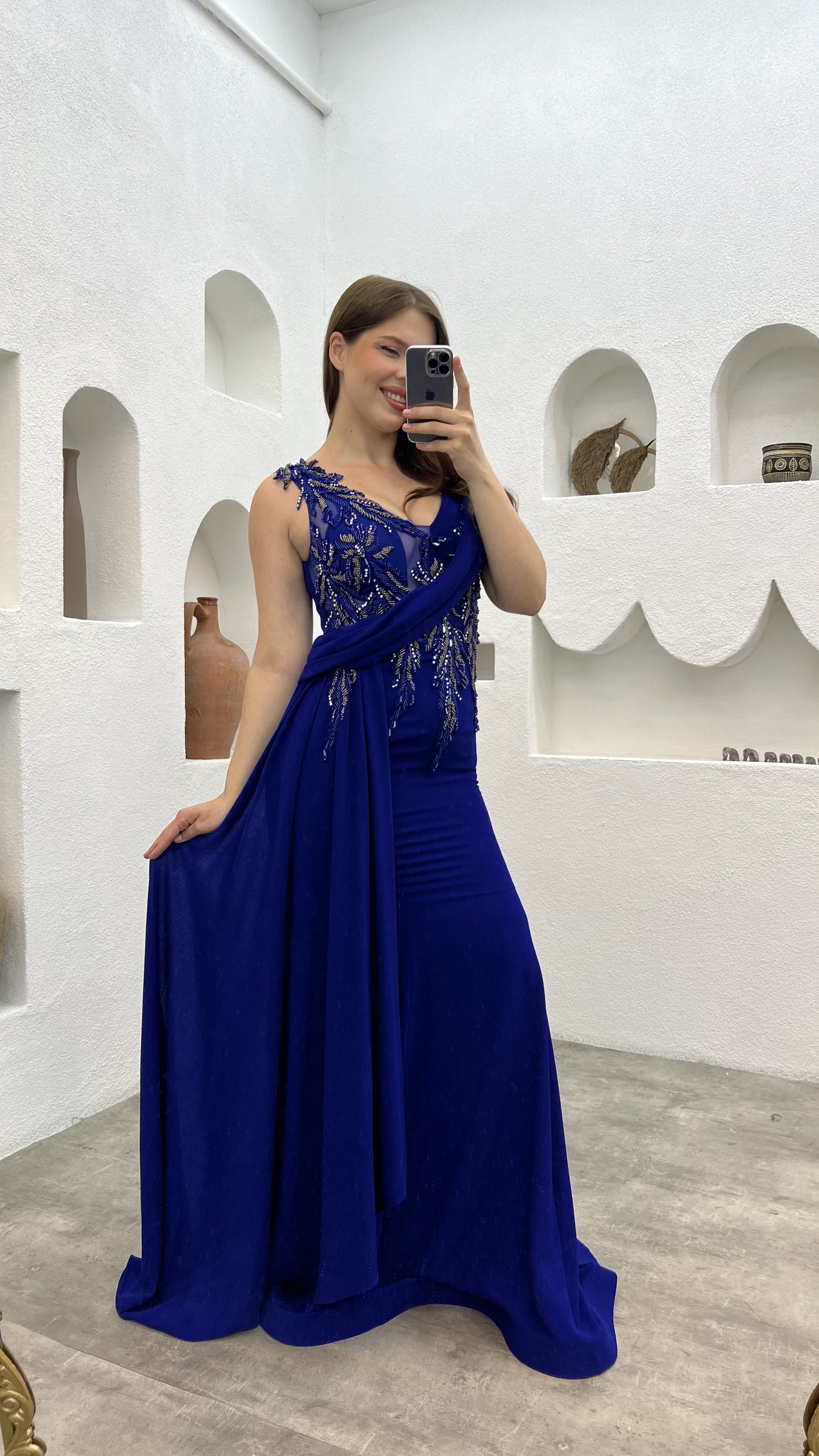 • Saks İşlemeli Drapeli Büyük Beden Abiye Elbise