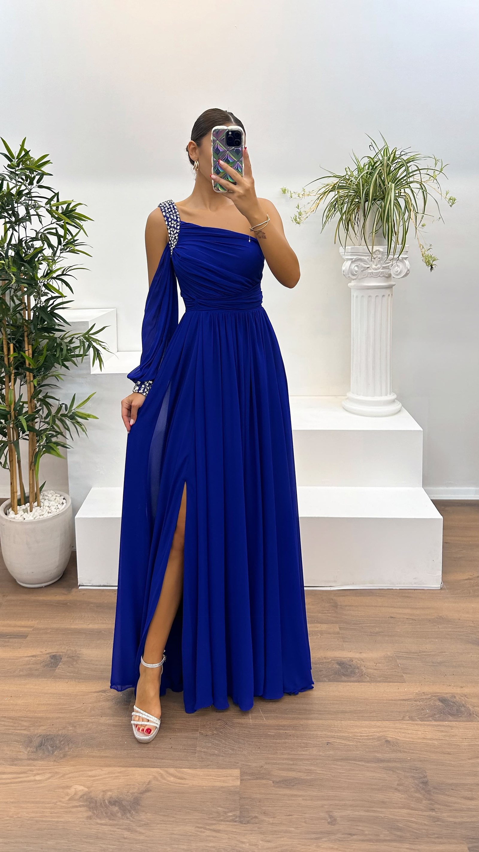 • Saks Tek Kol Taş Detay Abiye Elbise