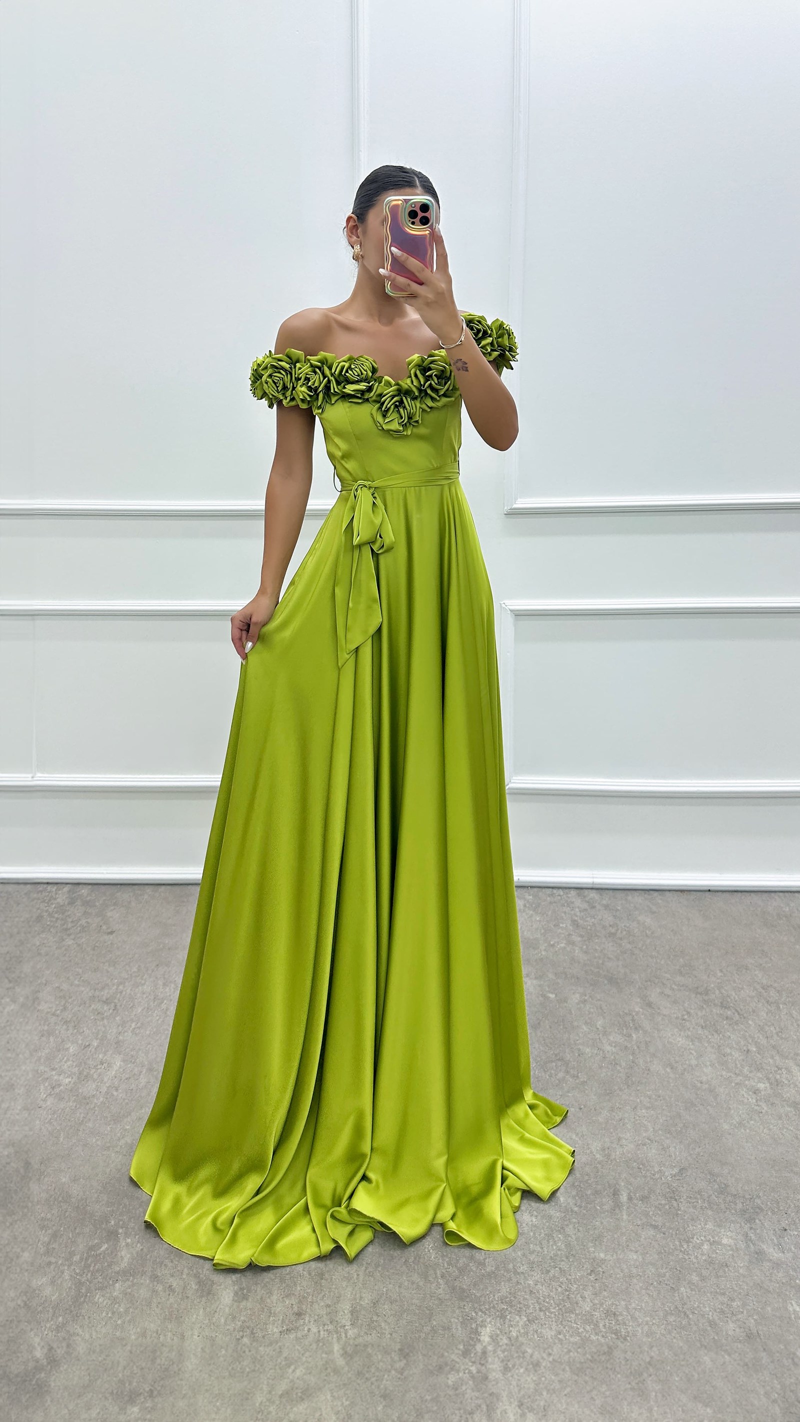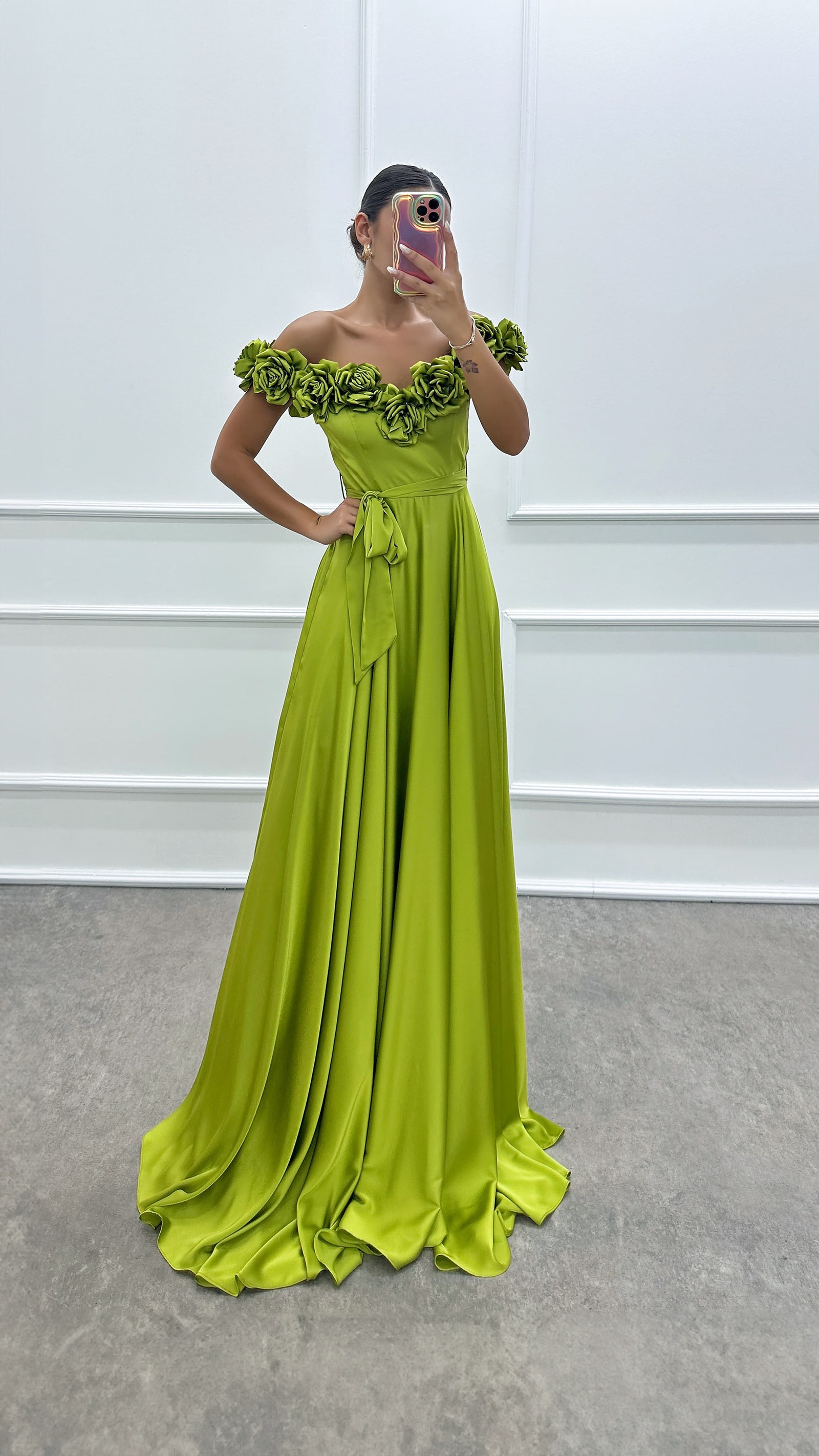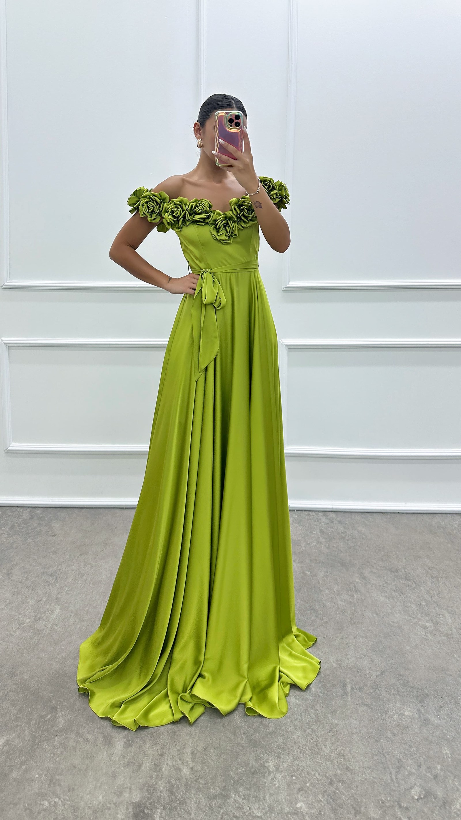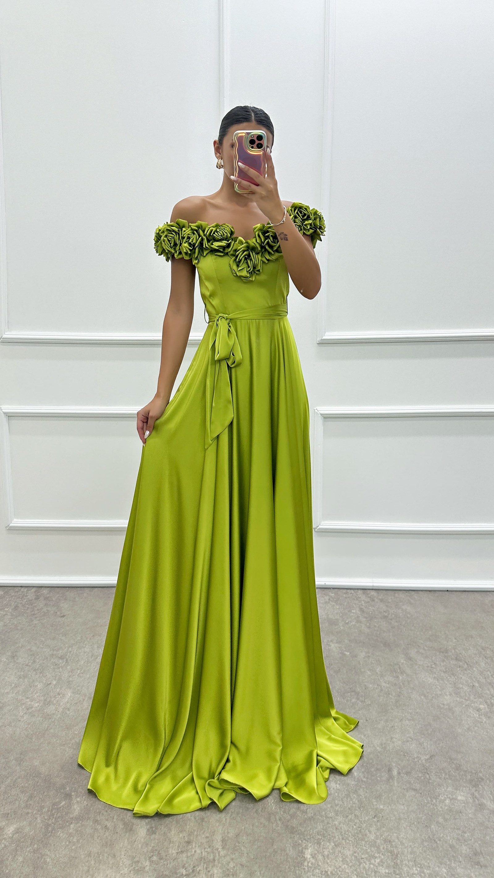 فستان سهرة بتصميم تفاصيل الوردة الصفراء