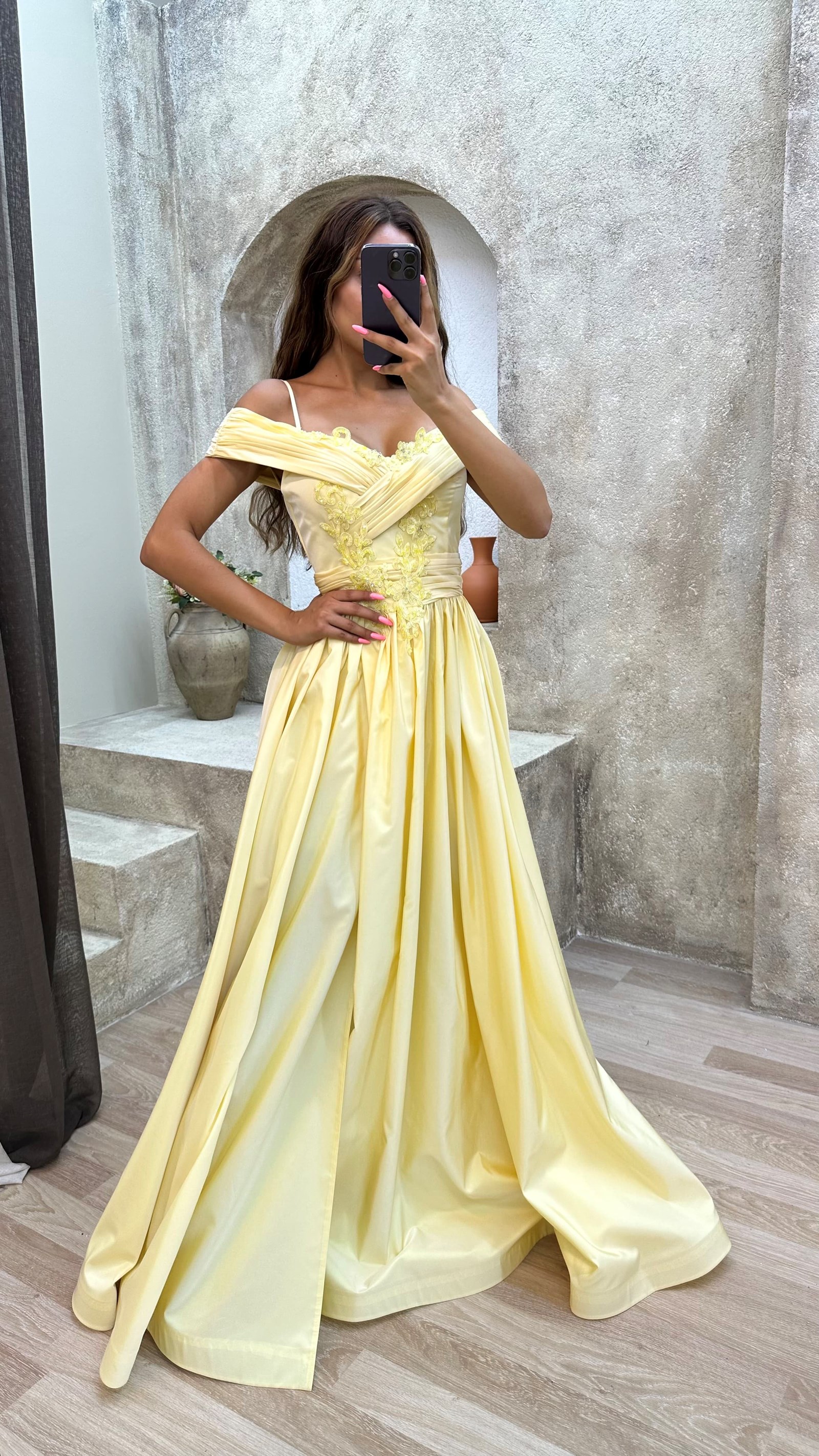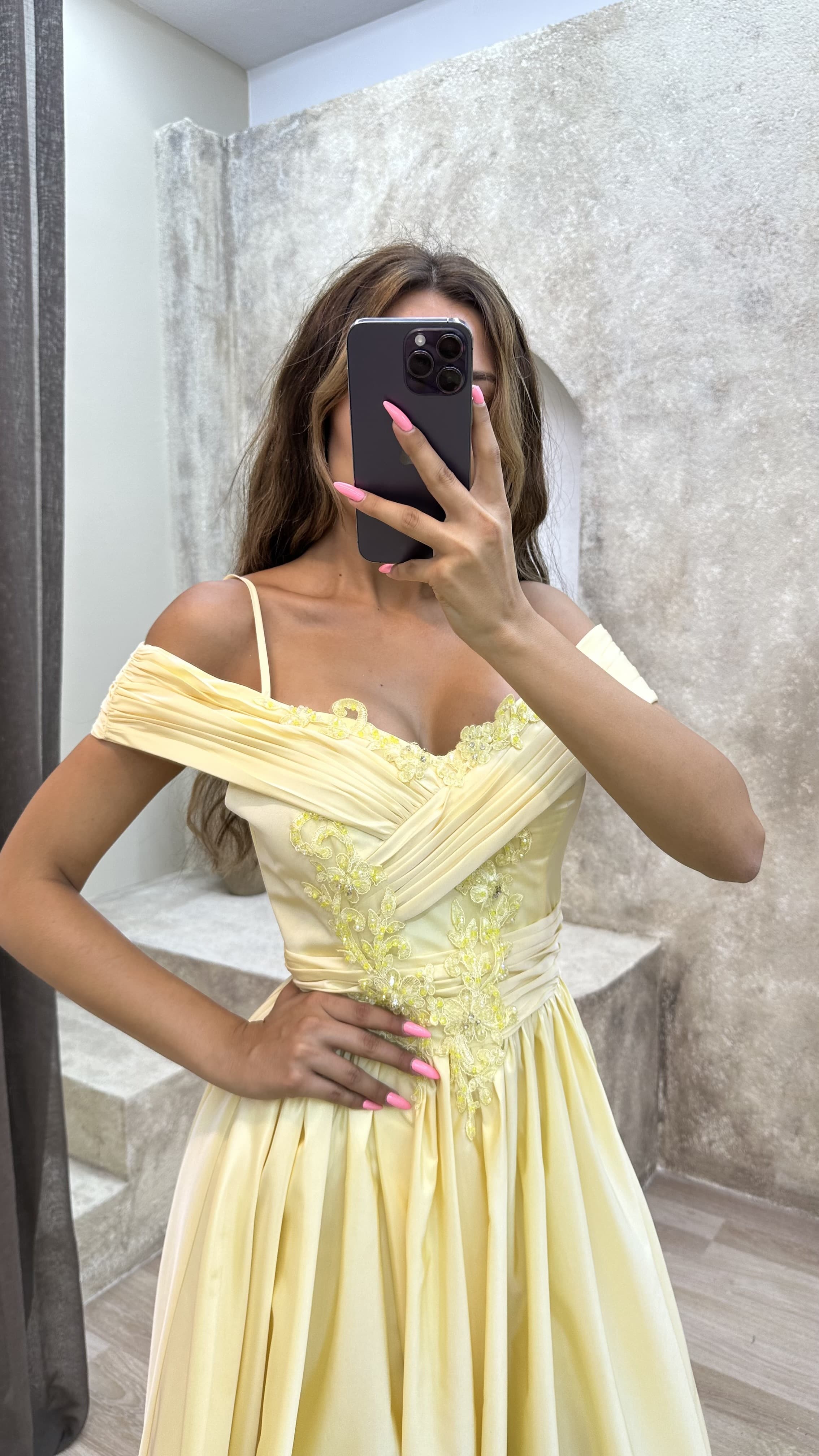• Sarı  İp Askılı Kayık Yaka İşlemeli Abiye Elbise
