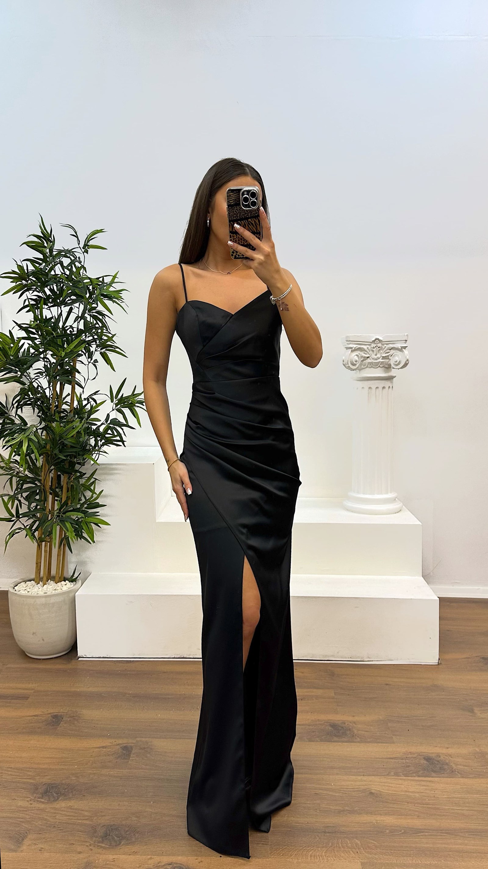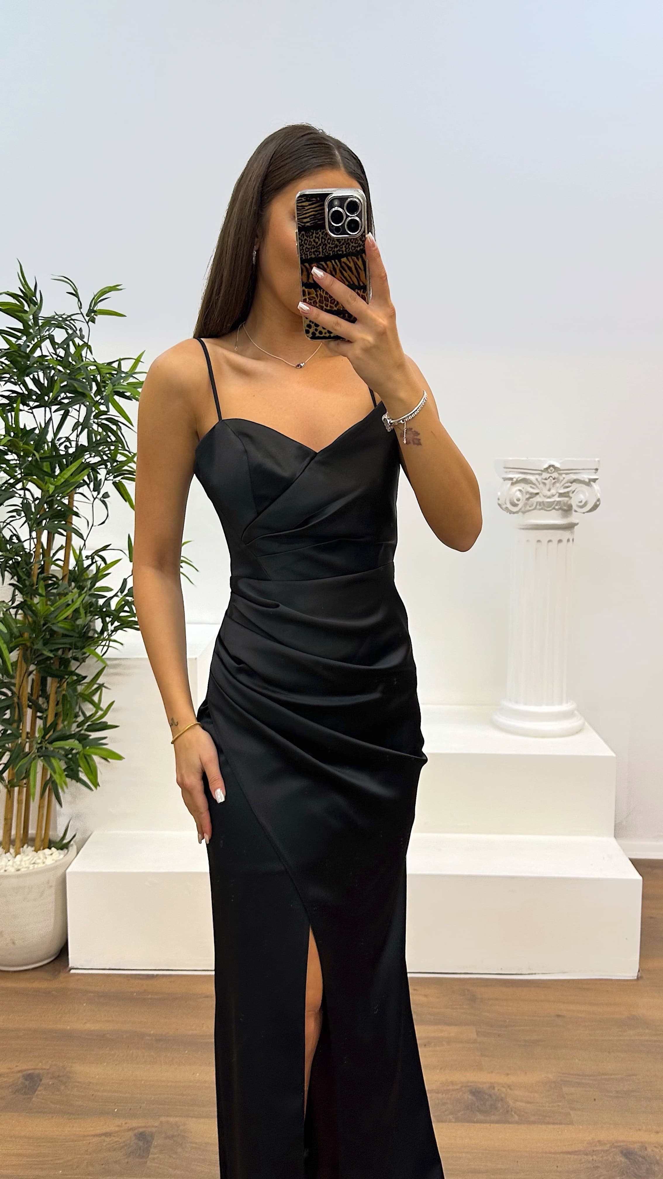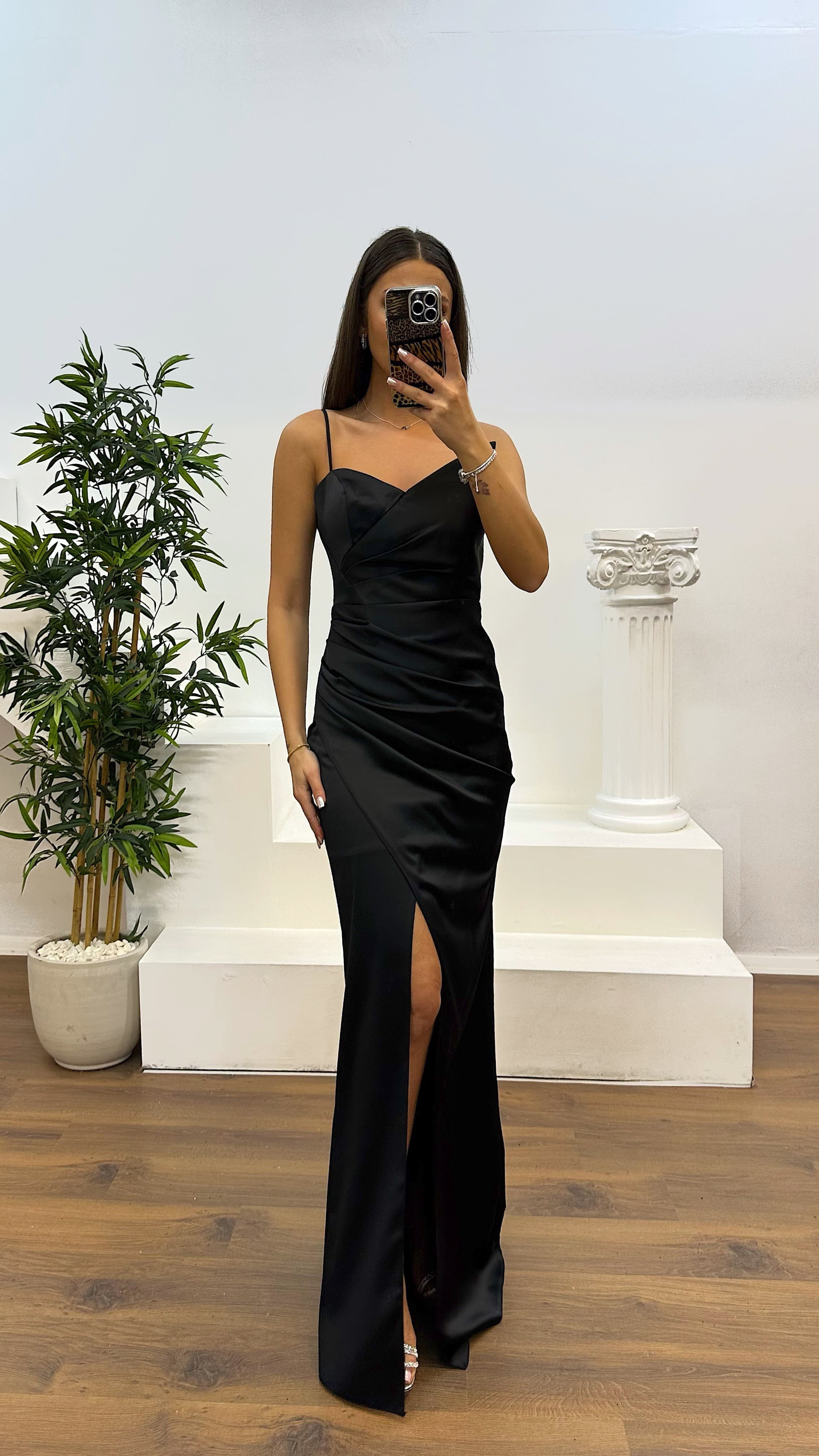 • Siyah İp Askılı Sırt Detay Abiye Elbise
