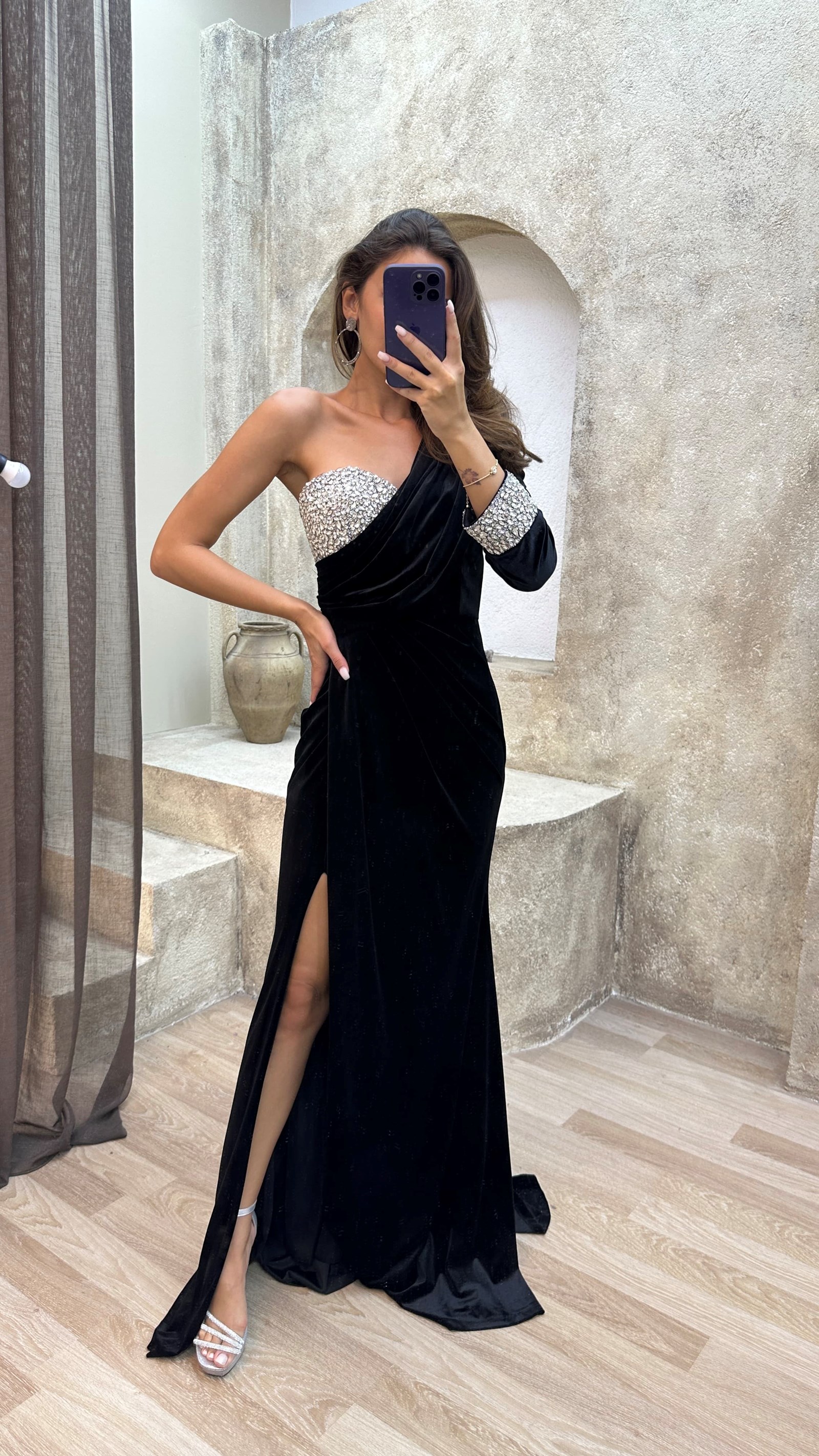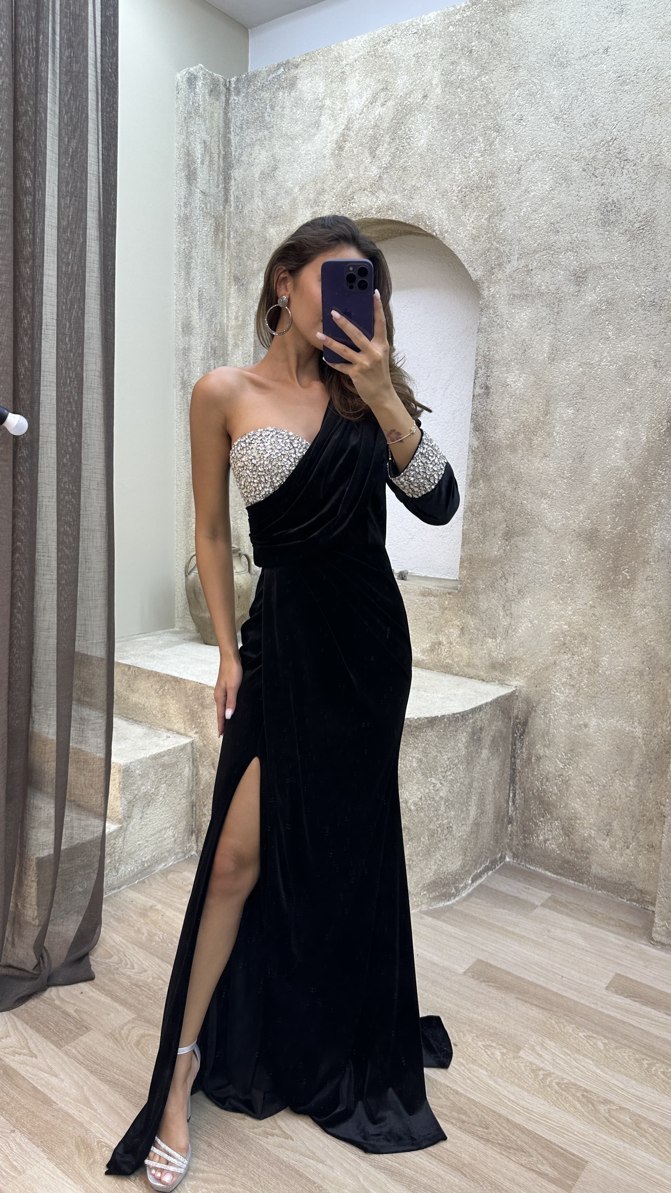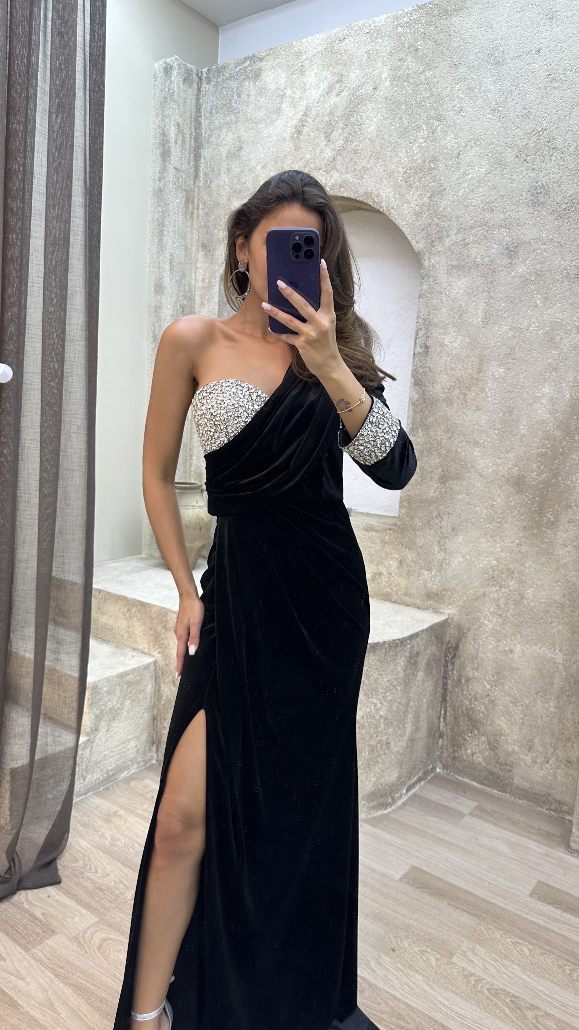 Siyah Tek Omuz Göğsü İşlemeli Elbise