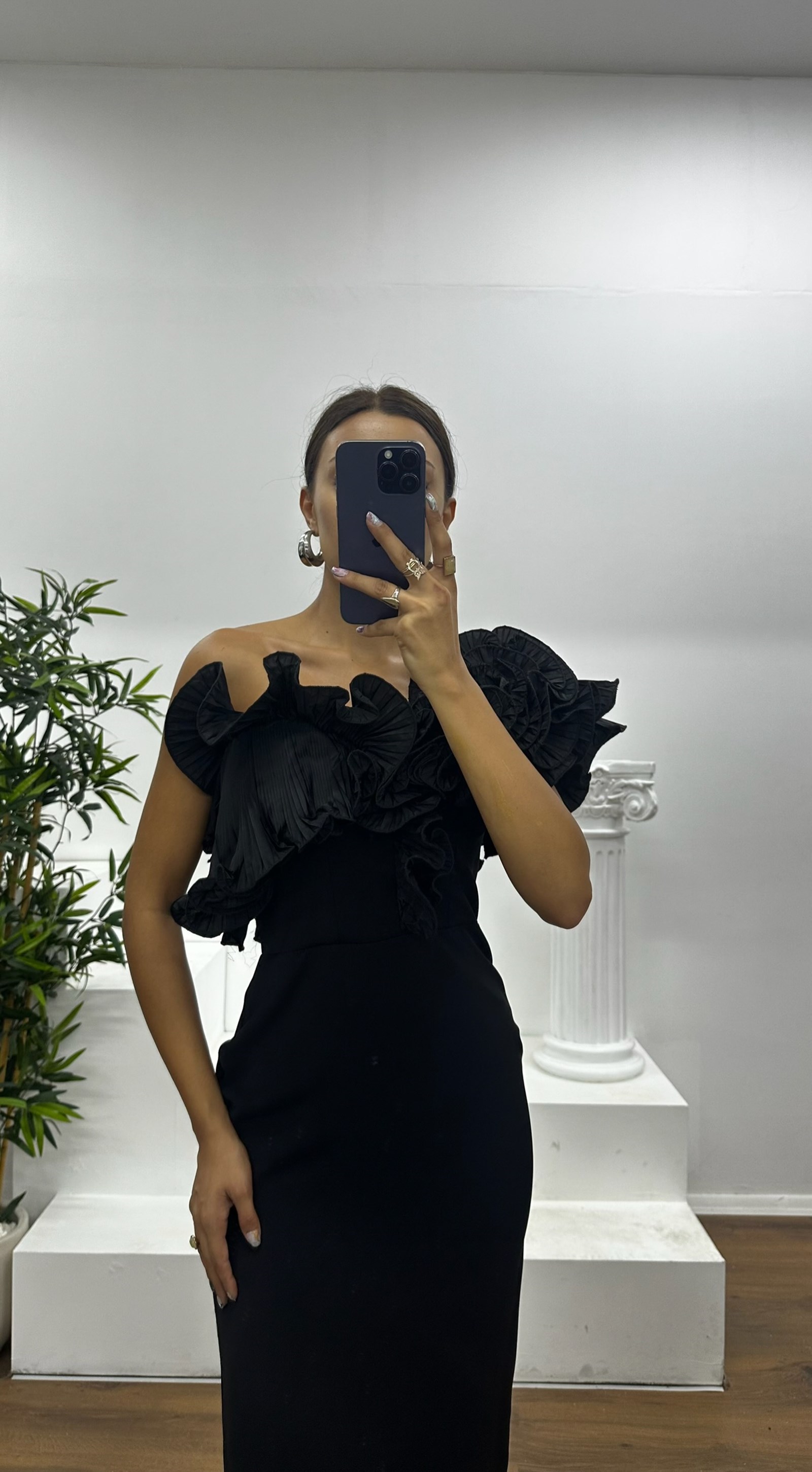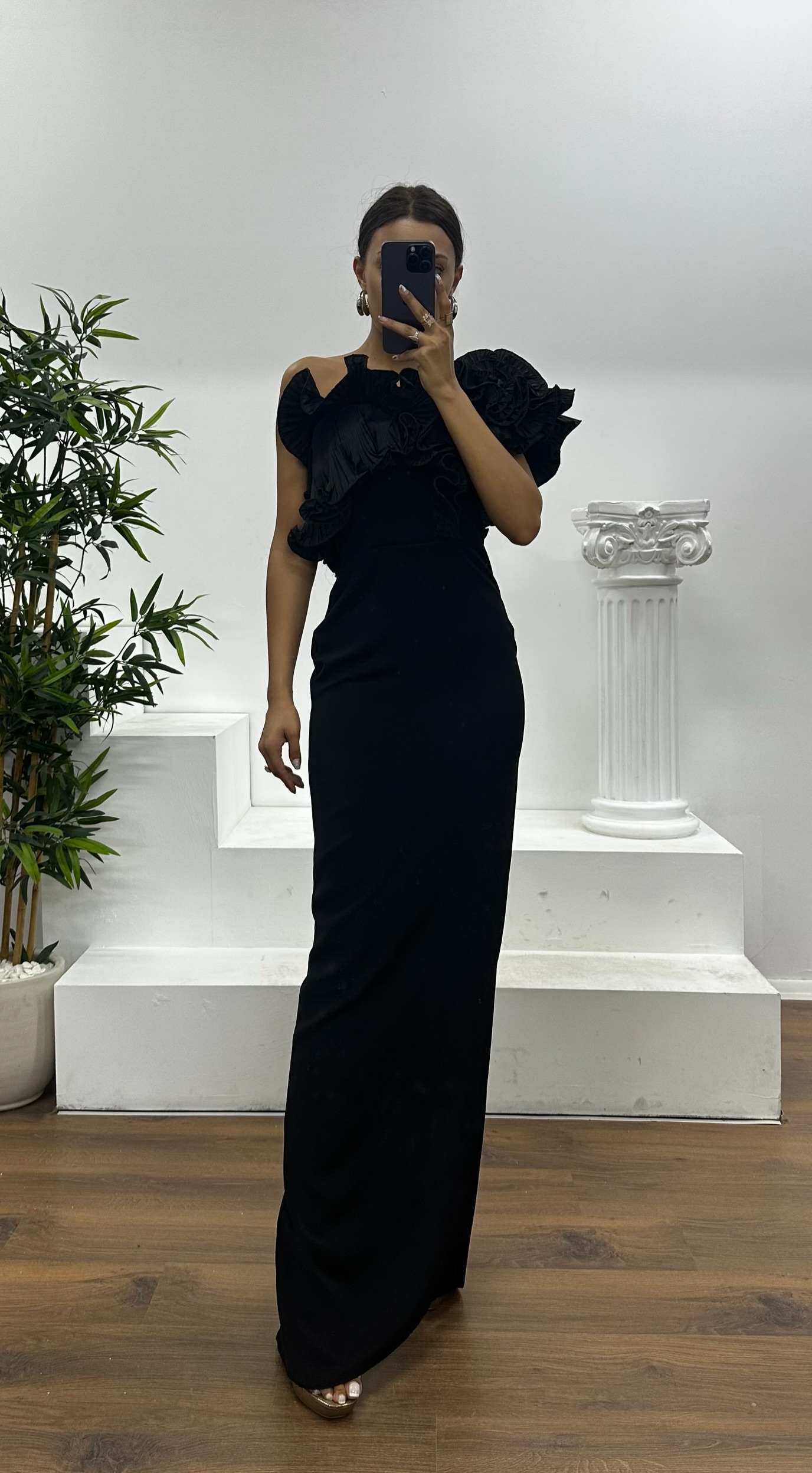 • Siyah Tek Omuz Volanlı Abiye Elbise