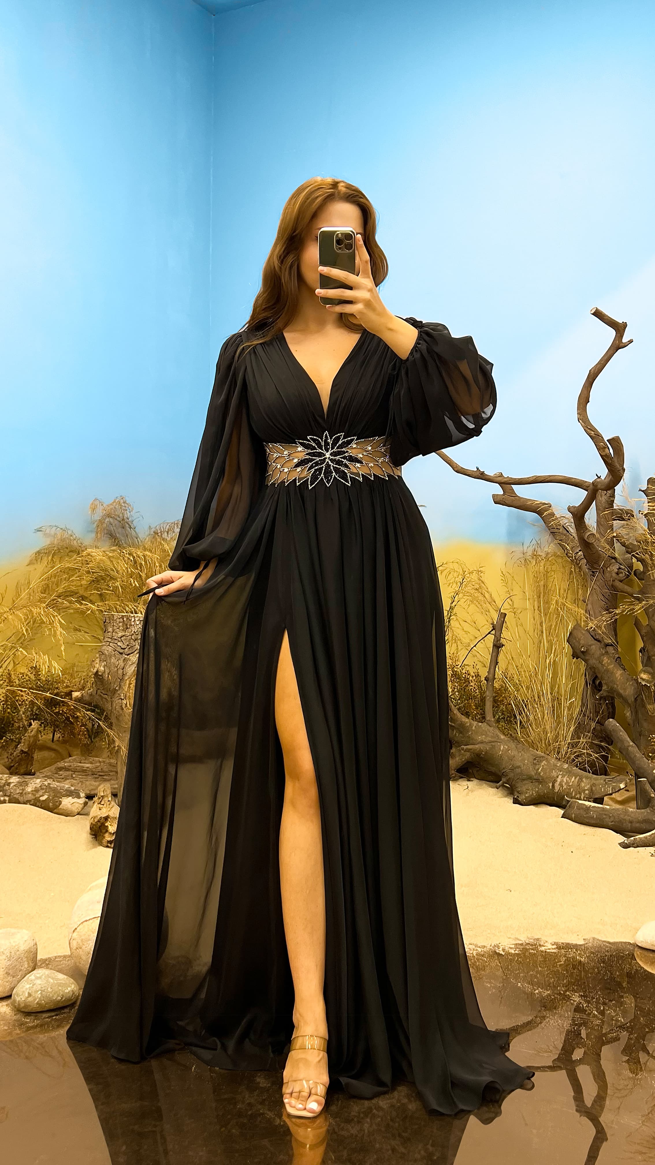 • Siyah V Yaka Bel İşleme Detay Büyük Beden Abiye Elbise