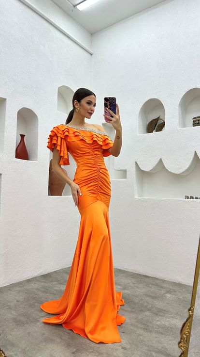 • Turuncu Göğsü Taşlı Volanlı Büzgülü Abiye Elbise