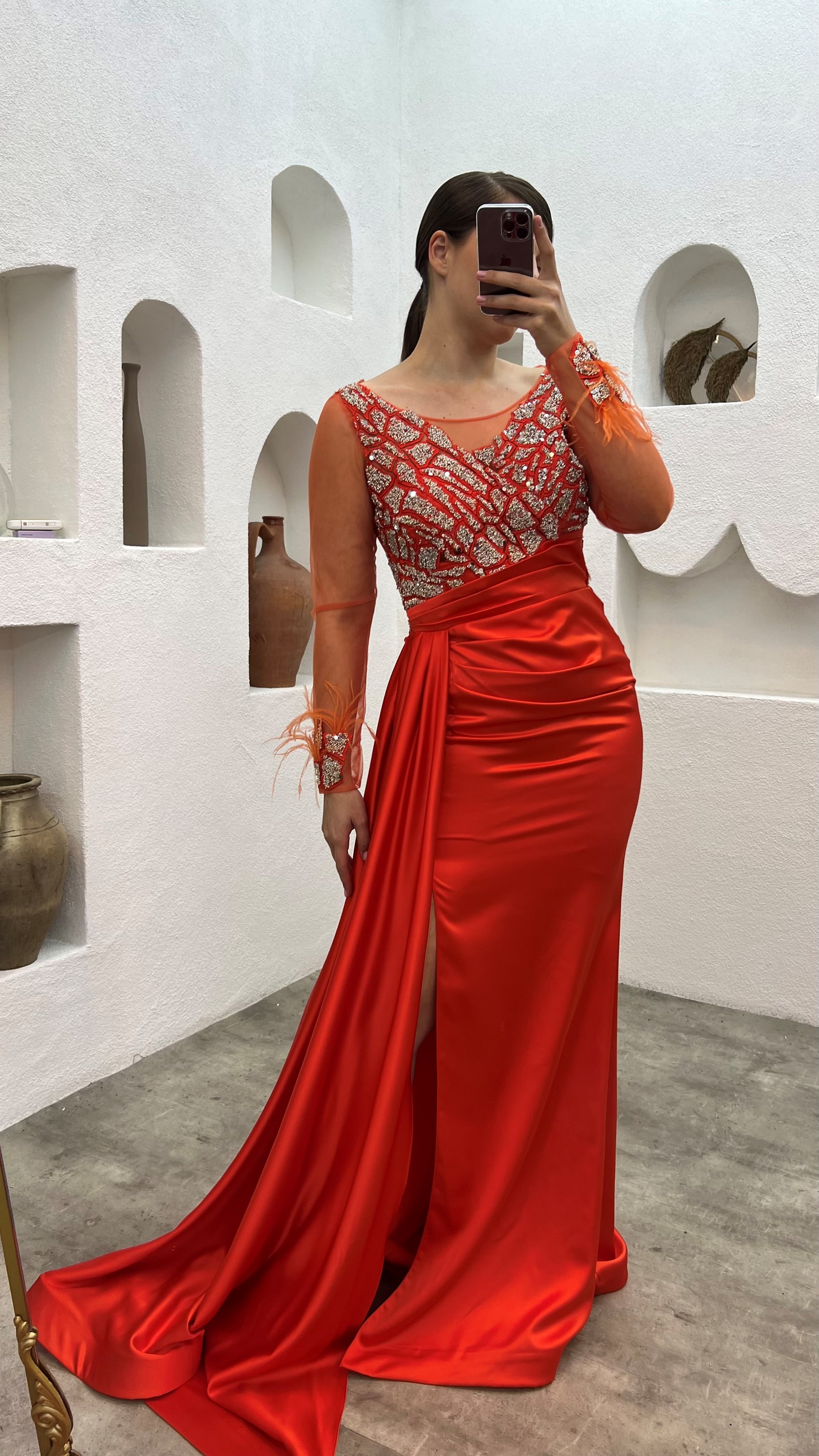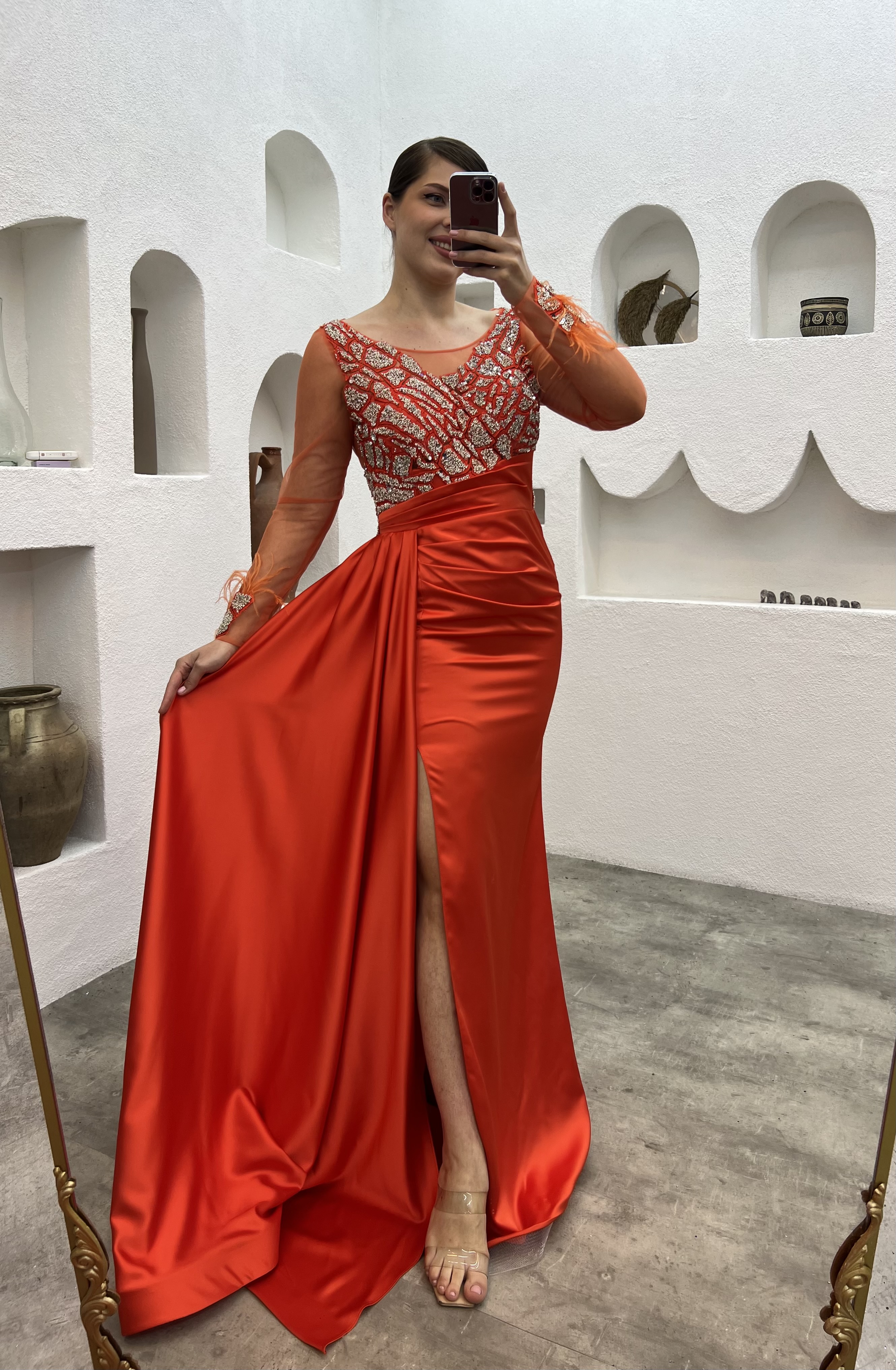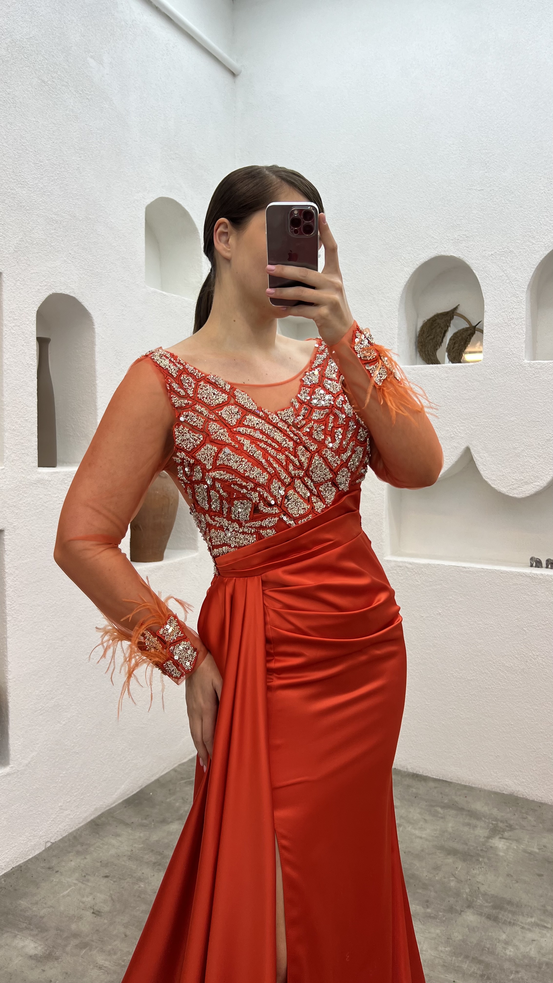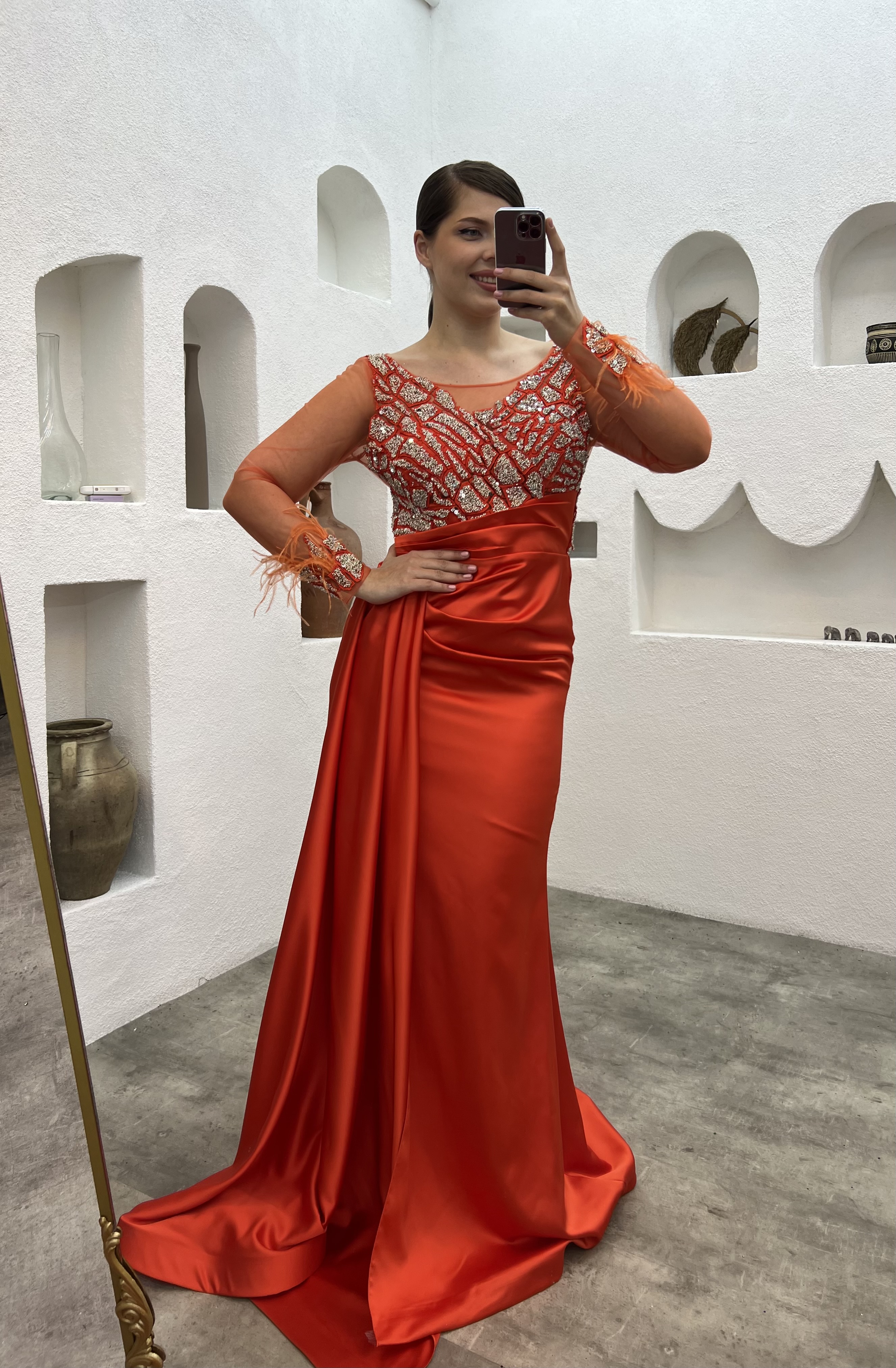 • Turuncu Kolları Tüylü Göğsü İşlemeli Büyük Beden Abiye Elbise