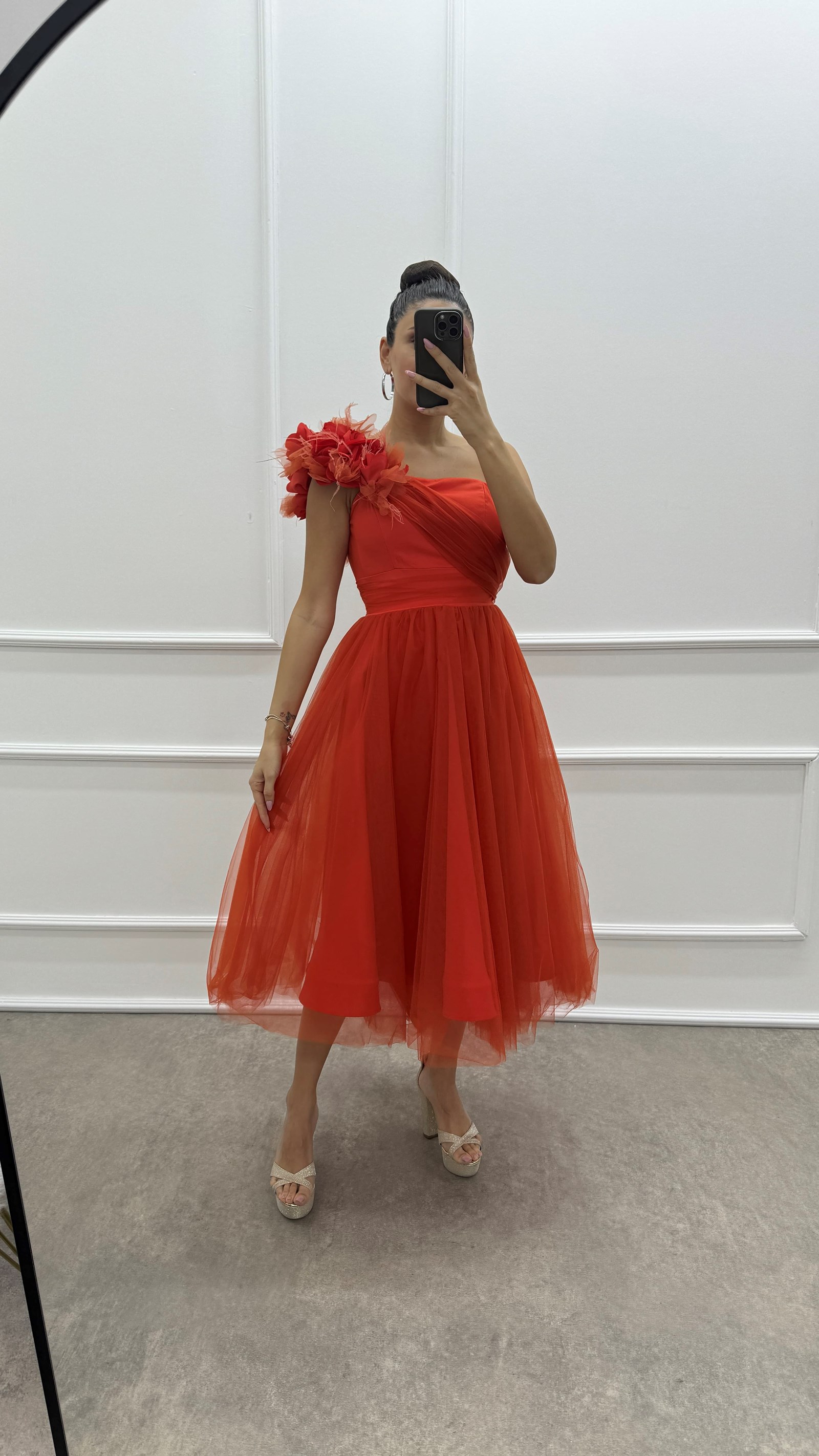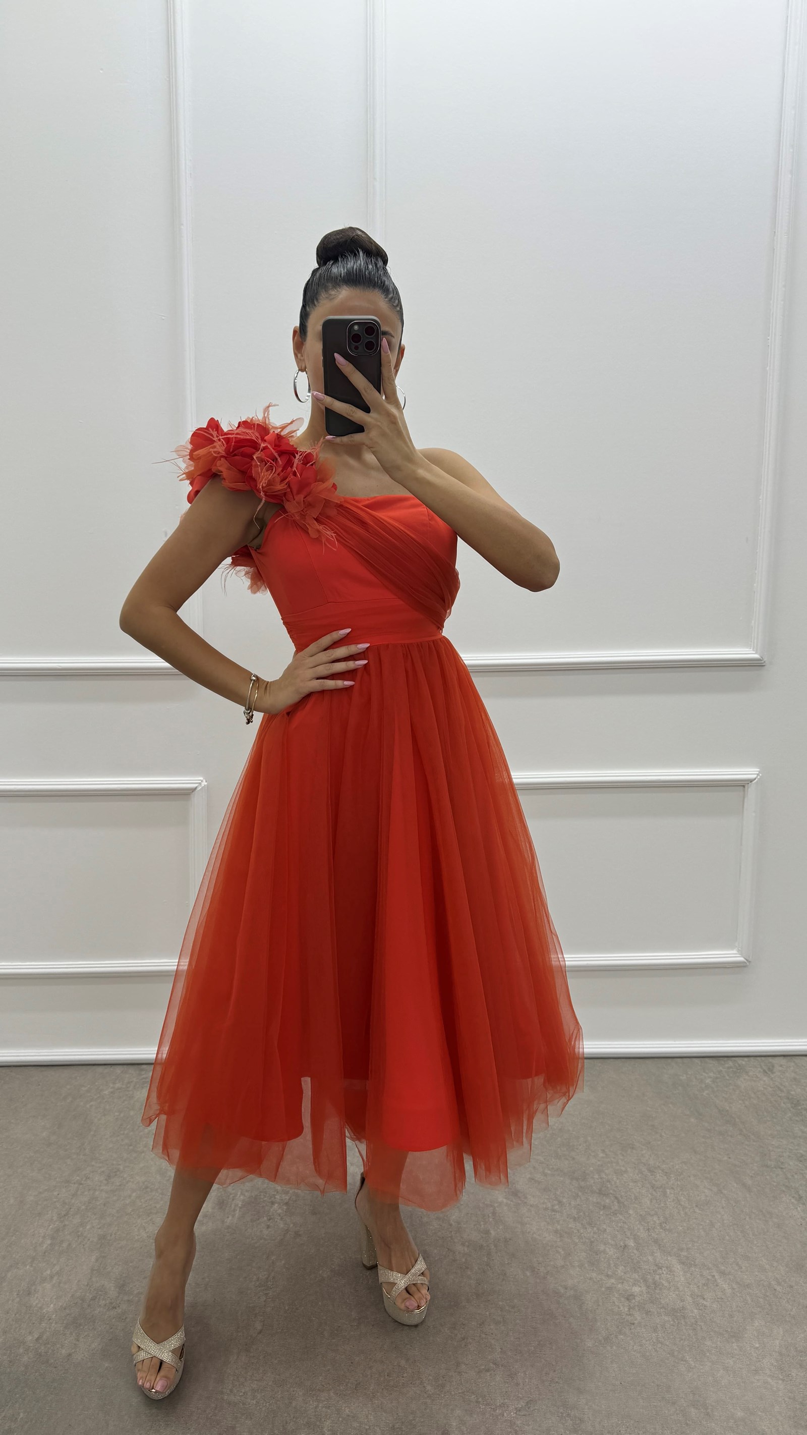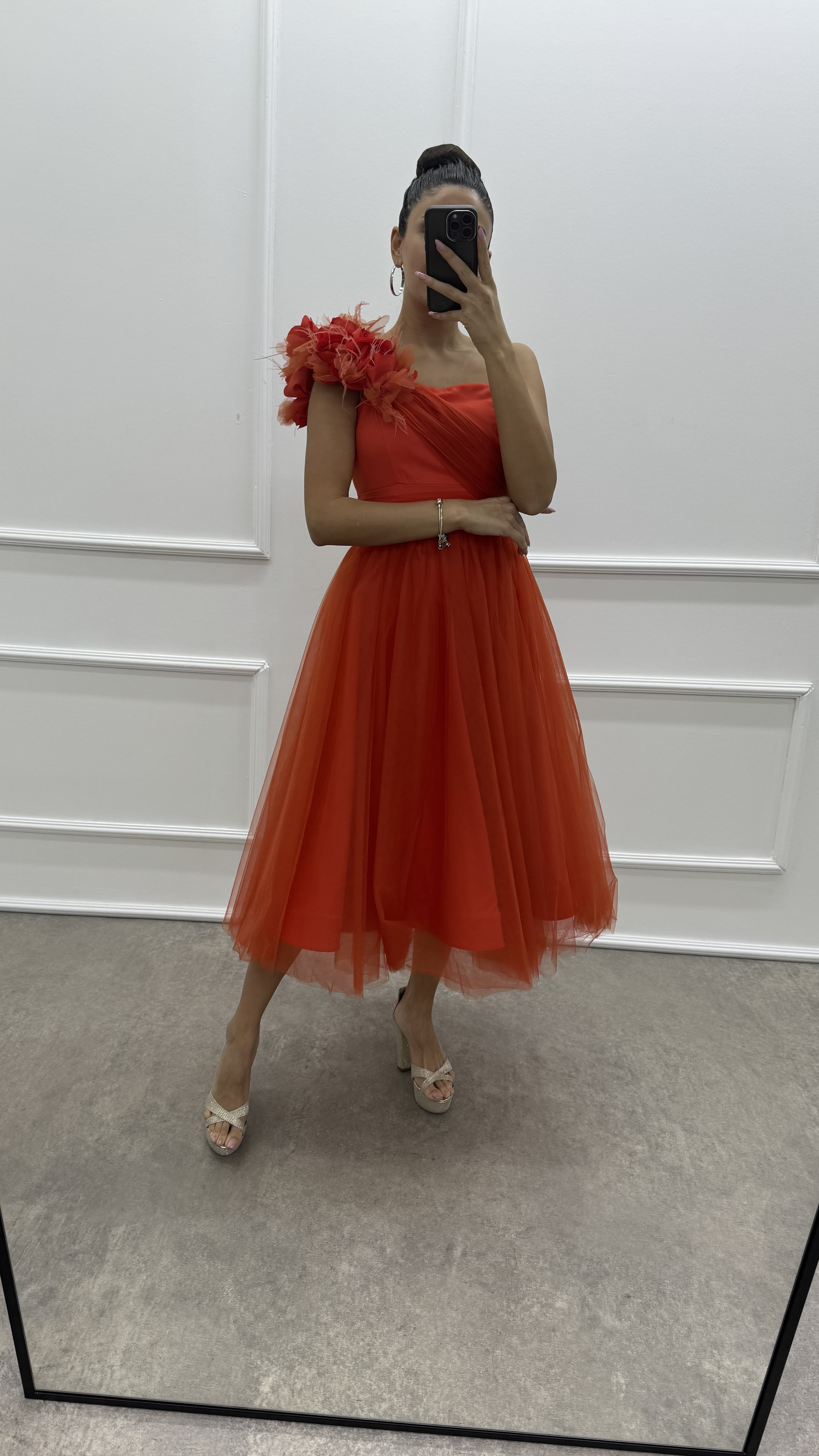 • Turuncu Omuzu Çiçek Detay Tasarım Tül Elbise