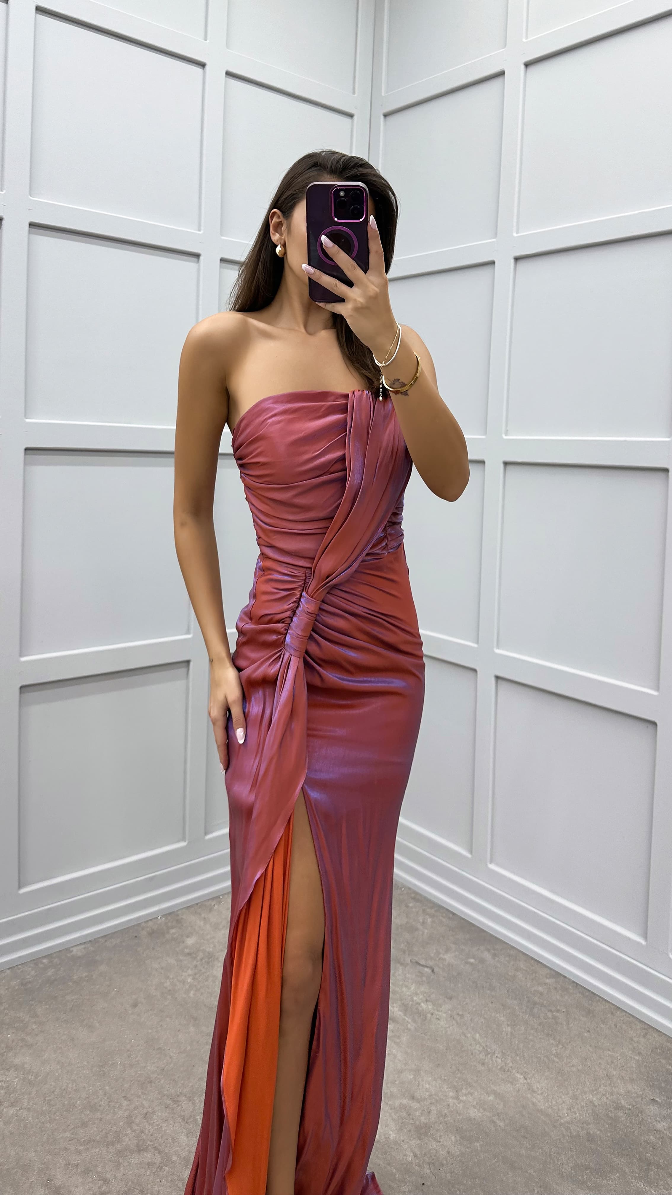 • Turuncu Straplez Bel Detay Tasarım Abiye